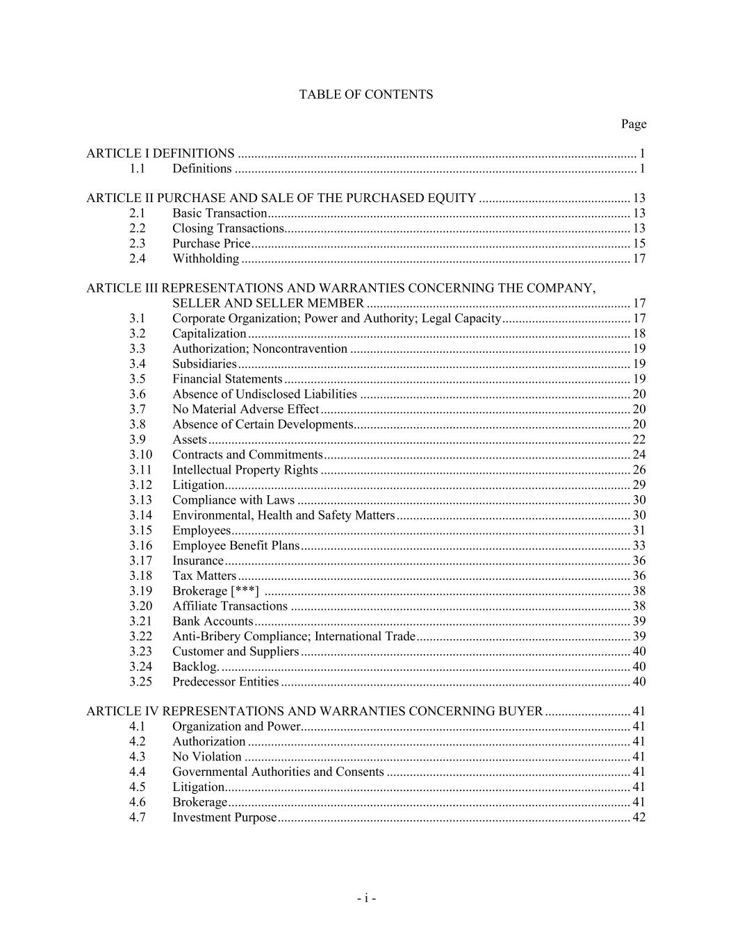 - i - TABLE OF CONTENTS Page ARTICLE I DEFINITIONS ......................................................................................................................... 1 1.1 Definitions .......................................................................................................................... 1 ARTICLE II PURCHASE AND SALE OF THE PURCHASED EQUITY .............................................. 13 2.1 Basic Transaction .............................................................................................................. 13 2.2 Closing Transactions ......................................................................................................... 13 2.3 Purchase Price ................................................................................................................... 15 2.4 Withholding ...................................................................................................................... 17 ARTICLE III REPRESENTATIONS AND WARRANTIES CONCERNING THE COMPANY, SELLER AND SELLER MEMBER ................................................................................ 17 3.1 Corporate Organization; Power and Authority; Legal Capacity ....................................... 17 3.2 Capitalization .................................................................................................................... 18 3.3 Authorization; Noncontravention ..................................................................................... 19 3.4 Subsidiaries ....................................................................................................................... 19 3.5 Financial Statements ......................................................................................................... 19 3.6 Absence of Undisclosed Liabilities .................................................................................. 20 3.7 No Material Adverse Effect .............................................................................................. 20 3.8 Absence of Certain Developments .................................................................................... 20 3.9 Assets ................................................................................................................................ 22 3.10 Contracts and Commitments ............................................................................................. 24 3.11 Intellectual Property Rights .............................................................................................. 26 3.12 Litigation ........................................................................................................................... 29 3.13 Compliance with Laws ..................................................................................................... 30 3.14 Environmental, Health and Safety Matters ....................................................................... 30 3.15 Employees ......................................................................................................................... 31 3.16 Employee Benefit Plans .................................................................................................... 33 3.17 Insurance ........................................................................................................................... 36 3.18 Tax Matters ....................................................................................................................... 36 3.19 Brokerage [***] ............................................................................................................... 38 3.20 Affiliate Transactions ....................................................................................................... 38 3.21 Bank Accounts .................................................................................................................. 39 3.22 Anti-Bribery Compliance; International Trade ................................................................. 39 3.23 Customer and Suppliers .................................................................................................... 40 3.24 Backlog. ............................................................................................................................ 40 3.25 Predecessor Entities .......................................................................................................... 40 ARTICLE IV REPRESENTATIONS AND WARRANTIES CONCERNING BUYER .......................... 41 4.1 Organization and Power .................................................................................................... 41 4.2 Authorization .................................................................................................................... 41 4.3 No Violation ..................................................................................................................... 41 4.4 Governmental Authorities and Consents .......................................................................... 41 4.5 Litigation ........................................................................................................................... 41 4.6 Brokerage .......................................................................................................................... 41 4.7 Investment Purpose ........................................................................................................... 42