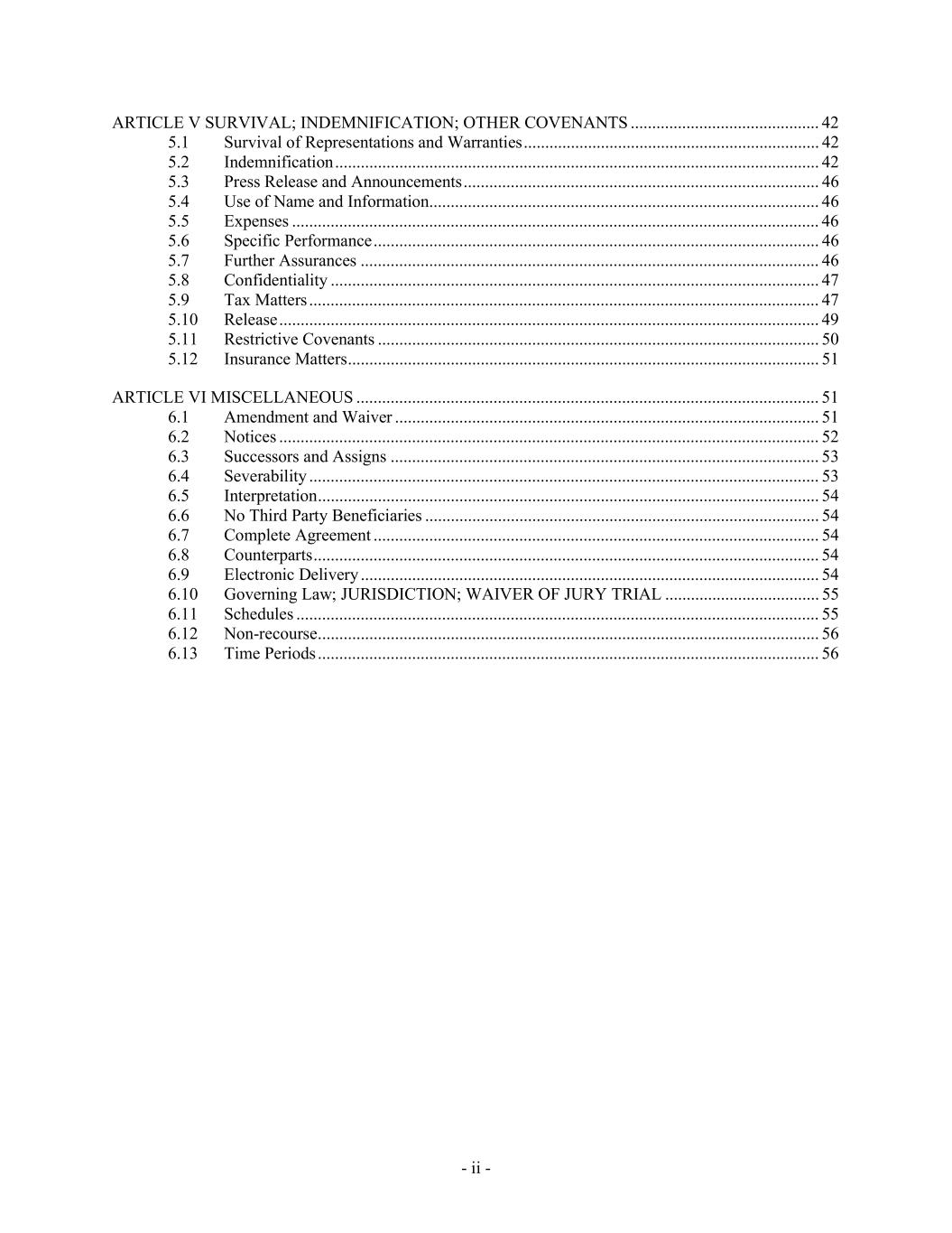 - ii - ARTICLE V SURVIVAL; INDEMNIFICATION; OTHER COVENANTS ............................................ 42 5.1 Survival of Representations and Warranties ..................................................................... 42 5.2 Indemnification ................................................................................................................. 42 5.3 Press Release and Announcements ................................................................................... 46 5.4 Use of Name and Information........................................................................................... 46 5.5 Expenses ........................................................................................................................... 46 5.6 Specific Performance ........................................................................................................ 46 5.7 Further Assurances ........................................................................................................... 46 5.8 Confidentiality .................................................................................................................. 47 5.9 Tax Matters ....................................................................................................................... 47 5.10 Release .............................................................................................................................. 49 5.11 Restrictive Covenants ....................................................................................................... 50 5.12 Insurance Matters .............................................................................................................. 51 ARTICLE VI MISCELLANEOUS ............................................................................................................ 51 6.1 Amendment and Waiver ................................................................................................... 51 6.2 Notices .............................................................................................................................. 52 6.3 Successors and Assigns .................................................................................................... 53 6.4 Severability ....................................................................................................................... 53 6.5 Interpretation ..................................................................................................................... 54 6.6 No Third Party Beneficiaries ............................................................................................ 54 6.7 Complete Agreement ........................................................................................................ 54 6.8 Counterparts ...................................................................................................................... 54 6.9 Electronic Delivery ........................................................................................................... 54 6.10 Governing Law; JURISDICTION; WAIVER OF JURY TRIAL .................................... 55 6.11 Schedules .......................................................................................................................... 55 6.12 Non-recourse ..................................................................................................................... 56 6.13 Time Periods ..................................................................................................................... 56