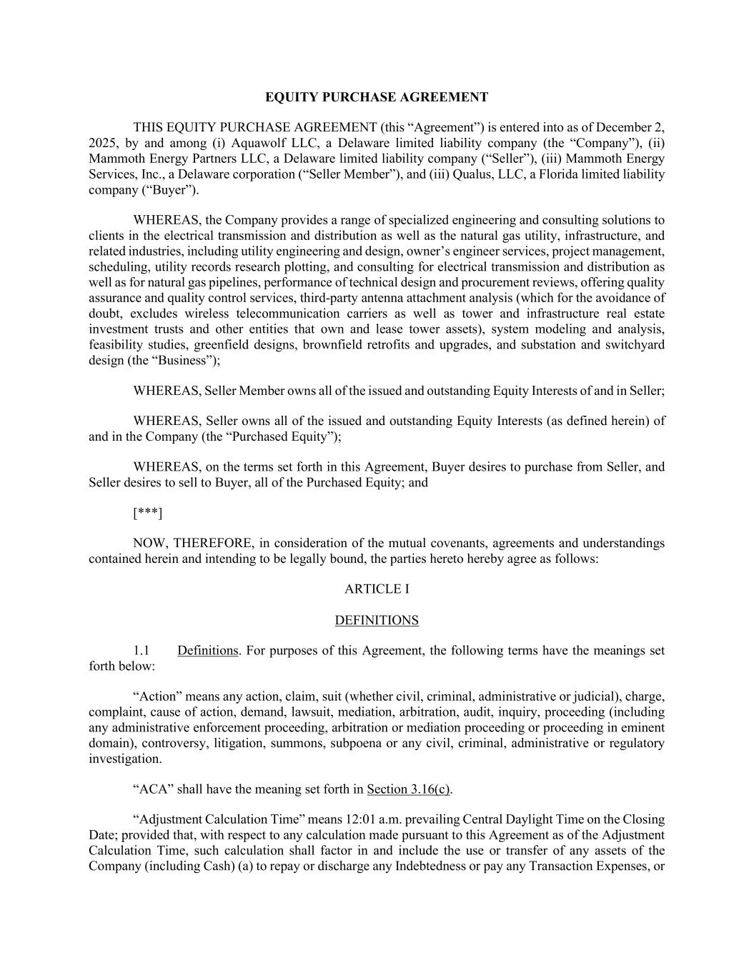 EQUITY PURCHASE AGREEMENT THIS EQUITY PURCHASE AGREEMENT (this “Agreement”) is entered into as of December 2, 2025, by and among (i) Aquawolf LLC, a Delaware limited liability company (the “Company”), (ii) Mammoth Energy Partners LLC, a Delaware limited liability company (“Seller”), (iii) Mammoth Energy Services, Inc., a Delaware corporation (“Seller Member”), and (iii) Qualus, LLC, a Florida limited liability company (“Buyer”). WHEREAS, the Company provides a range of specialized engineering and consulting solutions to clients in the electrical transmission and distribution as well as the natural gas utility, infrastructure, and related industries, including utility engineering and design, owner’s engineer services, project management, scheduling, utility records research plotting, and consulting for electrical transmission and distribution as well as for natural gas pipelines, performance of technical design and procurement reviews, offering quality assurance and quality control services, third-party antenna attachment analysis (which for the avoidance of doubt, excludes wireless telecommunication carriers as well as tower and infrastructure real estate investment trusts and other entities that own and lease tower assets), system modeling and analysis, feasibility studies, greenfield designs, brownfield retrofits and upgrades, and substation and switchyard design (the “Business”); WHEREAS, Seller Member owns all of the issued and outstanding Equity Interests of and in Seller; WHEREAS, Seller owns all of the issued and outstanding Equity Interests (as defined herein) of and in the Company (the “Purchased Equity”); WHEREAS, on the terms set forth in this Agreement, Buyer desires to purchase from Seller, and Seller desires to sell to Buyer, all of the Purchased Equity; and [***] NOW, THEREFORE, in consideration of the mutual covenants, agreements and understandings contained herein and intending to be legally bound, the parties hereto hereby agree as follows: ARTICLE I DEFINITIONS 1.1 Definitions. For purposes of this Agreement, the following terms have the meanings set forth below: “Action” means any action, claim, suit (whether civil, criminal, administrative or judicial), charge, complaint, cause of action, demand, lawsuit, mediation, arbitration, audit, inquiry, proceeding (including any administrative enforcement proceeding, arbitration or mediation proceeding or proceeding in eminent domain), controversy, litigation, summons, subpoena or any civil, criminal, administrative or regulatory investigation. “ACA” shall have the meaning set forth in Section 3.16(c). “Adjustment Calculation Time” means 12:01 a.m. prevailing Central Daylight Time on the Closing Date; provided that, with respect to any calculation made pursuant to this Agreement as of the Adjustment Calculation Time, such calculation shall factor in and include the use or transfer of any assets of the Company (including Cash) (a) to repay or discharge any Indebtedness or pay any Transaction Expenses, or