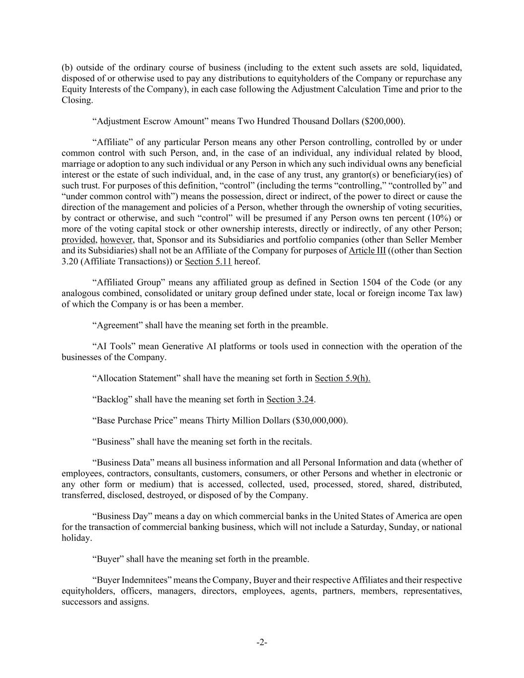 -2- (b) outside of the ordinary course of business (including to the extent such assets are sold, liquidated, disposed of or otherwise used to pay any distributions to equityholders of the Company or repurchase any Equity Interests of the Company), in each case following the Adjustment Calculation Time and prior to the Closing. “Adjustment Escrow Amount” means Two Hundred Thousand Dollars ($200,000). “Affiliate” of any particular Person means any other Person controlling, controlled by or under common control with such Person, and, in the case of an individual, any individual related by blood, marriage or adoption to any such individual or any Person in which any such individual owns any beneficial interest or the estate of such individual, and, in the case of any trust, any grantor(s) or beneficiary(ies) of such trust. For purposes of this definition, “control” (including the terms “controlling,” “controlled by” and “under common control with”) means the possession, direct or indirect, of the power to direct or cause the direction of the management and policies of a Person, whether through the ownership of voting securities, by contract or otherwise, and such “control” will be presumed if any Person owns ten percent (10%) or more of the voting capital stock or other ownership interests, directly or indirectly, of any other Person; provided, however, that, Sponsor and its Subsidiaries and portfolio companies (other than Seller Member and its Subsidiaries) shall not be an Affiliate of the Company for purposes of Article III ((other than Section 3.20 (Affiliate Transactions)) or Section 5.11 hereof. “Affiliated Group” means any affiliated group as defined in Section 1504 of the Code (or any analogous combined, consolidated or unitary group defined under state, local or foreign income Tax law) of which the Company is or has been a member. “Agreement” shall have the meaning set forth in the preamble. “AI Tools” mean Generative AI platforms or tools used in connection with the operation of the businesses of the Company. “Allocation Statement” shall have the meaning set forth in Section 5.9(h). “Backlog” shall have the meaning set forth in Section 3.24. “Base Purchase Price” means Thirty Million Dollars ($30,000,000). “Business” shall have the meaning set forth in the recitals. “Business Data” means all business information and all Personal Information and data (whether of employees, contractors, consultants, customers, consumers, or other Persons and whether in electronic or any other form or medium) that is accessed, collected, used, processed, stored, shared, distributed, transferred, disclosed, destroyed, or disposed of by the Company. “Business Day” means a day on which commercial banks in the United States of America are open for the transaction of commercial banking business, which will not include a Saturday, Sunday, or national holiday. “Buyer” shall have the meaning set forth in the preamble. “Buyer Indemnitees” means the Company, Buyer and their respective Affiliates and their respective equityholders, officers, managers, directors, employees, agents, partners, members, representatives, successors and assigns.