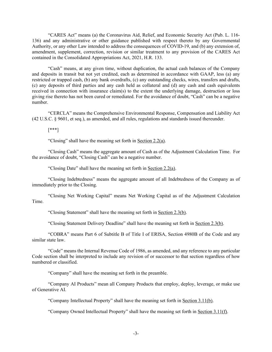 -3- “CARES Act” means (a) the Coronavirus Aid, Relief, and Economic Security Act (Pub. L. 116- 136) and any administrative or other guidance published with respect thereto by any Governmental Authority, or any other Law intended to address the consequences of COVID-19, and (b) any extension of, amendment, supplement, correction, revision or similar treatment to any provision of the CARES Act contained in the Consolidated Appropriations Act, 2021, H.R. 133. “Cash” means, at any given time, without duplication, the actual cash balances of the Company and deposits in transit but not yet credited, each as determined in accordance with GAAP, less (a) any restricted or trapped cash, (b) any bank overdrafts, (c) any outstanding checks, wires, transfers and drafts, (c) any deposits of third parties and any cash held as collateral and (d) any cash and cash equivalents received in connection with insurance claim(s) to the extent the underlying damage, destruction or loss giving rise thereto has not been cured or remediated. For the avoidance of doubt, “Cash” can be a negative number. “CERCLA” means the Comprehensive Environmental Response, Compensation and Liability Act (42 U.S.C. § 9601, et seq.), as amended, and all rules, regulations and standards issued thereunder. [***] “Closing” shall have the meaning set forth in Section 2.2(a). “Closing Cash” means the aggregate amount of Cash as of the Adjustment Calculation Time. For the avoidance of doubt, “Closing Cash” can be a negative number. “Closing Date” shall have the meaning set forth in Section 2.2(a). “Closing Indebtedness” means the aggregate amount of all Indebtedness of the Company as of immediately prior to the Closing. “Closing Net Working Capital” means Net Working Capital as of the Adjustment Calculation Time. “Closing Statement” shall have the meaning set forth in Section 2.3(b). “Closing Statement Delivery Deadline” shall have the meaning set forth in Section 2.3(b). “COBRA” means Part 6 of Subtitle B of Title I of ERISA, Section 4980B of the Code and any similar state law. “Code” means the Internal Revenue Code of 1986, as amended, and any reference to any particular Code section shall be interpreted to include any revision of or successor to that section regardless of how numbered or classified. “Company” shall have the meaning set forth in the preamble. “Company AI Products” mean all Company Products that employ, deploy, leverage, or make use of Generative AI. “Company Intellectual Property” shall have the meaning set forth in Section 3.11(b). “Company Owned Intellectual Property” shall have the meaning set forth in Section 3.11(f).