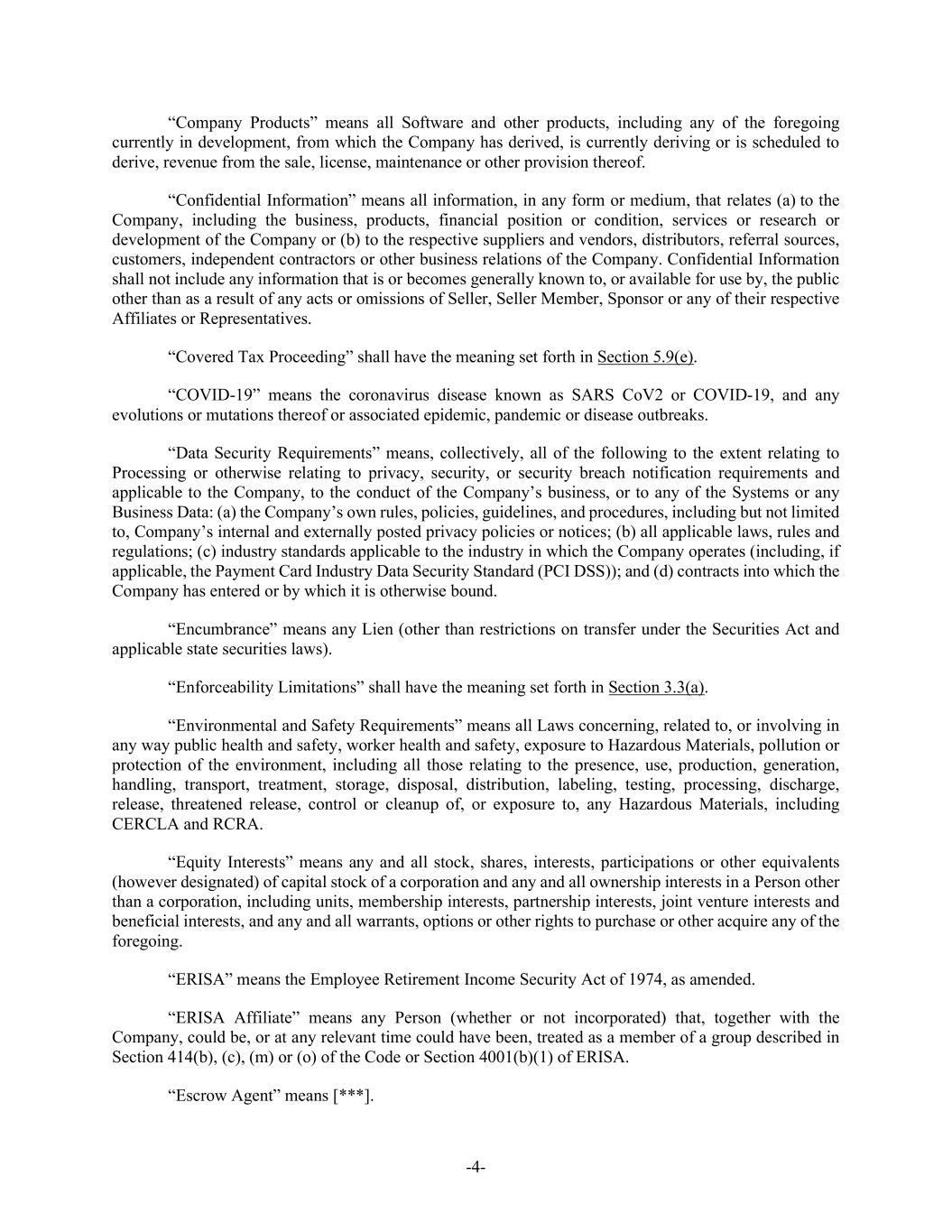 -4- “Company Products” means all Software and other products, including any of the foregoing currently in development, from which the Company has derived, is currently deriving or is scheduled to derive, revenue from the sale, license, maintenance or other provision thereof. “Confidential Information” means all information, in any form or medium, that relates (a) to the Company, including the business, products, financial position or condition, services or research or development of the Company or (b) to the respective suppliers and vendors, distributors, referral sources, customers, independent contractors or other business relations of the Company. Confidential Information shall not include any information that is or becomes generally known to, or available for use by, the public other than as a result of any acts or omissions of Seller, Seller Member, Sponsor or any of their respective Affiliates or Representatives. “Covered Tax Proceeding” shall have the meaning set forth in Section 5.9(e). “COVID-19” means the coronavirus disease known as SARS CoV2 or COVID-19, and any evolutions or mutations thereof or associated epidemic, pandemic or disease outbreaks. “Data Security Requirements” means, collectively, all of the following to the extent relating to Processing or otherwise relating to privacy, security, or security breach notification requirements and applicable to the Company, to the conduct of the Company’s business, or to any of the Systems or any Business Data: (a) the Company’s own rules, policies, guidelines, and procedures, including but not limited to, Company’s internal and externally posted privacy policies or notices; (b) all applicable laws, rules and regulations; (c) industry standards applicable to the industry in which the Company operates (including, if applicable, the Payment Card Industry Data Security Standard (PCI DSS)); and (d) contracts into which the Company has entered or by which it is otherwise bound. “Encumbrance” means any Lien (other than restrictions on transfer under the Securities Act and applicable state securities laws). “Enforceability Limitations” shall have the meaning set forth in Section 3.3(a). “Environmental and Safety Requirements” means all Laws concerning, related to, or involving in any way public health and safety, worker health and safety, exposure to Hazardous Materials, pollution or protection of the environment, including all those relating to the presence, use, production, generation, handling, transport, treatment, storage, disposal, distribution, labeling, testing, processing, discharge, release, threatened release, control or cleanup of, or exposure to, any Hazardous Materials, including CERCLA and RCRA. “Equity Interests” means any and all stock, shares, interests, participations or other equivalents (however designated) of capital stock of a corporation and any and all ownership interests in a Person other than a corporation, including units, membership interests, partnership interests, joint venture interests and beneficial interests, and any and all warrants, options or other rights to purchase or other acquire any of the foregoing. “ERISA” means the Employee Retirement Income Security Act of 1974, as amended. “ERISA Affiliate” means any Person (whether or not incorporated) that, together with the Company, could be, or at any relevant time could have been, treated as a member of a group described in Section 414(b), (c), (m) or (o) of the Code or Section 4001(b)(1) of ERISA. “Escrow Agent” means [***].