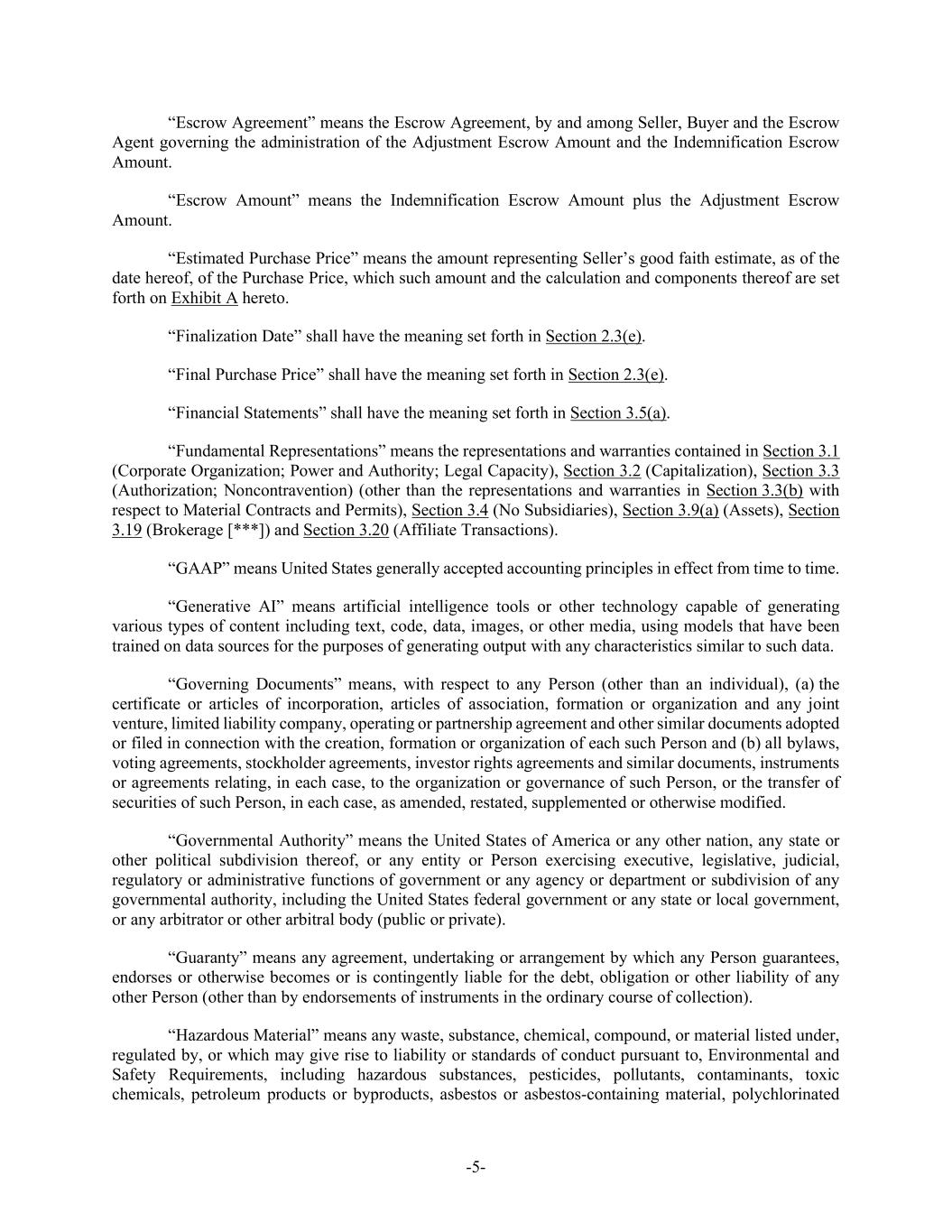 -5- “Escrow Agreement” means the Escrow Agreement, by and among Seller, Buyer and the Escrow Agent governing the administration of the Adjustment Escrow Amount and the Indemnification Escrow Amount. “Escrow Amount” means the Indemnification Escrow Amount plus the Adjustment Escrow Amount. “Estimated Purchase Price” means the amount representing Seller’s good faith estimate, as of the date hereof, of the Purchase Price, which such amount and the calculation and components thereof are set forth on Exhibit A hereto. “Finalization Date” shall have the meaning set forth in Section 2.3(e). “Final Purchase Price” shall have the meaning set forth in Section 2.3(e). “Financial Statements” shall have the meaning set forth in Section 3.5(a). “Fundamental Representations” means the representations and warranties contained in Section 3.1 (Corporate Organization; Power and Authority; Legal Capacity), Section 3.2 (Capitalization), Section 3.3 (Authorization; Noncontravention) (other than the representations and warranties in Section 3.3(b) with respect to Material Contracts and Permits), Section 3.4 (No Subsidiaries), Section 3.9(a) (Assets), Section 3.19 (Brokerage [***]) and Section 3.20 (Affiliate Transactions). “GAAP” means United States generally accepted accounting principles in effect from time to time. “Generative AI” means artificial intelligence tools or other technology capable of generating various types of content including text, code, data, images, or other media, using models that have been trained on data sources for the purposes of generating output with any characteristics similar to such data. “Governing Documents” means, with respect to any Person (other than an individual), (a) the certificate or articles of incorporation, articles of association, formation or organization and any joint venture, limited liability company, operating or partnership agreement and other similar documents adopted or filed in connection with the creation, formation or organization of each such Person and (b) all bylaws, voting agreements, stockholder agreements, investor rights agreements and similar documents, instruments or agreements relating, in each case, to the organization or governance of such Person, or the transfer of securities of such Person, in each case, as amended, restated, supplemented or otherwise modified. “Governmental Authority” means the United States of America or any other nation, any state or other political subdivision thereof, or any entity or Person exercising executive, legislative, judicial, regulatory or administrative functions of government or any agency or department or subdivision of any governmental authority, including the United States federal government or any state or local government, or any arbitrator or other arbitral body (public or private). “Guaranty” means any agreement, undertaking or arrangement by which any Person guarantees, endorses or otherwise becomes or is contingently liable for the debt, obligation or other liability of any other Person (other than by endorsements of instruments in the ordinary course of collection). “Hazardous Material” means any waste, substance, chemical, compound, or material listed under, regulated by, or which may give rise to liability or standards of conduct pursuant to, Environmental and Safety Requirements, including hazardous substances, pesticides, pollutants, contaminants, toxic chemicals, petroleum products or byproducts, asbestos or asbestos-containing material, polychlorinated