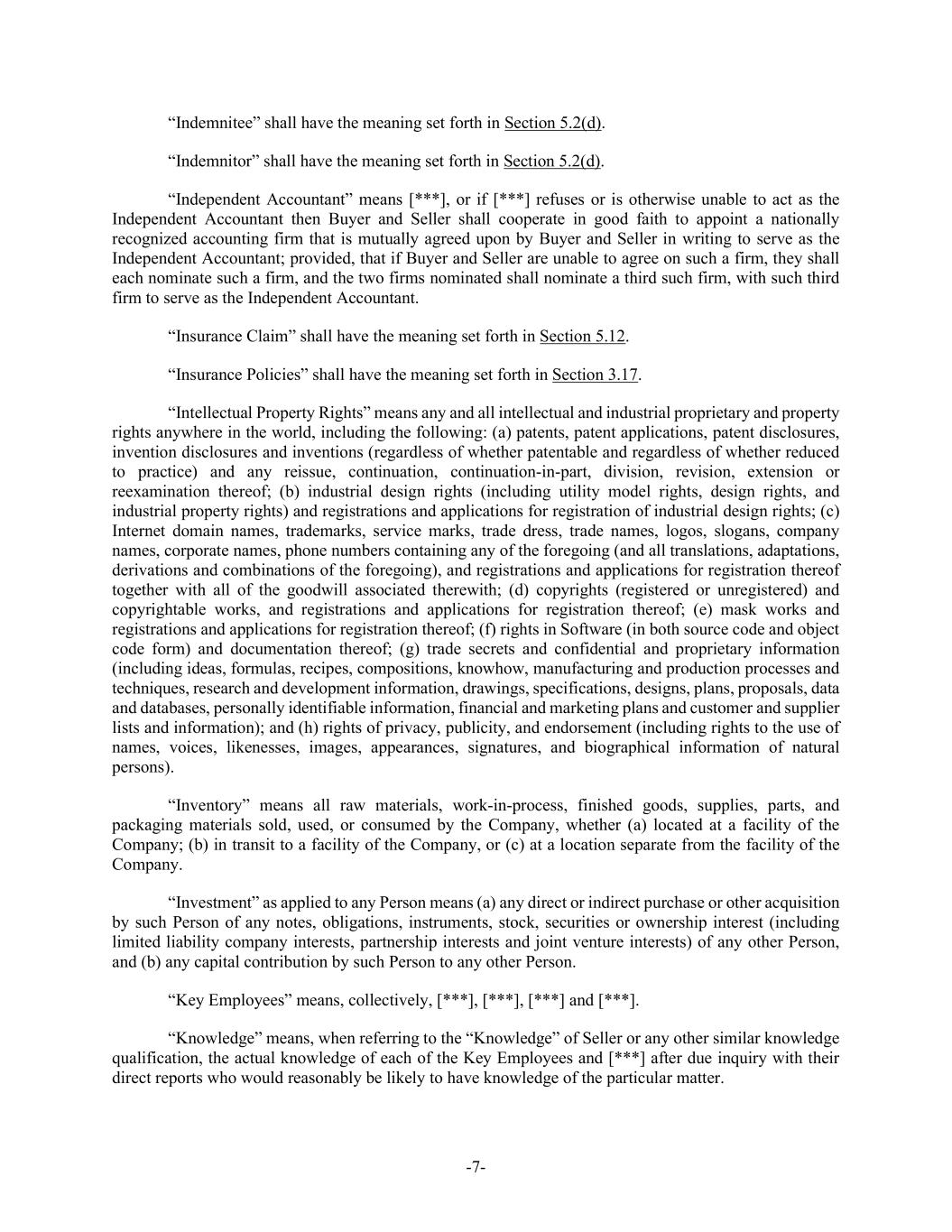 -7- “Indemnitee” shall have the meaning set forth in Section 5.2(d). “Indemnitor” shall have the meaning set forth in Section 5.2(d). “Independent Accountant” means [***], or if [***] refuses or is otherwise unable to act as the Independent Accountant then Buyer and Seller shall cooperate in good faith to appoint a nationally recognized accounting firm that is mutually agreed upon by Buyer and Seller in writing to serve as the Independent Accountant; provided, that if Buyer and Seller are unable to agree on such a firm, they shall each nominate such a firm, and the two firms nominated shall nominate a third such firm, with such third firm to serve as the Independent Accountant. “Insurance Claim” shall have the meaning set forth in Section 5.12. “Insurance Policies” shall have the meaning set forth in Section 3.17. “Intellectual Property Rights” means any and all intellectual and industrial proprietary and property rights anywhere in the world, including the following: (a) patents, patent applications, patent disclosures, invention disclosures and inventions (regardless of whether patentable and regardless of whether reduced to practice) and any reissue, continuation, continuation-in-part, division, revision, extension or reexamination thereof; (b) industrial design rights (including utility model rights, design rights, and industrial property rights) and registrations and applications for registration of industrial design rights; (c) Internet domain names, trademarks, service marks, trade dress, trade names, logos, slogans, company names, corporate names, phone numbers containing any of the foregoing (and all translations, adaptations, derivations and combinations of the foregoing), and registrations and applications for registration thereof together with all of the goodwill associated therewith; (d) copyrights (registered or unregistered) and copyrightable works, and registrations and applications for registration thereof; (e) mask works and registrations and applications for registration thereof; (f) rights in Software (in both source code and object code form) and documentation thereof; (g) trade secrets and confidential and proprietary information (including ideas, formulas, recipes, compositions, knowhow, manufacturing and production processes and techniques, research and development information, drawings, specifications, designs, plans, proposals, data and databases, personally identifiable information, financial and marketing plans and customer and supplier lists and information); and (h) rights of privacy, publicity, and endorsement (including rights to the use of names, voices, likenesses, images, appearances, signatures, and biographical information of natural persons). “Inventory” means all raw materials, work-in-process, finished goods, supplies, parts, and packaging materials sold, used, or consumed by the Company, whether (a) located at a facility of the Company; (b) in transit to a facility of the Company, or (c) at a location separate from the facility of the Company. “Investment” as applied to any Person means (a) any direct or indirect purchase or other acquisition by such Person of any notes, obligations, instruments, stock, securities or ownership interest (including limited liability company interests, partnership interests and joint venture interests) of any other Person, and (b) any capital contribution by such Person to any other Person. “Key Employees” means, collectively, [***], [***], [***] and [***]. “Knowledge” means, when referring to the “Knowledge” of Seller or any other similar knowledge qualification, the actual knowledge of each of the Key Employees and [***] after due inquiry with their direct reports who would reasonably be likely to have knowledge of the particular matter.