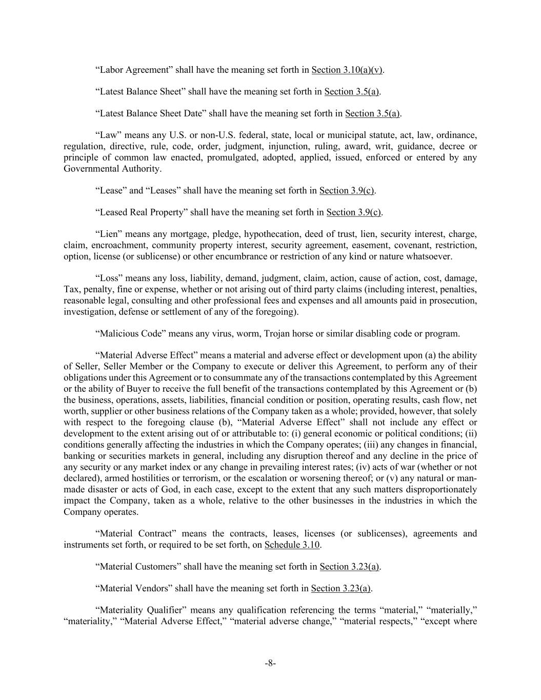 -8- “Labor Agreement” shall have the meaning set forth in Section 3.10(a)(v). “Latest Balance Sheet” shall have the meaning set forth in Section 3.5(a). “Latest Balance Sheet Date” shall have the meaning set forth in Section 3.5(a). “Law” means any U.S. or non-U.S. federal, state, local or municipal statute, act, law, ordinance, regulation, directive, rule, code, order, judgment, injunction, ruling, award, writ, guidance, decree or principle of common law enacted, promulgated, adopted, applied, issued, enforced or entered by any Governmental Authority. “Lease” and “Leases” shall have the meaning set forth in Section 3.9(c). “Leased Real Property” shall have the meaning set forth in Section 3.9(c). “Lien” means any mortgage, pledge, hypothecation, deed of trust, lien, security interest, charge, claim, encroachment, community property interest, security agreement, easement, covenant, restriction, option, license (or sublicense) or other encumbrance or restriction of any kind or nature whatsoever. “Loss” means any loss, liability, demand, judgment, claim, action, cause of action, cost, damage, Tax, penalty, fine or expense, whether or not arising out of third party claims (including interest, penalties, reasonable legal, consulting and other professional fees and expenses and all amounts paid in prosecution, investigation, defense or settlement of any of the foregoing). “Malicious Code” means any virus, worm, Trojan horse or similar disabling code or program. “Material Adverse Effect” means a material and adverse effect or development upon (a) the ability of Seller, Seller Member or the Company to execute or deliver this Agreement, to perform any of their obligations under this Agreement or to consummate any of the transactions contemplated by this Agreement or the ability of Buyer to receive the full benefit of the transactions contemplated by this Agreement or (b) the business, operations, assets, liabilities, financial condition or position, operating results, cash flow, net worth, supplier or other business relations of the Company taken as a whole; provided, however, that solely with respect to the foregoing clause (b), “Material Adverse Effect” shall not include any effect or development to the extent arising out of or attributable to: (i) general economic or political conditions; (ii) conditions generally affecting the industries in which the Company operates; (iii) any changes in financial, banking or securities markets in general, including any disruption thereof and any decline in the price of any security or any market index or any change in prevailing interest rates; (iv) acts of war (whether or not declared), armed hostilities or terrorism, or the escalation or worsening thereof; or (v) any natural or man- made disaster or acts of God, in each case, except to the extent that any such matters disproportionately impact the Company, taken as a whole, relative to the other businesses in the industries in which the Company operates. “Material Contract” means the contracts, leases, licenses (or sublicenses), agreements and instruments set forth, or required to be set forth, on Schedule 3.10. “Material Customers” shall have the meaning set forth in Section 3.23(a). “Material Vendors” shall have the meaning set forth in Section 3.23(a). “Materiality Qualifier” means any qualification referencing the terms “material,” “materially,” “materiality,” “Material Adverse Effect,” “material adverse change,” “material respects,” “except where