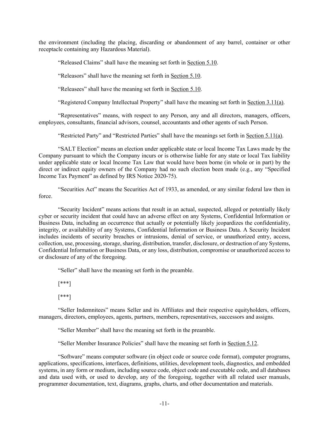 -11- the environment (including the placing, discarding or abandonment of any barrel, container or other receptacle containing any Hazardous Material). “Released Claims” shall have the meaning set forth in Section 5.10. “Releasors” shall have the meaning set forth in Section 5.10. “Releasees” shall have the meaning set forth in Section 5.10. “Registered Company Intellectual Property” shall have the meaning set forth in Section 3.11(a). “Representatives” means, with respect to any Person, any and all directors, managers, officers, employees, consultants, financial advisors, counsel, accountants and other agents of such Person. “Restricted Party” and “Restricted Parties” shall have the meanings set forth in Section 5.11(a). “SALT Election” means an election under applicable state or local Income Tax Laws made by the Company pursuant to which the Company incurs or is otherwise liable for any state or local Tax liability under applicable state or local Income Tax Law that would have been borne (in whole or in part) by the direct or indirect equity owners of the Company had no such election been made (e.g., any “Specified Income Tax Payment” as defined by IRS Notice 2020-75). “Securities Act” means the Securities Act of 1933, as amended, or any similar federal law then in force. “Security Incident” means actions that result in an actual, suspected, alleged or potentially likely cyber or security incident that could have an adverse effect on any Systems, Confidential Information or Business Data, including an occurrence that actually or potentially likely jeopardizes the confidentiality, integrity, or availability of any Systems, Confidential Information or Business Data. A Security Incident includes incidents of security breaches or intrusions, denial of service, or unauthorized entry, access, collection, use, processing, storage, sharing, distribution, transfer, disclosure, or destruction of any Systems, Confidential Information or Business Data, or any loss, distribution, compromise or unauthorized access to or disclosure of any of the foregoing. “Seller” shall have the meaning set forth in the preamble. [***] [***] “Seller Indemnitees” means Seller and its Affiliates and their respective equityholders, officers, managers, directors, employees, agents, partners, members, representatives, successors and assigns. “Seller Member” shall have the meaning set forth in the preamble. “Seller Member Insurance Policies” shall have the meaning set forth in Section 5.12. “Software” means computer software (in object code or source code format), computer programs, applications, specifications, interfaces, definitions, utilities, development tools, diagnostics, and embedded systems, in any form or medium, including source code, object code and executable code, and all databases and data used with, or used to develop, any of the foregoing, together with all related user manuals, programmer documentation, text, diagrams, graphs, charts, and other documentation and materials.