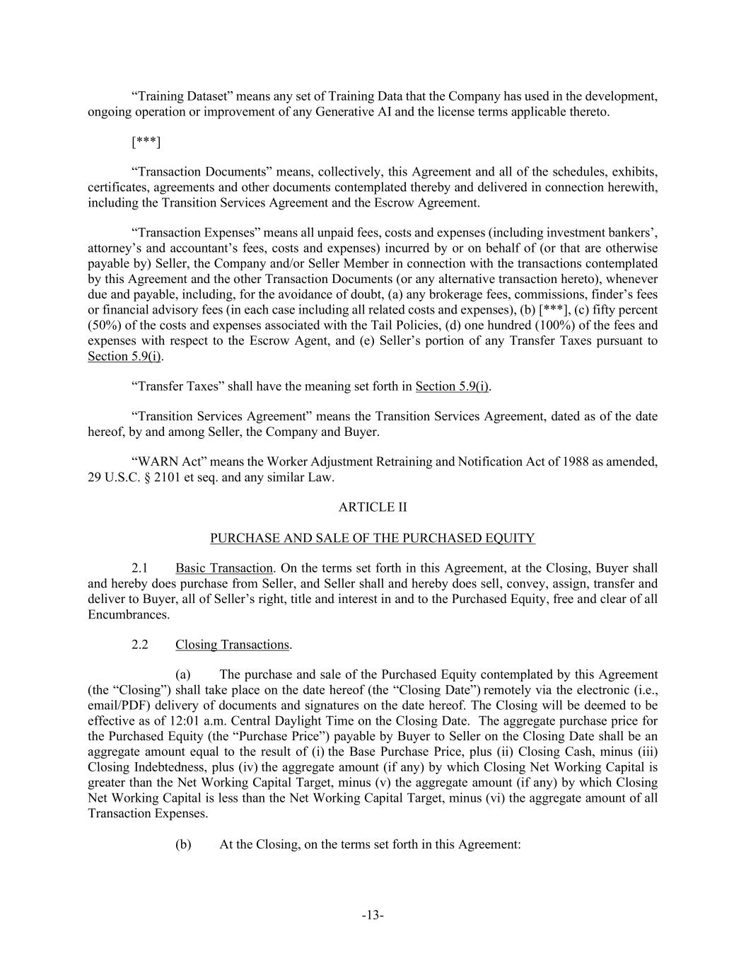 -13- “Training Dataset” means any set of Training Data that the Company has used in the development, ongoing operation or improvement of any Generative AI and the license terms applicable thereto. [***] “Transaction Documents” means, collectively, this Agreement and all of the schedules, exhibits, certificates, agreements and other documents contemplated thereby and delivered in connection herewith, including the Transition Services Agreement and the Escrow Agreement. “Transaction Expenses” means all unpaid fees, costs and expenses (including investment bankers’, attorney’s and accountant’s fees, costs and expenses) incurred by or on behalf of (or that are otherwise payable by) Seller, the Company and/or Seller Member in connection with the transactions contemplated by this Agreement and the other Transaction Documents (or any alternative transaction hereto), whenever due and payable, including, for the avoidance of doubt, (a) any brokerage fees, commissions, finder’s fees or financial advisory fees (in each case including all related costs and expenses), (b) [***], (c) fifty percent (50%) of the costs and expenses associated with the Tail Policies, (d) one hundred (100%) of the fees and expenses with respect to the Escrow Agent, and (e) Seller’s portion of any Transfer Taxes pursuant to Section 5.9(i). “Transfer Taxes” shall have the meaning set forth in Section 5.9(i). “Transition Services Agreement” means the Transition Services Agreement, dated as of the date hereof, by and among Seller, the Company and Buyer. “WARN Act” means the Worker Adjustment Retraining and Notification Act of 1988 as amended, 29 U.S.C. § 2101 et seq. and any similar Law. ARTICLE II PURCHASE AND SALE OF THE PURCHASED EQUITY 2.1 Basic Transaction. On the terms set forth in this Agreement, at the Closing, Buyer shall and hereby does purchase from Seller, and Seller shall and hereby does sell, convey, assign, transfer and deliver to Buyer, all of Seller’s right, title and interest in and to the Purchased Equity, free and clear of all Encumbrances. 2.2 Closing Transactions. (a) The purchase and sale of the Purchased Equity contemplated by this Agreement (the “Closing”) shall take place on the date hereof (the “Closing Date”) remotely via the electronic (i.e., email/PDF) delivery of documents and signatures on the date hereof. The Closing will be deemed to be effective as of 12:01 a.m. Central Daylight Time on the Closing Date. The aggregate purchase price for the Purchased Equity (the “Purchase Price”) payable by Buyer to Seller on the Closing Date shall be an aggregate amount equal to the result of (i) the Base Purchase Price, plus (ii) Closing Cash, minus (iii) Closing Indebtedness, plus (iv) the aggregate amount (if any) by which Closing Net Working Capital is greater than the Net Working Capital Target, minus (v) the aggregate amount (if any) by which Closing Net Working Capital is less than the Net Working Capital Target, minus (vi) the aggregate amount of all Transaction Expenses. (b) At the Closing, on the terms set forth in this Agreement: