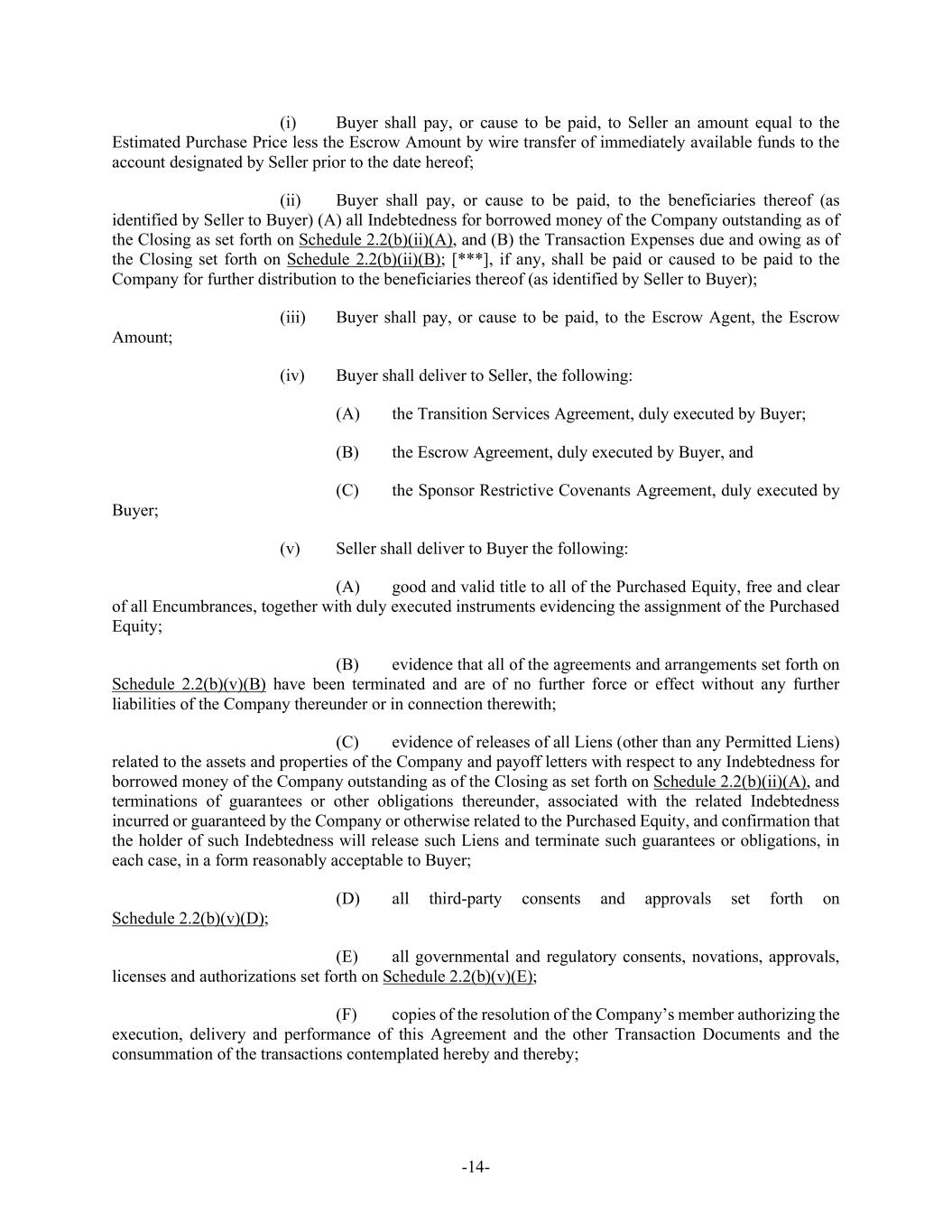 -14- (i) Buyer shall pay, or cause to be paid, to Seller an amount equal to the Estimated Purchase Price less the Escrow Amount by wire transfer of immediately available funds to the account designated by Seller prior to the date hereof; (ii) Buyer shall pay, or cause to be paid, to the beneficiaries thereof (as identified by Seller to Buyer) (A) all Indebtedness for borrowed money of the Company outstanding as of the Closing as set forth on Schedule 2.2(b)(ii)(A), and (B) the Transaction Expenses due and owing as of the Closing set forth on Schedule 2.2(b)(ii)(B); [***], if any, shall be paid or caused to be paid to the Company for further distribution to the beneficiaries thereof (as identified by Seller to Buyer); (iii) Buyer shall pay, or cause to be paid, to the Escrow Agent, the Escrow Amount; (iv) Buyer shall deliver to Seller, the following: (A) the Transition Services Agreement, duly executed by Buyer; (B) the Escrow Agreement, duly executed by Buyer, and (C) the Sponsor Restrictive Covenants Agreement, duly executed by Buyer; (v) Seller shall deliver to Buyer the following: (A) good and valid title to all of the Purchased Equity, free and clear of all Encumbrances, together with duly executed instruments evidencing the assignment of the Purchased Equity; (B) evidence that all of the agreements and arrangements set forth on Schedule 2.2(b)(v)(B) have been terminated and are of no further force or effect without any further liabilities of the Company thereunder or in connection therewith; (C) evidence of releases of all Liens (other than any Permitted Liens) related to the assets and properties of the Company and payoff letters with respect to any Indebtedness for borrowed money of the Company outstanding as of the Closing as set forth on Schedule 2.2(b)(ii)(A), and terminations of guarantees or other obligations thereunder, associated with the related Indebtedness incurred or guaranteed by the Company or otherwise related to the Purchased Equity, and confirmation that the holder of such Indebtedness will release such Liens and terminate such guarantees or obligations, in each case, in a form reasonably acceptable to Buyer; (D) all third-party consents and approvals set forth on Schedule 2.2(b)(v)(D); (E) all governmental and regulatory consents, novations, approvals, licenses and authorizations set forth on Schedule 2.2(b)(v)(E); (F) copies of the resolution of the Company’s member authorizing the execution, delivery and performance of this Agreement and the other Transaction Documents and the consummation of the transactions contemplated hereby and thereby;