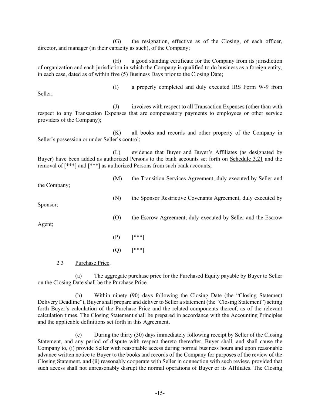 -15- (G) the resignation, effective as of the Closing, of each officer, director, and manager (in their capacity as such), of the Company; (H) a good standing certificate for the Company from its jurisdiction of organization and each jurisdiction in which the Company is qualified to do business as a foreign entity, in each case, dated as of within five (5) Business Days prior to the Closing Date; (I) a properly completed and duly executed IRS Form W-9 from Seller; (J) invoices with respect to all Transaction Expenses (other than with respect to any Transaction Expenses that are compensatory payments to employees or other service providers of the Company); (K) all books and records and other property of the Company in Seller’s possession or under Seller’s control; (L) evidence that Buyer and Buyer’s Affiliates (as designated by Buyer) have been added as authorized Persons to the bank accounts set forth on Schedule 3.21 and the removal of [***] and [***] as authorized Persons from such bank accounts; (M) the Transition Services Agreement, duly executed by Seller and the Company; (N) the Sponsor Restrictive Covenants Agreement, duly executed by Sponsor; (O) the Escrow Agreement, duly executed by Seller and the Escrow Agent; (P) [***] (Q) [***] 2.3 Purchase Price. (a) The aggregate purchase price for the Purchased Equity payable by Buyer to Seller on the Closing Date shall be the Purchase Price. (b) Within ninety (90) days following the Closing Date (the “Closing Statement Delivery Deadline”), Buyer shall prepare and deliver to Seller a statement (the “Closing Statement”) setting forth Buyer’s calculation of the Purchase Price and the related components thereof, as of the relevant calculation times. The Closing Statement shall be prepared in accordance with the Accounting Principles and the applicable definitions set forth in this Agreement. (c) During the thirty (30) days immediately following receipt by Seller of the Closing Statement, and any period of dispute with respect thereto thereafter, Buyer shall, and shall cause the Company to, (i) provide Seller with reasonable access during normal business hours and upon reasonable advance written notice to Buyer to the books and records of the Company for purposes of the review of the Closing Statement, and (ii) reasonably cooperate with Seller in connection with such review, provided that such access shall not unreasonably disrupt the normal operations of Buyer or its Affiliates. The Closing