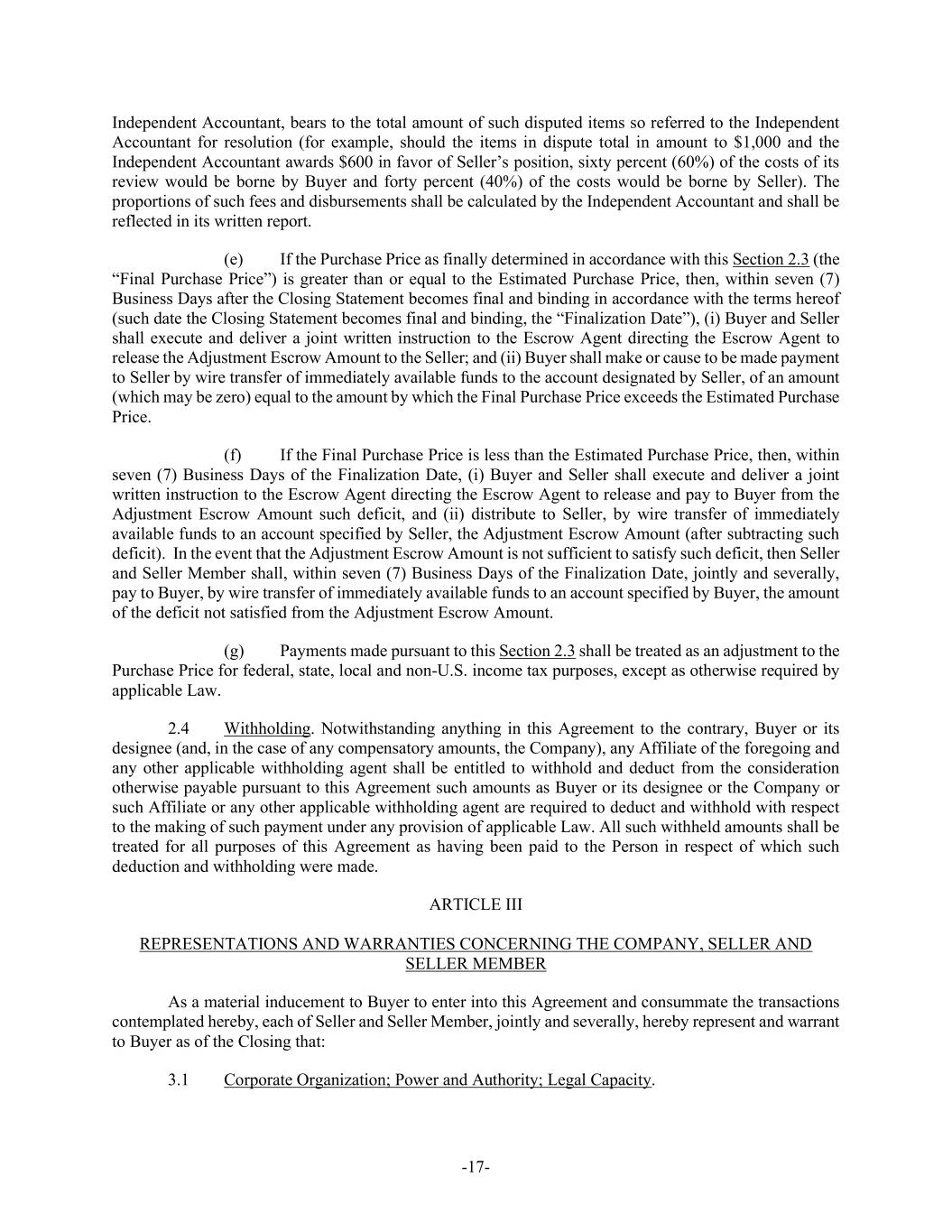 -17- Independent Accountant, bears to the total amount of such disputed items so referred to the Independent Accountant for resolution (for example, should the items in dispute total in amount to $1,000 and the Independent Accountant awards $600 in favor of Seller’s position, sixty percent (60%) of the costs of its review would be borne by Buyer and forty percent (40%) of the costs would be borne by Seller). The proportions of such fees and disbursements shall be calculated by the Independent Accountant and shall be reflected in its written report. (e) If the Purchase Price as finally determined in accordance with this Section 2.3 (the “Final Purchase Price”) is greater than or equal to the Estimated Purchase Price, then, within seven (7) Business Days after the Closing Statement becomes final and binding in accordance with the terms hereof (such date the Closing Statement becomes final and binding, the “Finalization Date”), (i) Buyer and Seller shall execute and deliver a joint written instruction to the Escrow Agent directing the Escrow Agent to release the Adjustment Escrow Amount to the Seller; and (ii) Buyer shall make or cause to be made payment to Seller by wire transfer of immediately available funds to the account designated by Seller, of an amount (which may be zero) equal to the amount by which the Final Purchase Price exceeds the Estimated Purchase Price. (f) If the Final Purchase Price is less than the Estimated Purchase Price, then, within seven (7) Business Days of the Finalization Date, (i) Buyer and Seller shall execute and deliver a joint written instruction to the Escrow Agent directing the Escrow Agent to release and pay to Buyer from the Adjustment Escrow Amount such deficit, and (ii) distribute to Seller, by wire transfer of immediately available funds to an account specified by Seller, the Adjustment Escrow Amount (after subtracting such deficit). In the event that the Adjustment Escrow Amount is not sufficient to satisfy such deficit, then Seller and Seller Member shall, within seven (7) Business Days of the Finalization Date, jointly and severally, pay to Buyer, by wire transfer of immediately available funds to an account specified by Buyer, the amount of the deficit not satisfied from the Adjustment Escrow Amount. (g) Payments made pursuant to this Section 2.3 shall be treated as an adjustment to the Purchase Price for federal, state, local and non-U.S. income tax purposes, except as otherwise required by applicable Law. 2.4 Withholding. Notwithstanding anything in this Agreement to the contrary, Buyer or its designee (and, in the case of any compensatory amounts, the Company), any Affiliate of the foregoing and any other applicable withholding agent shall be entitled to withhold and deduct from the consideration otherwise payable pursuant to this Agreement such amounts as Buyer or its designee or the Company or such Affiliate or any other applicable withholding agent are required to deduct and withhold with respect to the making of such payment under any provision of applicable Law. All such withheld amounts shall be treated for all purposes of this Agreement as having been paid to the Person in respect of which such deduction and withholding were made. ARTICLE III REPRESENTATIONS AND WARRANTIES CONCERNING THE COMPANY, SELLER AND SELLER MEMBER As a material inducement to Buyer to enter into this Agreement and consummate the transactions contemplated hereby, each of Seller and Seller Member, jointly and severally, hereby represent and warrant to Buyer as of the Closing that: 3.1 Corporate Organization; Power and Authority; Legal Capacity.