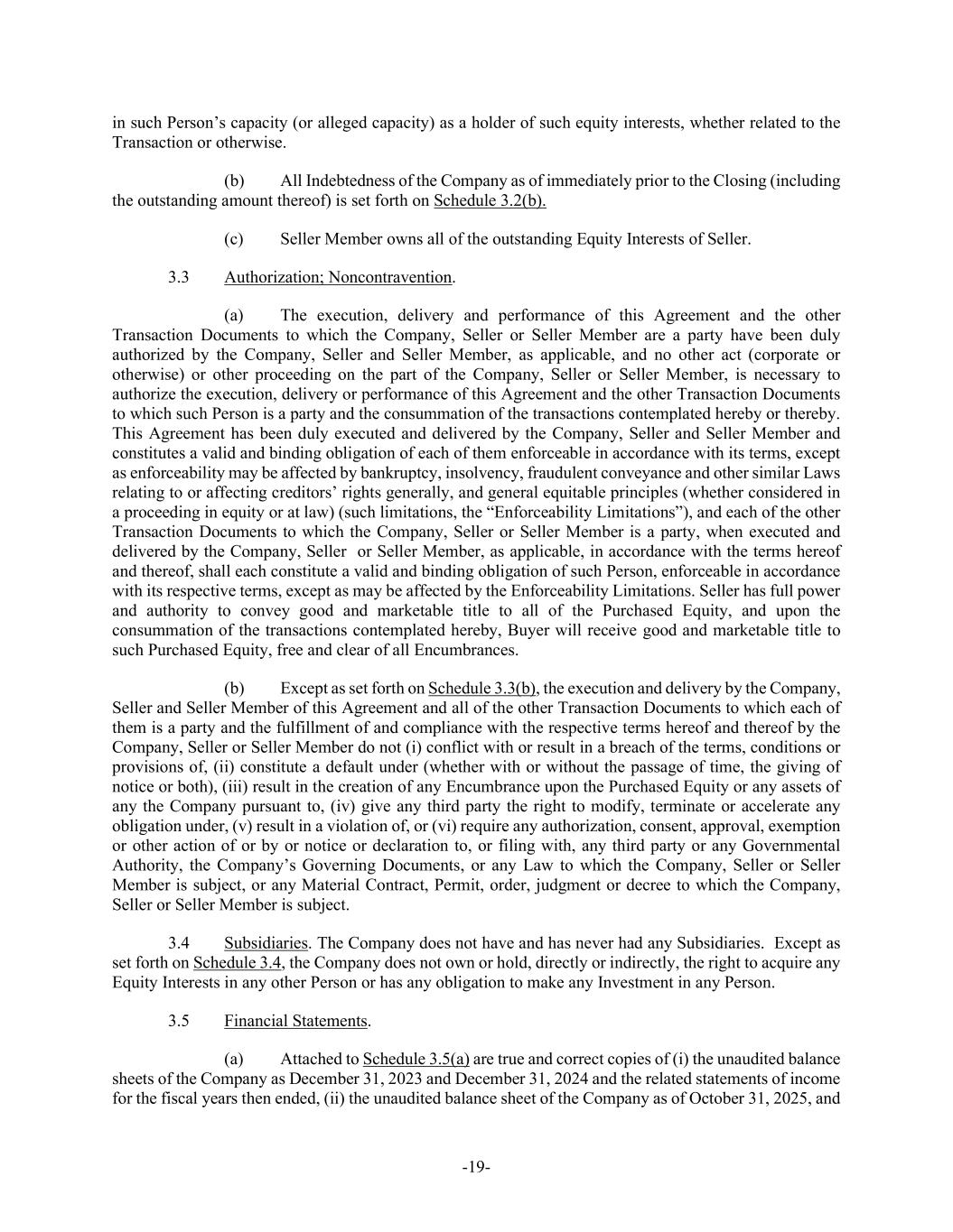 -19- in such Person’s capacity (or alleged capacity) as a holder of such equity interests, whether related to the Transaction or otherwise. (b) All Indebtedness of the Company as of immediately prior to the Closing (including the outstanding amount thereof) is set forth on Schedule 3.2(b). (c) Seller Member owns all of the outstanding Equity Interests of Seller. 3.3 Authorization; Noncontravention. (a) The execution, delivery and performance of this Agreement and the other Transaction Documents to which the Company, Seller or Seller Member are a party have been duly authorized by the Company, Seller and Seller Member, as applicable, and no other act (corporate or otherwise) or other proceeding on the part of the Company, Seller or Seller Member, is necessary to authorize the execution, delivery or performance of this Agreement and the other Transaction Documents to which such Person is a party and the consummation of the transactions contemplated hereby or thereby. This Agreement has been duly executed and delivered by the Company, Seller and Seller Member and constitutes a valid and binding obligation of each of them enforceable in accordance with its terms, except as enforceability may be affected by bankruptcy, insolvency, fraudulent conveyance and other similar Laws relating to or affecting creditors’ rights generally, and general equitable principles (whether considered in a proceeding in equity or at law) (such limitations, the “Enforceability Limitations”), and each of the other Transaction Documents to which the Company, Seller or Seller Member is a party, when executed and delivered by the Company, Seller or Seller Member, as applicable, in accordance with the terms hereof and thereof, shall each constitute a valid and binding obligation of such Person, enforceable in accordance with its respective terms, except as may be affected by the Enforceability Limitations. Seller has full power and authority to convey good and marketable title to all of the Purchased Equity, and upon the consummation of the transactions contemplated hereby, Buyer will receive good and marketable title to such Purchased Equity, free and clear of all Encumbrances. (b) Except as set forth on Schedule 3.3(b), the execution and delivery by the Company, Seller and Seller Member of this Agreement and all of the other Transaction Documents to which each of them is a party and the fulfillment of and compliance with the respective terms hereof and thereof by the Company, Seller or Seller Member do not (i) conflict with or result in a breach of the terms, conditions or provisions of, (ii) constitute a default under (whether with or without the passage of time, the giving of notice or both), (iii) result in the creation of any Encumbrance upon the Purchased Equity or any assets of any the Company pursuant to, (iv) give any third party the right to modify, terminate or accelerate any obligation under, (v) result in a violation of, or (vi) require any authorization, consent, approval, exemption or other action of or by or notice or declaration to, or filing with, any third party or any Governmental Authority, the Company’s Governing Documents, or any Law to which the Company, Seller or Seller Member is subject, or any Material Contract, Permit, order, judgment or decree to which the Company, Seller or Seller Member is subject. 3.4 Subsidiaries. The Company does not have and has never had any Subsidiaries. Except as set forth on Schedule 3.4, the Company does not own or hold, directly or indirectly, the right to acquire any Equity Interests in any other Person or has any obligation to make any Investment in any Person. 3.5 Financial Statements. (a) Attached to Schedule 3.5(a) are true and correct copies of (i) the unaudited balance sheets of the Company as December 31, 2023 and December 31, 2024 and the related statements of income for the fiscal years then ended, (ii) the unaudited balance sheet of the Company as of October 31, 2025, and