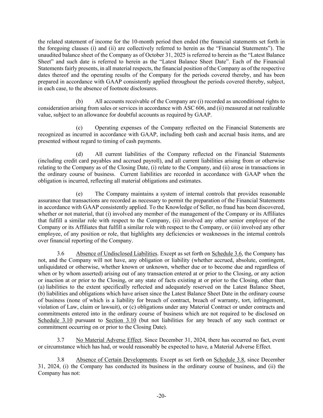 -20- the related statement of income for the 10-month period then ended (the financial statements set forth in the foregoing clauses (i) and (ii) are collectively referred to herein as the “Financial Statements”). The unaudited balance sheet of the Company as of October 31, 2025 is referred to herein as the “Latest Balance Sheet” and such date is referred to herein as the “Latest Balance Sheet Date”. Each of the Financial Statements fairly presents, in all material respects, the financial position of the Company as of the respective dates thereof and the operating results of the Company for the periods covered thereby, and has been prepared in accordance with GAAP consistently applied throughout the periods covered thereby, subject, in each case, to the absence of footnote disclosures. (b) All accounts receivable of the Company are (i) recorded as unconditional rights to consideration arising from sales or services in accordance with ASC 606, and (ii) measured at net realizable value, subject to an allowance for doubtful accounts as required by GAAP. (c) Operating expenses of the Company reflected on the Financial Statements are recognized as incurred in accordance with GAAP, including both cash and accrual basis items, and are presented without regard to timing of cash payments. (d) All current liabilities of the Company reflected on the Financial Statements (including credit card payables and accrued payroll), and all current liabilities arising from or otherwise relating to the Company as of the Closing Date, (i) relate to the Company, and (ii) arose in transactions in the ordinary course of business. Current liabilities are recorded in accordance with GAAP when the obligation is incurred, reflecting all material obligations and estimates. (e) The Company maintains a system of internal controls that provides reasonable assurance that transactions are recorded as necessary to permit the preparation of the Financial Statements in accordance with GAAP consistently applied. To the Knowledge of Seller, no fraud has been discovered, whether or not material, that (i) involved any member of the management of the Company or its Affiliates that fulfill a similar role with respect to the Company, (ii) involved any other senior employee of the Company or its Affiliates that fulfill a similar role with respect to the Company, or (iii) involved any other employee, of any position or role, that highlights any deficiencies or weaknesses in the internal controls over financial reporting of the Company. 3.6 Absence of Undisclosed Liabilities. Except as set forth on Schedule 3.6, the Company has not, and the Company will not have, any obligation or liability (whether accrued, absolute, contingent, unliquidated or otherwise, whether known or unknown, whether due or to become due and regardless of when or by whom asserted) arising out of any transaction entered at or prior to the Closing, or any action or inaction at or prior to the Closing, or any state of facts existing at or prior to the Closing, other than (a) liabilities to the extent specifically reflected and adequately reserved on the Latest Balance Sheet, (b) liabilities and obligations which have arisen since the Latest Balance Sheet Date in the ordinary course of business (none of which is a liability for breach of contract, breach of warranty, tort, infringement, violation of Law, claim or lawsuit), or (c) obligations under any Material Contract or under contracts and commitments entered into in the ordinary course of business which are not required to be disclosed on Schedule 3.10 pursuant to Section 3.10 (but not liabilities for any breach of any such contract or commitment occurring on or prior to the Closing Date). 3.7 No Material Adverse Effect. Since December 31, 2024, there has occurred no fact, event or circumstance which has had, or would reasonably be expected to have, a Material Adverse Effect. 3.8 Absence of Certain Developments. Except as set forth on Schedule 3.8, since December 31, 2024, (i) the Company has conducted its business in the ordinary course of business, and (ii) the Company has not: