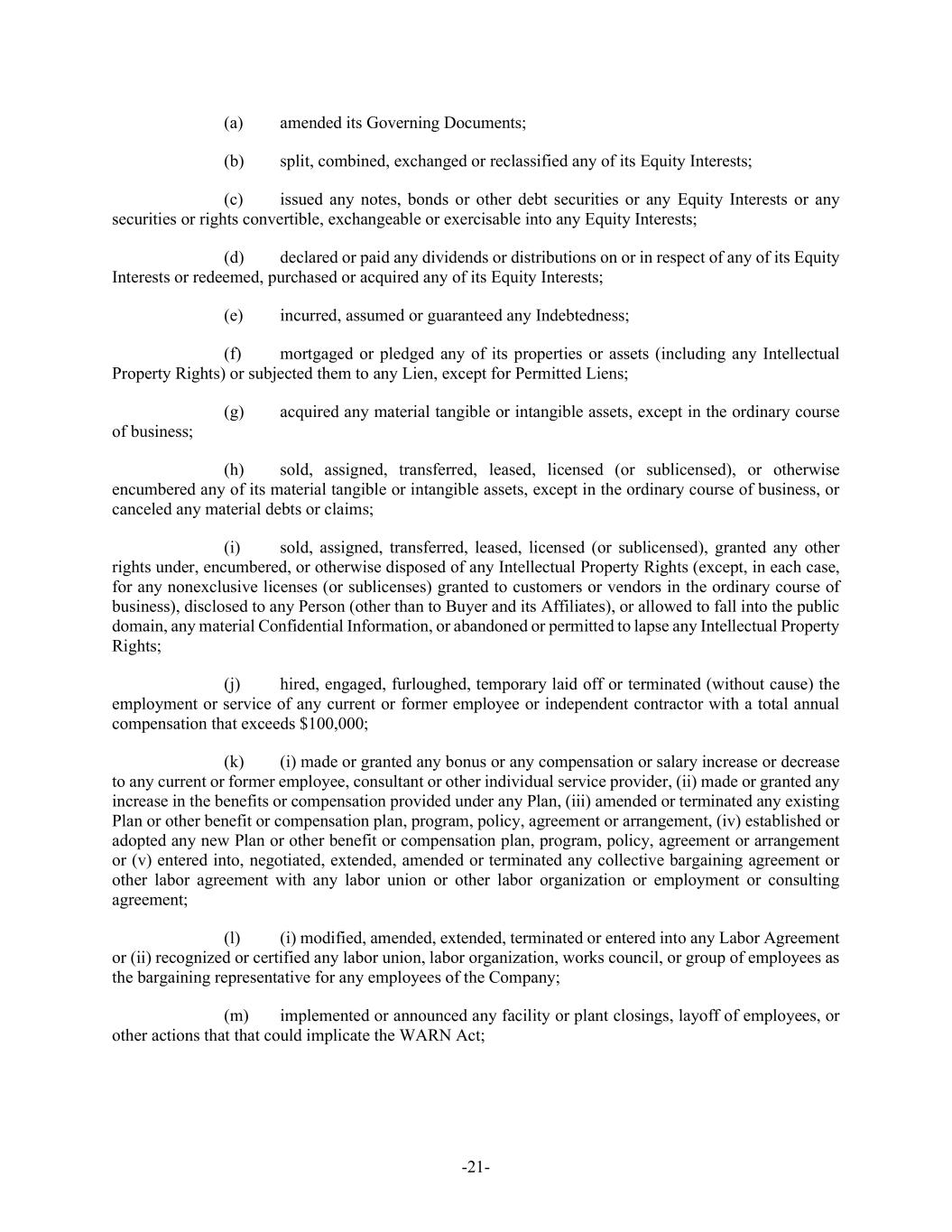 -21- (a) amended its Governing Documents; (b) split, combined, exchanged or reclassified any of its Equity Interests; (c) issued any notes, bonds or other debt securities or any Equity Interests or any securities or rights convertible, exchangeable or exercisable into any Equity Interests; (d) declared or paid any dividends or distributions on or in respect of any of its Equity Interests or redeemed, purchased or acquired any of its Equity Interests; (e) incurred, assumed or guaranteed any Indebtedness; (f) mortgaged or pledged any of its properties or assets (including any Intellectual Property Rights) or subjected them to any Lien, except for Permitted Liens; (g) acquired any material tangible or intangible assets, except in the ordinary course of business; (h) sold, assigned, transferred, leased, licensed (or sublicensed), or otherwise encumbered any of its material tangible or intangible assets, except in the ordinary course of business, or canceled any material debts or claims; (i) sold, assigned, transferred, leased, licensed (or sublicensed), granted any other rights under, encumbered, or otherwise disposed of any Intellectual Property Rights (except, in each case, for any nonexclusive licenses (or sublicenses) granted to customers or vendors in the ordinary course of business), disclosed to any Person (other than to Buyer and its Affiliates), or allowed to fall into the public domain, any material Confidential Information, or abandoned or permitted to lapse any Intellectual Property Rights; (j) hired, engaged, furloughed, temporary laid off or terminated (without cause) the employment or service of any current or former employee or independent contractor with a total annual compensation that exceeds $100,000; (k) (i) made or granted any bonus or any compensation or salary increase or decrease to any current or former employee, consultant or other individual service provider, (ii) made or granted any increase in the benefits or compensation provided under any Plan, (iii) amended or terminated any existing Plan or other benefit or compensation plan, program, policy, agreement or arrangement, (iv) established or adopted any new Plan or other benefit or compensation plan, program, policy, agreement or arrangement or (v) entered into, negotiated, extended, amended or terminated any collective bargaining agreement or other labor agreement with any labor union or other labor organization or employment or consulting agreement; (l) (i) modified, amended, extended, terminated or entered into any Labor Agreement or (ii) recognized or certified any labor union, labor organization, works council, or group of employees as the bargaining representative for any employees of the Company; (m) implemented or announced any facility or plant closings, layoff of employees, or other actions that that could implicate the WARN Act;