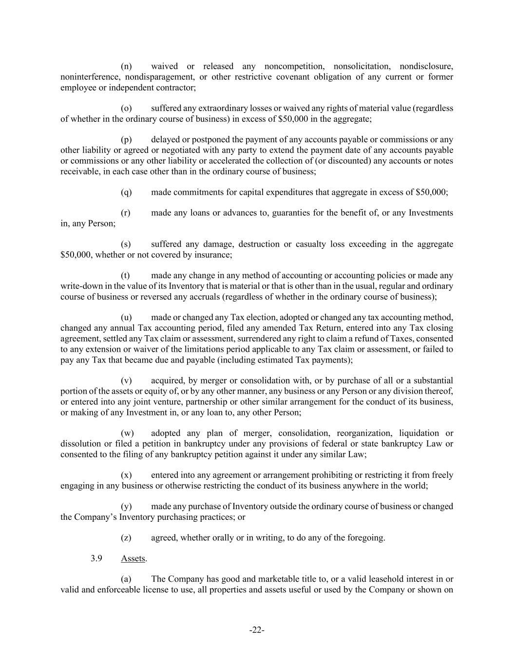 -22- (n) waived or released any noncompetition, nonsolicitation, nondisclosure, noninterference, nondisparagement, or other restrictive covenant obligation of any current or former employee or independent contractor; (o) suffered any extraordinary losses or waived any rights of material value (regardless of whether in the ordinary course of business) in excess of $50,000 in the aggregate; (p) delayed or postponed the payment of any accounts payable or commissions or any other liability or agreed or negotiated with any party to extend the payment date of any accounts payable or commissions or any other liability or accelerated the collection of (or discounted) any accounts or notes receivable, in each case other than in the ordinary course of business; (q) made commitments for capital expenditures that aggregate in excess of $50,000; (r) made any loans or advances to, guaranties for the benefit of, or any Investments in, any Person; (s) suffered any damage, destruction or casualty loss exceeding in the aggregate $50,000, whether or not covered by insurance; (t) made any change in any method of accounting or accounting policies or made any write-down in the value of its Inventory that is material or that is other than in the usual, regular and ordinary course of business or reversed any accruals (regardless of whether in the ordinary course of business); (u) made or changed any Tax election, adopted or changed any tax accounting method, changed any annual Tax accounting period, filed any amended Tax Return, entered into any Tax closing agreement, settled any Tax claim or assessment, surrendered any right to claim a refund of Taxes, consented to any extension or waiver of the limitations period applicable to any Tax claim or assessment, or failed to pay any Tax that became due and payable (including estimated Tax payments); (v) acquired, by merger or consolidation with, or by purchase of all or a substantial portion of the assets or equity of, or by any other manner, any business or any Person or any division thereof, or entered into any joint venture, partnership or other similar arrangement for the conduct of its business, or making of any Investment in, or any loan to, any other Person; (w) adopted any plan of merger, consolidation, reorganization, liquidation or dissolution or filed a petition in bankruptcy under any provisions of federal or state bankruptcy Law or consented to the filing of any bankruptcy petition against it under any similar Law; (x) entered into any agreement or arrangement prohibiting or restricting it from freely engaging in any business or otherwise restricting the conduct of its business anywhere in the world; (y) made any purchase of Inventory outside the ordinary course of business or changed the Company’s Inventory purchasing practices; or (z) agreed, whether orally or in writing, to do any of the foregoing. 3.9 Assets. (a) The Company has good and marketable title to, or a valid leasehold interest in or valid and enforceable license to use, all properties and assets useful or used by the Company or shown on
