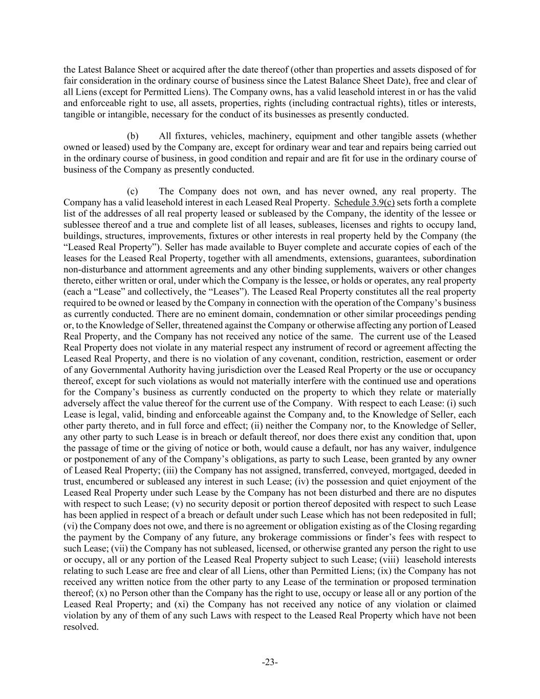 -23- the Latest Balance Sheet or acquired after the date thereof (other than properties and assets disposed of for fair consideration in the ordinary course of business since the Latest Balance Sheet Date), free and clear of all Liens (except for Permitted Liens). The Company owns, has a valid leasehold interest in or has the valid and enforceable right to use, all assets, properties, rights (including contractual rights), titles or interests, tangible or intangible, necessary for the conduct of its businesses as presently conducted. (b) All fixtures, vehicles, machinery, equipment and other tangible assets (whether owned or leased) used by the Company are, except for ordinary wear and tear and repairs being carried out in the ordinary course of business, in good condition and repair and are fit for use in the ordinary course of business of the Company as presently conducted. (c) The Company does not own, and has never owned, any real property. The Company has a valid leasehold interest in each Leased Real Property. Schedule 3.9(c) sets forth a complete list of the addresses of all real property leased or subleased by the Company, the identity of the lessee or sublessee thereof and a true and complete list of all leases, subleases, licenses and rights to occupy land, buildings, structures, improvements, fixtures or other interests in real property held by the Company (the “Leased Real Property”). Seller has made available to Buyer complete and accurate copies of each of the leases for the Leased Real Property, together with all amendments, extensions, guarantees, subordination non-disturbance and attornment agreements and any other binding supplements, waivers or other changes thereto, either written or oral, under which the Company is the lessee, or holds or operates, any real property (each a “Lease” and collectively, the “Leases”). The Leased Real Property constitutes all the real property required to be owned or leased by the Company in connection with the operation of the Company’s business as currently conducted. There are no eminent domain, condemnation or other similar proceedings pending or, to the Knowledge of Seller, threatened against the Company or otherwise affecting any portion of Leased Real Property, and the Company has not received any notice of the same. The current use of the Leased Real Property does not violate in any material respect any instrument of record or agreement affecting the Leased Real Property, and there is no violation of any covenant, condition, restriction, easement or order of any Governmental Authority having jurisdiction over the Leased Real Property or the use or occupancy thereof, except for such violations as would not materially interfere with the continued use and operations for the Company’s business as currently conducted on the property to which they relate or materially adversely affect the value thereof for the current use of the Company. With respect to each Lease: (i) such Lease is legal, valid, binding and enforceable against the Company and, to the Knowledge of Seller, each other party thereto, and in full force and effect; (ii) neither the Company nor, to the Knowledge of Seller, any other party to such Lease is in breach or default thereof, nor does there exist any condition that, upon the passage of time or the giving of notice or both, would cause a default, nor has any waiver, indulgence or postponement of any of the Company’s obligations, as party to such Lease, been granted by any owner of Leased Real Property; (iii) the Company has not assigned, transferred, conveyed, mortgaged, deeded in trust, encumbered or subleased any interest in such Lease; (iv) the possession and quiet enjoyment of the Leased Real Property under such Lease by the Company has not been disturbed and there are no disputes with respect to such Lease; (v) no security deposit or portion thereof deposited with respect to such Lease has been applied in respect of a breach or default under such Lease which has not been redeposited in full; (vi) the Company does not owe, and there is no agreement or obligation existing as of the Closing regarding the payment by the Company of any future, any brokerage commissions or finder’s fees with respect to such Lease; (vii) the Company has not subleased, licensed, or otherwise granted any person the right to use or occupy, all or any portion of the Leased Real Property subject to such Lease; (viii) leasehold interests relating to such Lease are free and clear of all Liens, other than Permitted Liens; (ix) the Company has not received any written notice from the other party to any Lease of the termination or proposed termination thereof; (x) no Person other than the Company has the right to use, occupy or lease all or any portion of the Leased Real Property; and (xi) the Company has not received any notice of any violation or claimed violation by any of them of any such Laws with respect to the Leased Real Property which have not been resolved.