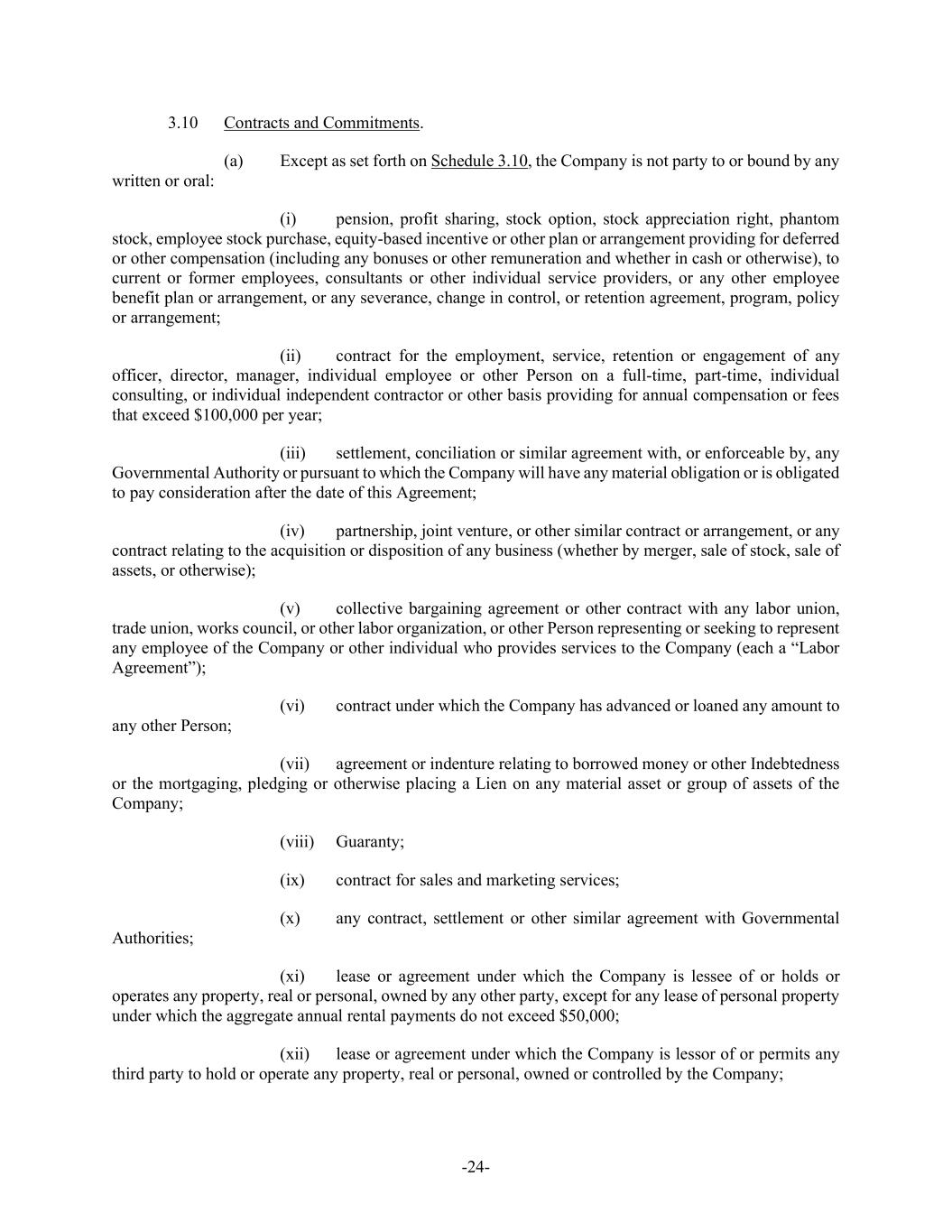 -24- 3.10 Contracts and Commitments. (a) Except as set forth on Schedule 3.10, the Company is not party to or bound by any written or oral: (i) pension, profit sharing, stock option, stock appreciation right, phantom stock, employee stock purchase, equity-based incentive or other plan or arrangement providing for deferred or other compensation (including any bonuses or other remuneration and whether in cash or otherwise), to current or former employees, consultants or other individual service providers, or any other employee benefit plan or arrangement, or any severance, change in control, or retention agreement, program, policy or arrangement; (ii) contract for the employment, service, retention or engagement of any officer, director, manager, individual employee or other Person on a full-time, part-time, individual consulting, or individual independent contractor or other basis providing for annual compensation or fees that exceed $100,000 per year; (iii) settlement, conciliation or similar agreement with, or enforceable by, any Governmental Authority or pursuant to which the Company will have any material obligation or is obligated to pay consideration after the date of this Agreement; (iv) partnership, joint venture, or other similar contract or arrangement, or any contract relating to the acquisition or disposition of any business (whether by merger, sale of stock, sale of assets, or otherwise); (v) collective bargaining agreement or other contract with any labor union, trade union, works council, or other labor organization, or other Person representing or seeking to represent any employee of the Company or other individual who provides services to the Company (each a “Labor Agreement”); (vi) contract under which the Company has advanced or loaned any amount to any other Person; (vii) agreement or indenture relating to borrowed money or other Indebtedness or the mortgaging, pledging or otherwise placing a Lien on any material asset or group of assets of the Company; (viii) Guaranty; (ix) contract for sales and marketing services; (x) any contract, settlement or other similar agreement with Governmental Authorities; (xi) lease or agreement under which the Company is lessee of or holds or operates any property, real or personal, owned by any other party, except for any lease of personal property under which the aggregate annual rental payments do not exceed $50,000; (xii) lease or agreement under which the Company is lessor of or permits any third party to hold or operate any property, real or personal, owned or controlled by the Company;