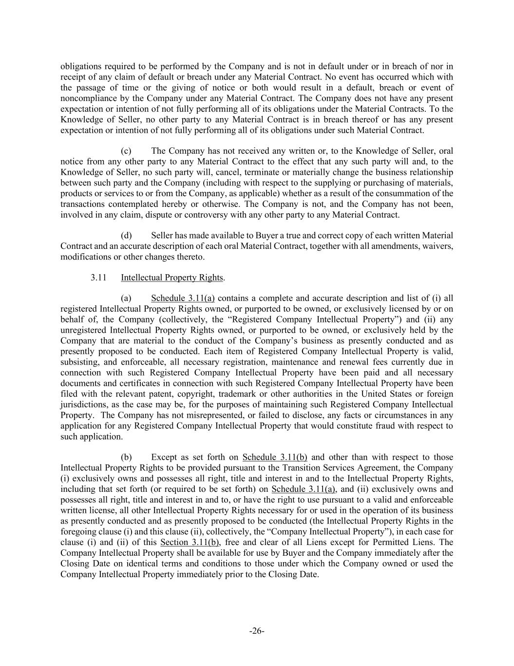 -26- obligations required to be performed by the Company and is not in default under or in breach of nor in receipt of any claim of default or breach under any Material Contract. No event has occurred which with the passage of time or the giving of notice or both would result in a default, breach or event of noncompliance by the Company under any Material Contract. The Company does not have any present expectation or intention of not fully performing all of its obligations under the Material Contracts. To the Knowledge of Seller, no other party to any Material Contract is in breach thereof or has any present expectation or intention of not fully performing all of its obligations under such Material Contract. (c) The Company has not received any written or, to the Knowledge of Seller, oral notice from any other party to any Material Contract to the effect that any such party will and, to the Knowledge of Seller, no such party will, cancel, terminate or materially change the business relationship between such party and the Company (including with respect to the supplying or purchasing of materials, products or services to or from the Company, as applicable) whether as a result of the consummation of the transactions contemplated hereby or otherwise. The Company is not, and the Company has not been, involved in any claim, dispute or controversy with any other party to any Material Contract. (d) Seller has made available to Buyer a true and correct copy of each written Material Contract and an accurate description of each oral Material Contract, together with all amendments, waivers, modifications or other changes thereto. 3.11 Intellectual Property Rights. (a) Schedule 3.11(a) contains a complete and accurate description and list of (i) all registered Intellectual Property Rights owned, or purported to be owned, or exclusively licensed by or on behalf of, the Company (collectively, the “Registered Company Intellectual Property”) and (ii) any unregistered Intellectual Property Rights owned, or purported to be owned, or exclusively held by the Company that are material to the conduct of the Company’s business as presently conducted and as presently proposed to be conducted. Each item of Registered Company Intellectual Property is valid, subsisting, and enforceable, all necessary registration, maintenance and renewal fees currently due in connection with such Registered Company Intellectual Property have been paid and all necessary documents and certificates in connection with such Registered Company Intellectual Property have been filed with the relevant patent, copyright, trademark or other authorities in the United States or foreign jurisdictions, as the case may be, for the purposes of maintaining such Registered Company Intellectual Property. The Company has not misrepresented, or failed to disclose, any facts or circumstances in any application for any Registered Company Intellectual Property that would constitute fraud with respect to such application. (b) Except as set forth on Schedule 3.11(b) and other than with respect to those Intellectual Property Rights to be provided pursuant to the Transition Services Agreement, the Company (i) exclusively owns and possesses all right, title and interest in and to the Intellectual Property Rights, including that set forth (or required to be set forth) on Schedule 3.11(a), and (ii) exclusively owns and possesses all right, title and interest in and to, or have the right to use pursuant to a valid and enforceable written license, all other Intellectual Property Rights necessary for or used in the operation of its business as presently conducted and as presently proposed to be conducted (the Intellectual Property Rights in the foregoing clause (i) and this clause (ii), collectively, the “Company Intellectual Property”), in each case for clause (i) and (ii) of this Section 3.11(b), free and clear of all Liens except for Permitted Liens. The Company Intellectual Property shall be available for use by Buyer and the Company immediately after the Closing Date on identical terms and conditions to those under which the Company owned or used the Company Intellectual Property immediately prior to the Closing Date.