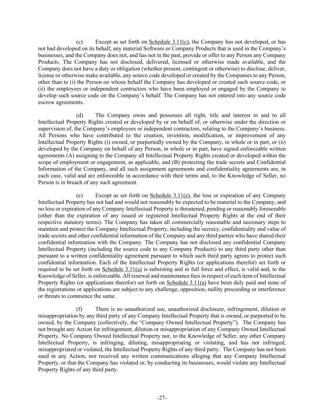 -27- (c) Except as set forth on Schedule 3.11(c), the Company has not developed, or has not had developed on its behalf, any material Software or Company Products that is used in the Company’s businesses, and the Company does not, and has not in the past, provide or offer to any Person any Company Products. The Company has not disclosed, delivered, licensed or otherwise made available, and the Company does not have a duty or obligation (whether present, contingent or otherwise) to disclose, deliver, license or otherwise make available, any source code developed or created by the Companies to any Person, other than to (i) the Person on whose behalf the Company has developed or created such source code, or (ii) the employees or independent contractors who have been employed or engaged by the Company to develop such source code on the Company’s behalf. The Company has not entered into any source code escrow agreements. (d) The Company owns and possesses all right, title and interest in and to all Intellectual Property Rights created or developed by or on behalf of, or otherwise under the direction or supervision of, the Company’s employees or independent contractors, relating to the Company’s business. All Persons who have contributed to the creation, invention, modification, or improvement of any Intellectual Property Rights (i) owned, or purportedly owned by the Company, in whole or in part, or (ii) developed by the Company on behalf of any Person, in whole or in part, have signed enforceable written agreements (A) assigning to the Company all Intellectual Property Rights created or developed within the scope of employment or engagement, as applicable, and (B) protecting the trade secrets and Confidential Information of the Company, and all such assignment agreements and confidentiality agreements are, in each case, valid and are enforceable in accordance with their terms and, to the Knowledge of Seller, no Person is in breach of any such agreement. (e) Except as set forth on Schedule 3.11(e), the loss or expiration of any Company Intellectual Property has not had and would not reasonably be expected to be material to the Company, and no loss or expiration of any Company Intellectual Property is threatened, pending or reasonably foreseeable (other than the expiration of any issued or registered Intellectual Property Rights at the end of their respective statutory terms). The Company has taken all commercially reasonable and necessary steps to maintain and protect the Company Intellectual Property, including the secrecy, confidentiality and value of trade secrets and other confidential information of the Company and any third parties who have shared their confidential information with the Company. The Company has not disclosed any confidential Company Intellectual Property (including the source code to any Company Products) to any third party other than pursuant to a written confidentiality agreement pursuant to which such third party agrees to protect such confidential information. Each of the Intellectual Property Rights (or applications therefor) set forth or required to be set forth on Schedule 3.11(a) is subsisting and in full force and effect, is valid and, to the Knowledge of Seller, is enforceable. All renewal and maintenance fees in respect of each item of Intellectual Property Rights (or applications therefor) set forth on Schedule 3.11(a) have been duly paid and none of the registrations or applications are subject to any challenge, opposition, nullity proceeding or interference or threats to commence the same. (f) There is no unauthorized use, unauthorized disclosure, infringement, dilution or misappropriation by any third party of any Company Intellectual Property that is owned, or purported to be owned, by the Company (collectively, the “Company Owned Intellectual Property”). The Company has not brought any Action for infringement, dilution or misappropriation of any Company Owned Intellectual Property. No Company Owned Intellectual Property nor, to the Knowledge of Seller, any other Company Intellectual Property, is infringing, diluting, misappropriating or violating, and has not infringed, misappropriated or violated, the Intellectual Property Rights of any third party. The Company has not been sued in any Action, nor received any written communications alleging that any Company Intellectual Property, or that the Company has violated or, by conducting its businesses, would violate any Intellectual Property Rights of any third party.