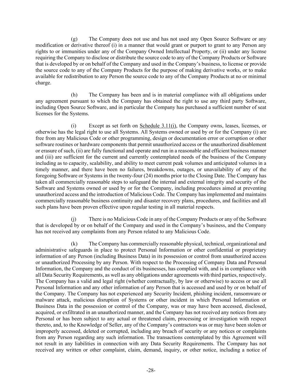 -28- (g) The Company does not use and has not used any Open Source Software or any modification or derivative thereof (i) in a manner that would grant or purport to grant to any Person any rights to or immunities under any of the Company Owned Intellectual Property, or (ii) under any license requiring the Company to disclose or distribute the source code to any of the Company Products or Software that is developed by or on behalf of the Company and used in the Company’s business, to license or provide the source code to any of the Company Products for the purpose of making derivative works, or to make available for redistribution to any Person the source code to any of the Company Products at no or minimal charge. (h) The Company has been and is in material compliance with all obligations under any agreement pursuant to which the Company has obtained the right to use any third party Software, including Open Source Software, and in particular the Company has purchased a sufficient number of seat licenses for the Systems. (i) Except as set forth on Schedule 3.11(i), the Company owns, leases, licenses, or otherwise has the legal right to use all Systems. All Systems owned or used by or for the Company (i) are free from any Malicious Code or other programming, design or documentation error or corruption or other software routines or hardware components that permit unauthorized access or the unauthorized disablement or erasure of such, (ii) are fully functional and operate and run in a reasonable and efficient business manner and (iii) are sufficient for the current and currently contemplated needs of the business of the Company including as to capacity, scalability, and ability to meet current peak volumes and anticipated volumes in a timely manner, and there have been no failures, breakdowns, outages, or unavailability of any of the foregoing Software or Systems in the twenty-four (24) months prior to the Closing Date. The Company has taken all commercially reasonable steps to safeguard the internal and external integrity and security of the Software and Systems owned or used by or for the Company, including procedures aimed at preventing unauthorized access and the introduction of Malicious Code. The Company has implemented and maintains commercially reasonable business continuity and disaster recovery plans, procedures, and facilities and all such plans have been proven effective upon regular testing in all material respects. (j) There is no Malicious Code in any of the Company Products or any of the Software that is developed by or on behalf of the Company and used in the Company’s business, and the Company has not received any complaints from any Person related to any Malicious Code. (k) The Company has commercially reasonable physical, technical, organizational and administrative safeguards in place to protect Personal Information or other confidential or proprietary information of any Person (including Business Data) in its possession or control from unauthorized access or unauthorized Processing by any Person. With respect to the Processing of Company Data and Personal Information, the Company and the conduct of its businesses, has complied with, and is in compliance with all Data Security Requirements, as well as any obligations under agreements with third parties, respectively. The Company has a valid and legal right (whether contractually, by law or otherwise) to access or use all Personal Information and any other information of any Person that is accessed and used by or on behalf of the Company. The Company has not experienced any Security Incident, phishing incident, ransomware or malware attack, malicious disruption of Systems or other incident in which Personal Information or Business Data in the possession or control of the Company, was or may have been accessed, disclosed, acquired, or exfiltrated in an unauthorized manner, and the Company has not received any notices from any Personal or has been subject to any actual or threatened claim, processing or investigation with respect thereto, and, to the Knowledge of Seller, any of the Company’s contractors was or may have been stolen or improperly accessed, deleted or corrupted, including any breach of security or any notices or complaints from any Person regarding any such information. The transactions contemplated by this Agreement will not result in any liabilities in connection with any Data Security Requirements. The Company has not received any written or other complaint, claim, demand, inquiry, or other notice, including a notice of