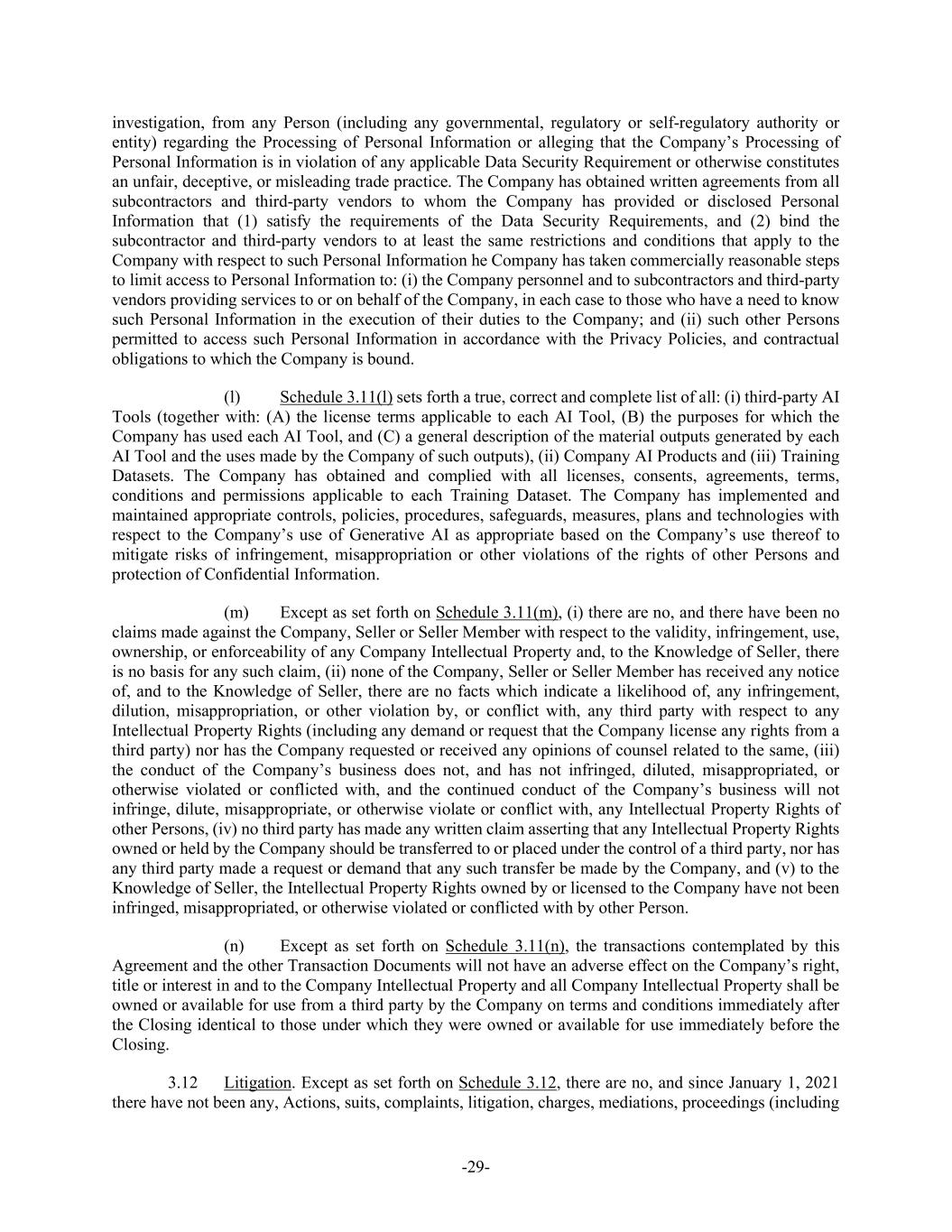 -29- investigation, from any Person (including any governmental, regulatory or self-regulatory authority or entity) regarding the Processing of Personal Information or alleging that the Company’s Processing of Personal Information is in violation of any applicable Data Security Requirement or otherwise constitutes an unfair, deceptive, or misleading trade practice. The Company has obtained written agreements from all subcontractors and third-party vendors to whom the Company has provided or disclosed Personal Information that (1) satisfy the requirements of the Data Security Requirements, and (2) bind the subcontractor and third-party vendors to at least the same restrictions and conditions that apply to the Company with respect to such Personal Information he Company has taken commercially reasonable steps to limit access to Personal Information to: (i) the Company personnel and to subcontractors and third-party vendors providing services to or on behalf of the Company, in each case to those who have a need to know such Personal Information in the execution of their duties to the Company; and (ii) such other Persons permitted to access such Personal Information in accordance with the Privacy Policies, and contractual obligations to which the Company is bound. (l) Schedule 3.11(l) sets forth a true, correct and complete list of all: (i) third-party AI Tools (together with: (A) the license terms applicable to each AI Tool, (B) the purposes for which the Company has used each AI Tool, and (C) a general description of the material outputs generated by each AI Tool and the uses made by the Company of such outputs), (ii) Company AI Products and (iii) Training Datasets. The Company has obtained and complied with all licenses, consents, agreements, terms, conditions and permissions applicable to each Training Dataset. The Company has implemented and maintained appropriate controls, policies, procedures, safeguards, measures, plans and technologies with respect to the Company’s use of Generative AI as appropriate based on the Company’s use thereof to mitigate risks of infringement, misappropriation or other violations of the rights of other Persons and protection of Confidential Information. (m) Except as set forth on Schedule 3.11(m), (i) there are no, and there have been no claims made against the Company, Seller or Seller Member with respect to the validity, infringement, use, ownership, or enforceability of any Company Intellectual Property and, to the Knowledge of Seller, there is no basis for any such claim, (ii) none of the Company, Seller or Seller Member has received any notice of, and to the Knowledge of Seller, there are no facts which indicate a likelihood of, any infringement, dilution, misappropriation, or other violation by, or conflict with, any third party with respect to any Intellectual Property Rights (including any demand or request that the Company license any rights from a third party) nor has the Company requested or received any opinions of counsel related to the same, (iii) the conduct of the Company’s business does not, and has not infringed, diluted, misappropriated, or otherwise violated or conflicted with, and the continued conduct of the Company’s business will not infringe, dilute, misappropriate, or otherwise violate or conflict with, any Intellectual Property Rights of other Persons, (iv) no third party has made any written claim asserting that any Intellectual Property Rights owned or held by the Company should be transferred to or placed under the control of a third party, nor has any third party made a request or demand that any such transfer be made by the Company, and (v) to the Knowledge of Seller, the Intellectual Property Rights owned by or licensed to the Company have not been infringed, misappropriated, or otherwise violated or conflicted with by other Person. (n) Except as set forth on Schedule 3.11(n), the transactions contemplated by this Agreement and the other Transaction Documents will not have an adverse effect on the Company’s right, title or interest in and to the Company Intellectual Property and all Company Intellectual Property shall be owned or available for use from a third party by the Company on terms and conditions immediately after the Closing identical to those under which they were owned or available for use immediately before the Closing. 3.12 Litigation. Except as set forth on Schedule 3.12, there are no, and since January 1, 2021 there have not been any, Actions, suits, complaints, litigation, charges, mediations, proceedings (including