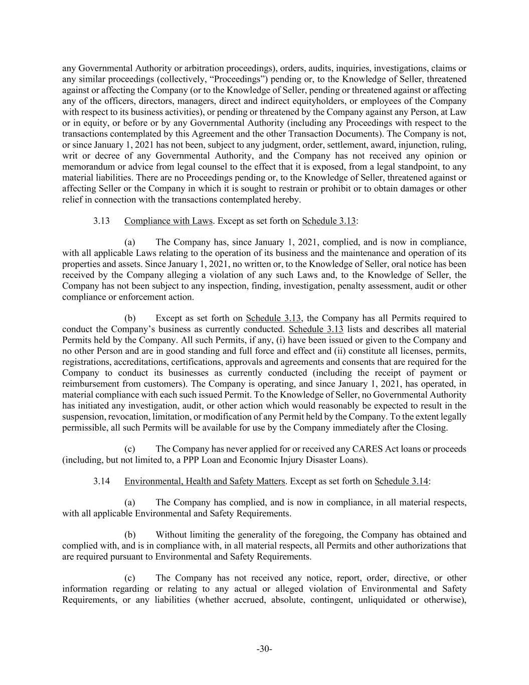 -30- any Governmental Authority or arbitration proceedings), orders, audits, inquiries, investigations, claims or any similar proceedings (collectively, “Proceedings”) pending or, to the Knowledge of Seller, threatened against or affecting the Company (or to the Knowledge of Seller, pending or threatened against or affecting any of the officers, directors, managers, direct and indirect equityholders, or employees of the Company with respect to its business activities), or pending or threatened by the Company against any Person, at Law or in equity, or before or by any Governmental Authority (including any Proceedings with respect to the transactions contemplated by this Agreement and the other Transaction Documents). The Company is not, or since January 1, 2021 has not been, subject to any judgment, order, settlement, award, injunction, ruling, writ or decree of any Governmental Authority, and the Company has not received any opinion or memorandum or advice from legal counsel to the effect that it is exposed, from a legal standpoint, to any material liabilities. There are no Proceedings pending or, to the Knowledge of Seller, threatened against or affecting Seller or the Company in which it is sought to restrain or prohibit or to obtain damages or other relief in connection with the transactions contemplated hereby. 3.13 Compliance with Laws. Except as set forth on Schedule 3.13: (a) The Company has, since January 1, 2021, complied, and is now in compliance, with all applicable Laws relating to the operation of its business and the maintenance and operation of its properties and assets. Since January 1, 2021, no written or, to the Knowledge of Seller, oral notice has been received by the Company alleging a violation of any such Laws and, to the Knowledge of Seller, the Company has not been subject to any inspection, finding, investigation, penalty assessment, audit or other compliance or enforcement action. (b) Except as set forth on Schedule 3.13, the Company has all Permits required to conduct the Company’s business as currently conducted. Schedule 3.13 lists and describes all material Permits held by the Company. All such Permits, if any, (i) have been issued or given to the Company and no other Person and are in good standing and full force and effect and (ii) constitute all licenses, permits, registrations, accreditations, certifications, approvals and agreements and consents that are required for the Company to conduct its businesses as currently conducted (including the receipt of payment or reimbursement from customers). The Company is operating, and since January 1, 2021, has operated, in material compliance with each such issued Permit. To the Knowledge of Seller, no Governmental Authority has initiated any investigation, audit, or other action which would reasonably be expected to result in the suspension, revocation, limitation, or modification of any Permit held by the Company. To the extent legally permissible, all such Permits will be available for use by the Company immediately after the Closing. (c) The Company has never applied for or received any CARES Act loans or proceeds (including, but not limited to, a PPP Loan and Economic Injury Disaster Loans). 3.14 Environmental, Health and Safety Matters. Except as set forth on Schedule 3.14: (a) The Company has complied, and is now in compliance, in all material respects, with all applicable Environmental and Safety Requirements. (b) Without limiting the generality of the foregoing, the Company has obtained and complied with, and is in compliance with, in all material respects, all Permits and other authorizations that are required pursuant to Environmental and Safety Requirements. (c) The Company has not received any notice, report, order, directive, or other information regarding or relating to any actual or alleged violation of Environmental and Safety Requirements, or any liabilities (whether accrued, absolute, contingent, unliquidated or otherwise),