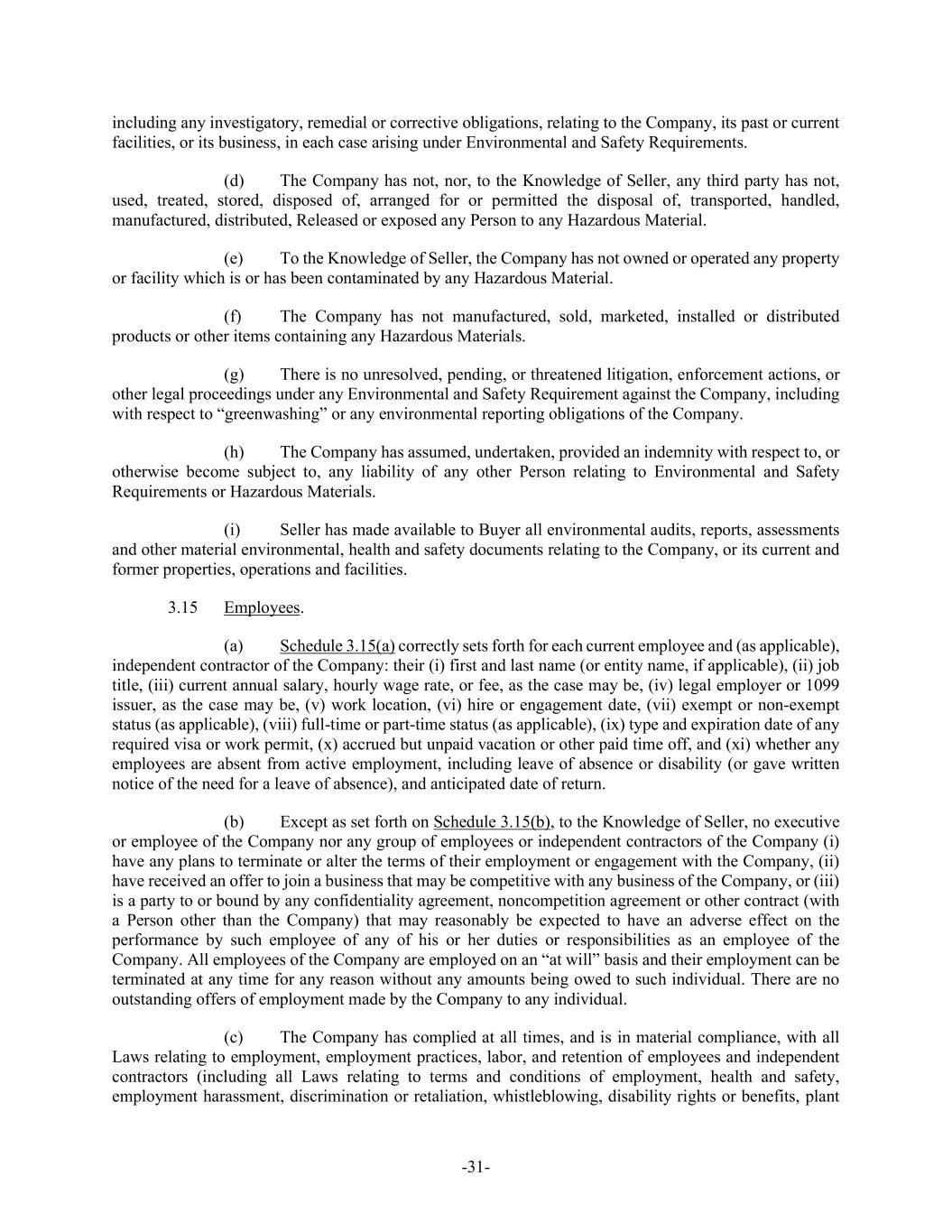 -31- including any investigatory, remedial or corrective obligations, relating to the Company, its past or current facilities, or its business, in each case arising under Environmental and Safety Requirements. (d) The Company has not, nor, to the Knowledge of Seller, any third party has not, used, treated, stored, disposed of, arranged for or permitted the disposal of, transported, handled, manufactured, distributed, Released or exposed any Person to any Hazardous Material. (e) To the Knowledge of Seller, the Company has not owned or operated any property or facility which is or has been contaminated by any Hazardous Material. (f) The Company has not manufactured, sold, marketed, installed or distributed products or other items containing any Hazardous Materials. (g) There is no unresolved, pending, or threatened litigation, enforcement actions, or other legal proceedings under any Environmental and Safety Requirement against the Company, including with respect to “greenwashing” or any environmental reporting obligations of the Company. (h) The Company has assumed, undertaken, provided an indemnity with respect to, or otherwise become subject to, any liability of any other Person relating to Environmental and Safety Requirements or Hazardous Materials. (i) Seller has made available to Buyer all environmental audits, reports, assessments and other material environmental, health and safety documents relating to the Company, or its current and former properties, operations and facilities. 3.15 Employees. (a) Schedule 3.15(a) correctly sets forth for each current employee and (as applicable), independent contractor of the Company: their (i) first and last name (or entity name, if applicable), (ii) job title, (iii) current annual salary, hourly wage rate, or fee, as the case may be, (iv) legal employer or 1099 issuer, as the case may be, (v) work location, (vi) hire or engagement date, (vii) exempt or non-exempt status (as applicable), (viii) full-time or part-time status (as applicable), (ix) type and expiration date of any required visa or work permit, (x) accrued but unpaid vacation or other paid time off, and (xi) whether any employees are absent from active employment, including leave of absence or disability (or gave written notice of the need for a leave of absence), and anticipated date of return. (b) Except as set forth on Schedule 3.15(b), to the Knowledge of Seller, no executive or employee of the Company nor any group of employees or independent contractors of the Company (i) have any plans to terminate or alter the terms of their employment or engagement with the Company, (ii) have received an offer to join a business that may be competitive with any business of the Company, or (iii) is a party to or bound by any confidentiality agreement, noncompetition agreement or other contract (with a Person other than the Company) that may reasonably be expected to have an adverse effect on the performance by such employee of any of his or her duties or responsibilities as an employee of the Company. All employees of the Company are employed on an “at will” basis and their employment can be terminated at any time for any reason without any amounts being owed to such individual. There are no outstanding offers of employment made by the Company to any individual. (c) The Company has complied at all times, and is in material compliance, with all Laws relating to employment, employment practices, labor, and retention of employees and independent contractors (including all Laws relating to terms and conditions of employment, health and safety, employment harassment, discrimination or retaliation, whistleblowing, disability rights or benefits, plant