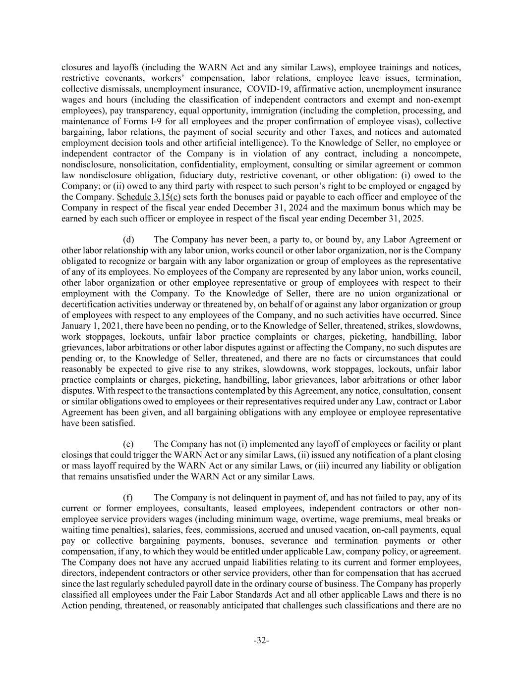 -32- closures and layoffs (including the WARN Act and any similar Laws), employee trainings and notices, restrictive covenants, workers’ compensation, labor relations, employee leave issues, termination, collective dismissals, unemployment insurance, COVID-19, affirmative action, unemployment insurance wages and hours (including the classification of independent contractors and exempt and non-exempt employees), pay transparency, equal opportunity, immigration (including the completion, processing, and maintenance of Forms I-9 for all employees and the proper confirmation of employee visas), collective bargaining, labor relations, the payment of social security and other Taxes, and notices and automated employment decision tools and other artificial intelligence). To the Knowledge of Seller, no employee or independent contractor of the Company is in violation of any contract, including a noncompete, nondisclosure, nonsolicitation, confidentiality, employment, consulting or similar agreement or common law nondisclosure obligation, fiduciary duty, restrictive covenant, or other obligation: (i) owed to the Company; or (ii) owed to any third party with respect to such person’s right to be employed or engaged by the Company. Schedule 3.15(c) sets forth the bonuses paid or payable to each officer and employee of the Company in respect of the fiscal year ended December 31, 2024 and the maximum bonus which may be earned by each such officer or employee in respect of the fiscal year ending December 31, 2025. (d) The Company has never been, a party to, or bound by, any Labor Agreement or other labor relationship with any labor union, works council or other labor organization, nor is the Company obligated to recognize or bargain with any labor organization or group of employees as the representative of any of its employees. No employees of the Company are represented by any labor union, works council, other labor organization or other employee representative or group of employees with respect to their employment with the Company. To the Knowledge of Seller, there are no union organizational or decertification activities underway or threatened by, on behalf of or against any labor organization or group of employees with respect to any employees of the Company, and no such activities have occurred. Since January 1, 2021, there have been no pending, or to the Knowledge of Seller, threatened, strikes, slowdowns, work stoppages, lockouts, unfair labor practice complaints or charges, picketing, handbilling, labor grievances, labor arbitrations or other labor disputes against or affecting the Company, no such disputes are pending or, to the Knowledge of Seller, threatened, and there are no facts or circumstances that could reasonably be expected to give rise to any strikes, slowdowns, work stoppages, lockouts, unfair labor practice complaints or charges, picketing, handbilling, labor grievances, labor arbitrations or other labor disputes. With respect to the transactions contemplated by this Agreement, any notice, consultation, consent or similar obligations owed to employees or their representatives required under any Law, contract or Labor Agreement has been given, and all bargaining obligations with any employee or employee representative have been satisfied. (e) The Company has not (i) implemented any layoff of employees or facility or plant closings that could trigger the WARN Act or any similar Laws, (ii) issued any notification of a plant closing or mass layoff required by the WARN Act or any similar Laws, or (iii) incurred any liability or obligation that remains unsatisfied under the WARN Act or any similar Laws. (f) The Company is not delinquent in payment of, and has not failed to pay, any of its current or former employees, consultants, leased employees, independent contractors or other non- employee service providers wages (including minimum wage, overtime, wage premiums, meal breaks or waiting time penalties), salaries, fees, commissions, accrued and unused vacation, on-call payments, equal pay or collective bargaining payments, bonuses, severance and termination payments or other compensation, if any, to which they would be entitled under applicable Law, company policy, or agreement. The Company does not have any accrued unpaid liabilities relating to its current and former employees, directors, independent contractors or other service providers, other than for compensation that has accrued since the last regularly scheduled payroll date in the ordinary course of business. The Company has properly classified all employees under the Fair Labor Standards Act and all other applicable Laws and there is no Action pending, threatened, or reasonably anticipated that challenges such classifications and there are no