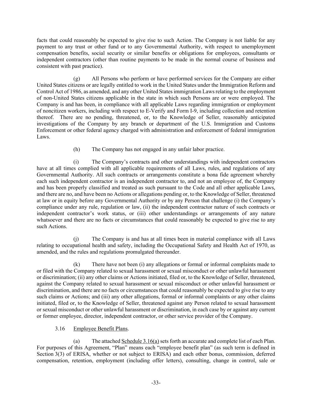 -33- facts that could reasonably be expected to give rise to such Action. The Company is not liable for any payment to any trust or other fund or to any Governmental Authority, with respect to unemployment compensation benefits, social security or similar benefits or obligations for employees, consultants or independent contractors (other than routine payments to be made in the normal course of business and consistent with past practice). (g) All Persons who perform or have performed services for the Company are either United States citizens or are legally entitled to work in the United States under the Immigration Reform and Control Act of 1986, as amended, and any other United States immigration Laws relating to the employment of non-United States citizens applicable in the state in which such Persons are or were employed. The Company is and has been, in compliance with all applicable Laws regarding immigration or employment of noncitizen workers, including with respect to E-Verify and Form I-9, including collection and retention thereof. There are no pending, threatened, or, to the Knowledge of Seller, reasonably anticipated investigations of the Company by any branch or department of the U.S. Immigration and Customs Enforcement or other federal agency charged with administration and enforcement of federal immigration Laws. (h) The Company has not engaged in any unfair labor practice. (i) The Company’s contracts and other understandings with independent contractors have at all times complied with all applicable requirements of all Laws, rules, and regulations of any Governmental Authority. All such contracts or arrangements constitute a bona fide agreement whereby each such independent contractor is an independent contractor to, and not an employee of, the Company and has been properly classified and treated as such pursuant to the Code and all other applicable Laws, and there are no, and have been no Actions or allegations pending or, to the Knowledge of Seller, threatened at law or in equity before any Governmental Authority or by any Person that challenge (i) the Company’s compliance under any rule, regulation or law, (ii) the independent contractor nature of such contracts or independent contractor’s work status, or (iii) other understandings or arrangements of any nature whatsoever and there are no facts or circumstances that could reasonably be expected to give rise to any such Actions. (j) The Company is and has at all times been in material compliance with all Laws relating to occupational health and safety, including the Occupational Safety and Health Act of 1970, as amended, and the rules and regulations promulgated thereunder. (k) There have not been (i) any allegations or formal or informal complaints made to or filed with the Company related to sexual harassment or sexual misconduct or other unlawful harassment or discrimination; (ii) any other claims or Actions initiated, filed or, to the Knowledge of Seller, threatened, against the Company related to sexual harassment or sexual misconduct or other unlawful harassment or discrimination, and there are no facts or circumstances that could reasonably be expected to give rise to any such claims or Actions; and (iii) any other allegations, formal or informal complaints or any other claims initiated, filed or, to the Knowledge of Seller, threatened against any Person related to sexual harassment or sexual misconduct or other unlawful harassment or discrimination, in each case by or against any current or former employee, director, independent contractor, or other service provider of the Company. 3.16 Employee Benefit Plans. (a) The attached Schedule 3.16(a) sets forth an accurate and complete list of each Plan. For purposes of this Agreement, “Plan” means each “employee benefit plan” (as such term is defined in Section 3(3) of ERISA, whether or not subject to ERISA) and each other bonus, commission, deferred compensation, retention, employment (including offer letters), consulting, change in control, sale or