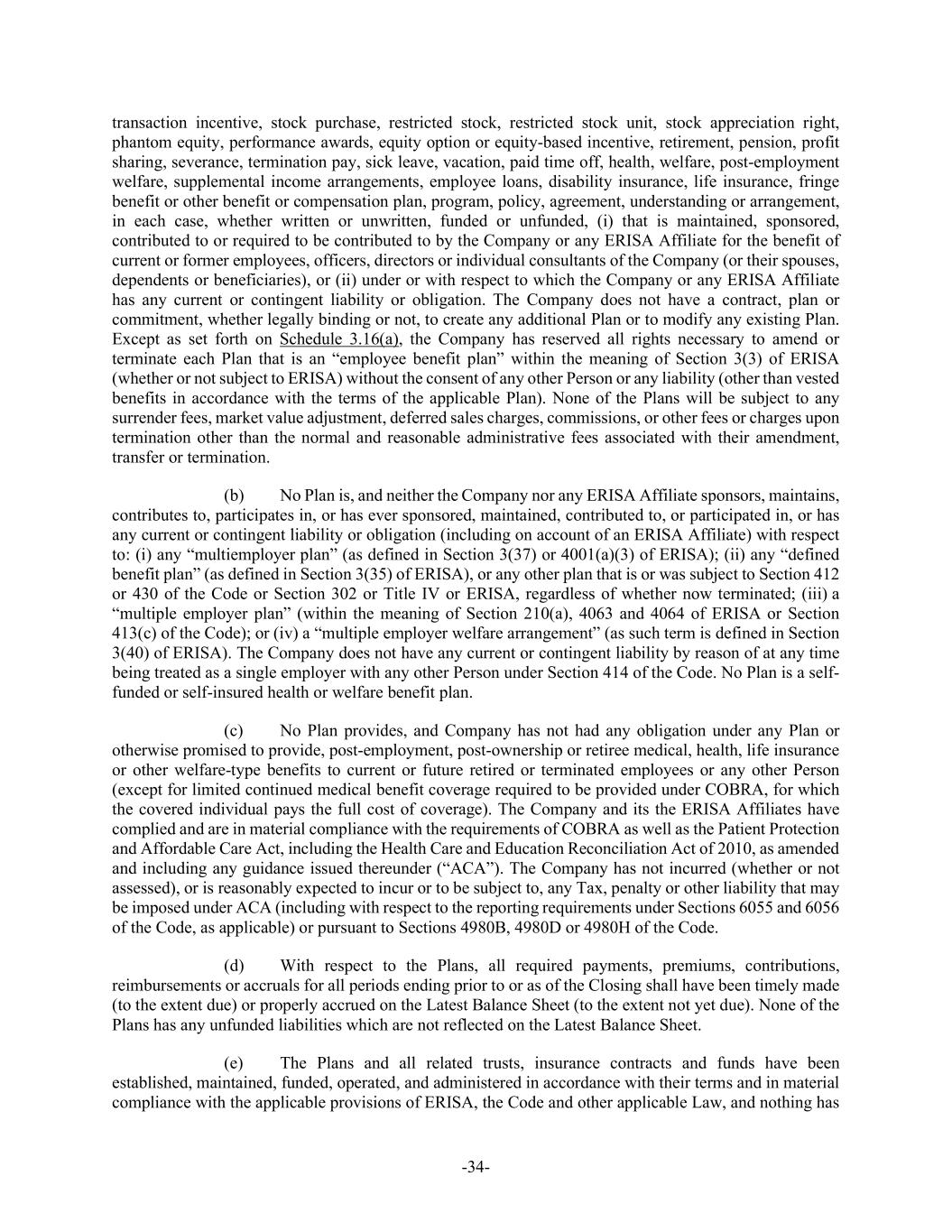-34- transaction incentive, stock purchase, restricted stock, restricted stock unit, stock appreciation right, phantom equity, performance awards, equity option or equity-based incentive, retirement, pension, profit sharing, severance, termination pay, sick leave, vacation, paid time off, health, welfare, post-employment welfare, supplemental income arrangements, employee loans, disability insurance, life insurance, fringe benefit or other benefit or compensation plan, program, policy, agreement, understanding or arrangement, in each case, whether written or unwritten, funded or unfunded, (i) that is maintained, sponsored, contributed to or required to be contributed to by the Company or any ERISA Affiliate for the benefit of current or former employees, officers, directors or individual consultants of the Company (or their spouses, dependents or beneficiaries), or (ii) under or with respect to which the Company or any ERISA Affiliate has any current or contingent liability or obligation. The Company does not have a contract, plan or commitment, whether legally binding or not, to create any additional Plan or to modify any existing Plan. Except as set forth on Schedule 3.16(a), the Company has reserved all rights necessary to amend or terminate each Plan that is an “employee benefit plan” within the meaning of Section 3(3) of ERISA (whether or not subject to ERISA) without the consent of any other Person or any liability (other than vested benefits in accordance with the terms of the applicable Plan). None of the Plans will be subject to any surrender fees, market value adjustment, deferred sales charges, commissions, or other fees or charges upon termination other than the normal and reasonable administrative fees associated with their amendment, transfer or termination. (b) No Plan is, and neither the Company nor any ERISA Affiliate sponsors, maintains, contributes to, participates in, or has ever sponsored, maintained, contributed to, or participated in, or has any current or contingent liability or obligation (including on account of an ERISA Affiliate) with respect to: (i) any “multiemployer plan” (as defined in Section 3(37) or 4001(a)(3) of ERISA); (ii) any “defined benefit plan” (as defined in Section 3(35) of ERISA), or any other plan that is or was subject to Section 412 or 430 of the Code or Section 302 or Title IV or ERISA, regardless of whether now terminated; (iii) a “multiple employer plan” (within the meaning of Section 210(a), 4063 and 4064 of ERISA or Section 413(c) of the Code); or (iv) a “multiple employer welfare arrangement” (as such term is defined in Section 3(40) of ERISA). The Company does not have any current or contingent liability by reason of at any time being treated as a single employer with any other Person under Section 414 of the Code. No Plan is a self- funded or self-insured health or welfare benefit plan. (c) No Plan provides, and Company has not had any obligation under any Plan or otherwise promised to provide, post-employment, post-ownership or retiree medical, health, life insurance or other welfare-type benefits to current or future retired or terminated employees or any other Person (except for limited continued medical benefit coverage required to be provided under COBRA, for which the covered individual pays the full cost of coverage). The Company and its the ERISA Affiliates have complied and are in material compliance with the requirements of COBRA as well as the Patient Protection and Affordable Care Act, including the Health Care and Education Reconciliation Act of 2010, as amended and including any guidance issued thereunder (“ACA”). The Company has not incurred (whether or not assessed), or is reasonably expected to incur or to be subject to, any Tax, penalty or other liability that may be imposed under ACA (including with respect to the reporting requirements under Sections 6055 and 6056 of the Code, as applicable) or pursuant to Sections 4980B, 4980D or 4980H of the Code. (d) With respect to the Plans, all required payments, premiums, contributions, reimbursements or accruals for all periods ending prior to or as of the Closing shall have been timely made (to the extent due) or properly accrued on the Latest Balance Sheet (to the extent not yet due). None of the Plans has any unfunded liabilities which are not reflected on the Latest Balance Sheet. (e) The Plans and all related trusts, insurance contracts and funds have been established, maintained, funded, operated, and administered in accordance with their terms and in material compliance with the applicable provisions of ERISA, the Code and other applicable Law, and nothing has
