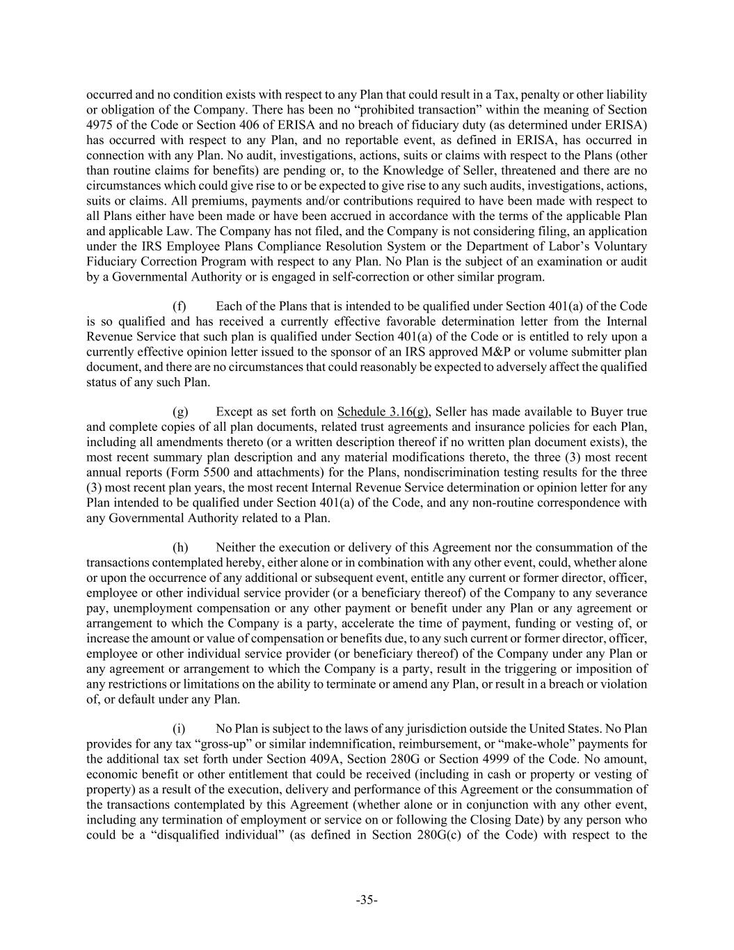 -35- occurred and no condition exists with respect to any Plan that could result in a Tax, penalty or other liability or obligation of the Company. There has been no “prohibited transaction” within the meaning of Section 4975 of the Code or Section 406 of ERISA and no breach of fiduciary duty (as determined under ERISA) has occurred with respect to any Plan, and no reportable event, as defined in ERISA, has occurred in connection with any Plan. No audit, investigations, actions, suits or claims with respect to the Plans (other than routine claims for benefits) are pending or, to the Knowledge of Seller, threatened and there are no circumstances which could give rise to or be expected to give rise to any such audits, investigations, actions, suits or claims. All premiums, payments and/or contributions required to have been made with respect to all Plans either have been made or have been accrued in accordance with the terms of the applicable Plan and applicable Law. The Company has not filed, and the Company is not considering filing, an application under the IRS Employee Plans Compliance Resolution System or the Department of Labor’s Voluntary Fiduciary Correction Program with respect to any Plan. No Plan is the subject of an examination or audit by a Governmental Authority or is engaged in self-correction or other similar program. (f) Each of the Plans that is intended to be qualified under Section 401(a) of the Code is so qualified and has received a currently effective favorable determination letter from the Internal Revenue Service that such plan is qualified under Section 401(a) of the Code or is entitled to rely upon a currently effective opinion letter issued to the sponsor of an IRS approved M&P or volume submitter plan document, and there are no circumstances that could reasonably be expected to adversely affect the qualified status of any such Plan. (g) Except as set forth on Schedule 3.16(g), Seller has made available to Buyer true and complete copies of all plan documents, related trust agreements and insurance policies for each Plan, including all amendments thereto (or a written description thereof if no written plan document exists), the most recent summary plan description and any material modifications thereto, the three (3) most recent annual reports (Form 5500 and attachments) for the Plans, nondiscrimination testing results for the three (3) most recent plan years, the most recent Internal Revenue Service determination or opinion letter for any Plan intended to be qualified under Section 401(a) of the Code, and any non-routine correspondence with any Governmental Authority related to a Plan. (h) Neither the execution or delivery of this Agreement nor the consummation of the transactions contemplated hereby, either alone or in combination with any other event, could, whether alone or upon the occurrence of any additional or subsequent event, entitle any current or former director, officer, employee or other individual service provider (or a beneficiary thereof) of the Company to any severance pay, unemployment compensation or any other payment or benefit under any Plan or any agreement or arrangement to which the Company is a party, accelerate the time of payment, funding or vesting of, or increase the amount or value of compensation or benefits due, to any such current or former director, officer, employee or other individual service provider (or beneficiary thereof) of the Company under any Plan or any agreement or arrangement to which the Company is a party, result in the triggering or imposition of any restrictions or limitations on the ability to terminate or amend any Plan, or result in a breach or violation of, or default under any Plan. (i) No Plan is subject to the laws of any jurisdiction outside the United States. No Plan provides for any tax “gross-up” or similar indemnification, reimbursement, or “make-whole” payments for the additional tax set forth under Section 409A, Section 280G or Section 4999 of the Code. No amount, economic benefit or other entitlement that could be received (including in cash or property or vesting of property) as a result of the execution, delivery and performance of this Agreement or the consummation of the transactions contemplated by this Agreement (whether alone or in conjunction with any other event, including any termination of employment or service on or following the Closing Date) by any person who could be a “disqualified individual” (as defined in Section 280G(c) of the Code) with respect to the