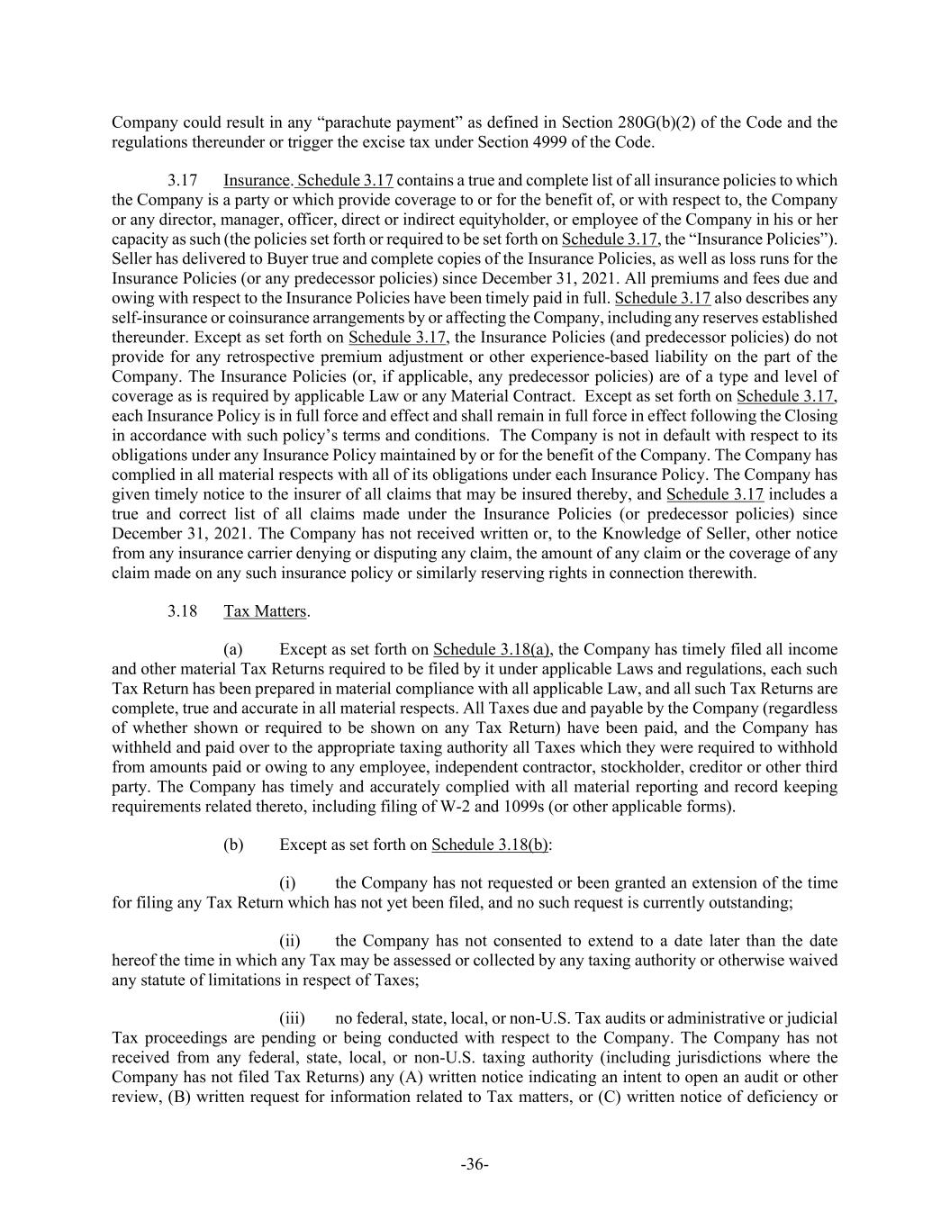 -36- Company could result in any “parachute payment” as defined in Section 280G(b)(2) of the Code and the regulations thereunder or trigger the excise tax under Section 4999 of the Code. 3.17 Insurance. Schedule 3.17 contains a true and complete list of all insurance policies to which the Company is a party or which provide coverage to or for the benefit of, or with respect to, the Company or any director, manager, officer, direct or indirect equityholder, or employee of the Company in his or her capacity as such (the policies set forth or required to be set forth on Schedule 3.17, the “Insurance Policies”). Seller has delivered to Buyer true and complete copies of the Insurance Policies, as well as loss runs for the Insurance Policies (or any predecessor policies) since December 31, 2021. All premiums and fees due and owing with respect to the Insurance Policies have been timely paid in full. Schedule 3.17 also describes any self-insurance or coinsurance arrangements by or affecting the Company, including any reserves established thereunder. Except as set forth on Schedule 3.17, the Insurance Policies (and predecessor policies) do not provide for any retrospective premium adjustment or other experience-based liability on the part of the Company. The Insurance Policies (or, if applicable, any predecessor policies) are of a type and level of coverage as is required by applicable Law or any Material Contract. Except as set forth on Schedule 3.17, each Insurance Policy is in full force and effect and shall remain in full force in effect following the Closing in accordance with such policy’s terms and conditions. The Company is not in default with respect to its obligations under any Insurance Policy maintained by or for the benefit of the Company. The Company has complied in all material respects with all of its obligations under each Insurance Policy. The Company has given timely notice to the insurer of all claims that may be insured thereby, and Schedule 3.17 includes a true and correct list of all claims made under the Insurance Policies (or predecessor policies) since December 31, 2021. The Company has not received written or, to the Knowledge of Seller, other notice from any insurance carrier denying or disputing any claim, the amount of any claim or the coverage of any claim made on any such insurance policy or similarly reserving rights in connection therewith. 3.18 Tax Matters. (a) Except as set forth on Schedule 3.18(a), the Company has timely filed all income and other material Tax Returns required to be filed by it under applicable Laws and regulations, each such Tax Return has been prepared in material compliance with all applicable Law, and all such Tax Returns are complete, true and accurate in all material respects. All Taxes due and payable by the Company (regardless of whether shown or required to be shown on any Tax Return) have been paid, and the Company has withheld and paid over to the appropriate taxing authority all Taxes which they were required to withhold from amounts paid or owing to any employee, independent contractor, stockholder, creditor or other third party. The Company has timely and accurately complied with all material reporting and record keeping requirements related thereto, including filing of W-2 and 1099s (or other applicable forms). (b) Except as set forth on Schedule 3.18(b): (i) the Company has not requested or been granted an extension of the time for filing any Tax Return which has not yet been filed, and no such request is currently outstanding; (ii) the Company has not consented to extend to a date later than the date hereof the time in which any Tax may be assessed or collected by any taxing authority or otherwise waived any statute of limitations in respect of Taxes; (iii) no federal, state, local, or non-U.S. Tax audits or administrative or judicial Tax proceedings are pending or being conducted with respect to the Company. The Company has not received from any federal, state, local, or non-U.S. taxing authority (including jurisdictions where the Company has not filed Tax Returns) any (A) written notice indicating an intent to open an audit or other review, (B) written request for information related to Tax matters, or (C) written notice of deficiency or