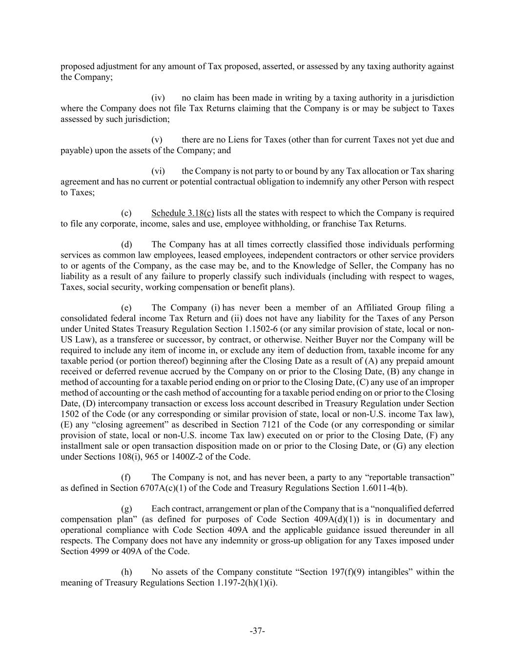 -37- proposed adjustment for any amount of Tax proposed, asserted, or assessed by any taxing authority against the Company; (iv) no claim has been made in writing by a taxing authority in a jurisdiction where the Company does not file Tax Returns claiming that the Company is or may be subject to Taxes assessed by such jurisdiction; (v) there are no Liens for Taxes (other than for current Taxes not yet due and payable) upon the assets of the Company; and (vi) the Company is not party to or bound by any Tax allocation or Tax sharing agreement and has no current or potential contractual obligation to indemnify any other Person with respect to Taxes; (c) Schedule 3.18(c) lists all the states with respect to which the Company is required to file any corporate, income, sales and use, employee withholding, or franchise Tax Returns. (d) The Company has at all times correctly classified those individuals performing services as common law employees, leased employees, independent contractors or other service providers to or agents of the Company, as the case may be, and to the Knowledge of Seller, the Company has no liability as a result of any failure to properly classify such individuals (including with respect to wages, Taxes, social security, working compensation or benefit plans). (e) The Company (i) has never been a member of an Affiliated Group filing a consolidated federal income Tax Return and (ii) does not have any liability for the Taxes of any Person under United States Treasury Regulation Section 1.1502-6 (or any similar provision of state, local or non- US Law), as a transferee or successor, by contract, or otherwise. Neither Buyer nor the Company will be required to include any item of income in, or exclude any item of deduction from, taxable income for any taxable period (or portion thereof) beginning after the Closing Date as a result of (A) any prepaid amount received or deferred revenue accrued by the Company on or prior to the Closing Date, (B) any change in method of accounting for a taxable period ending on or prior to the Closing Date, (C) any use of an improper method of accounting or the cash method of accounting for a taxable period ending on or prior to the Closing Date, (D) intercompany transaction or excess loss account described in Treasury Regulation under Section 1502 of the Code (or any corresponding or similar provision of state, local or non-U.S. income Tax law), (E) any “closing agreement” as described in Section 7121 of the Code (or any corresponding or similar provision of state, local or non-U.S. income Tax law) executed on or prior to the Closing Date, (F) any installment sale or open transaction disposition made on or prior to the Closing Date, or (G) any election under Sections 108(i), 965 or 1400Z-2 of the Code. (f) The Company is not, and has never been, a party to any “reportable transaction” as defined in Section 6707A(c)(1) of the Code and Treasury Regulations Section 1.6011-4(b). (g) Each contract, arrangement or plan of the Company that is a “nonqualified deferred compensation plan” (as defined for purposes of Code Section 409A(d)(1)) is in documentary and operational compliance with Code Section 409A and the applicable guidance issued thereunder in all respects. The Company does not have any indemnity or gross-up obligation for any Taxes imposed under Section 4999 or 409A of the Code. (h) No assets of the Company constitute “Section 197(f)(9) intangibles” within the meaning of Treasury Regulations Section 1.197-2(h)(1)(i).