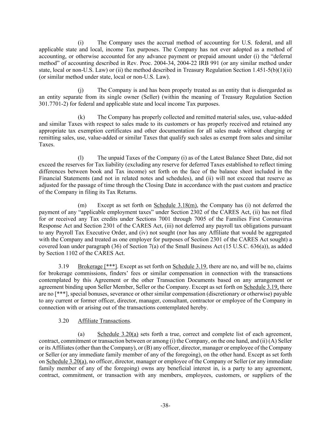 -38- (i) The Company uses the accrual method of accounting for U.S. federal, and all applicable state and local, income Tax purposes. The Company has not ever adopted as a method of accounting, or otherwise accounted for any advance payment or prepaid amount under (i) the “deferral method” of accounting described in Rev. Proc. 2004-34, 2004-22 IRB 991 (or any similar method under state, local or non-U.S. Law) or (ii) the method described in Treasury Regulation Section 1.451-5(b)(1)(ii) (or similar method under state, local or non-U.S. Law). (j) The Company is and has been properly treated as an entity that is disregarded as an entity separate from its single owner (Seller) (within the meaning of Treasury Regulation Section 301.7701-2) for federal and applicable state and local income Tax purposes. (k) The Company has properly collected and remitted material sales, use, value-added and similar Taxes with respect to sales made to its customers or has properly received and retained any appropriate tax exemption certificates and other documentation for all sales made without charging or remitting sales, use, value-added or similar Taxes that qualify such sales as exempt from sales and similar Taxes. (l) The unpaid Taxes of the Company (i) as of the Latest Balance Sheet Date, did not exceed the reserves for Tax liability (excluding any reserve for deferred Taxes established to reflect timing differences between book and Tax income) set forth on the face of the balance sheet included in the Financial Statements (and not in related notes and schedules), and (ii) will not exceed that reserve as adjusted for the passage of time through the Closing Date in accordance with the past custom and practice of the Company in filing its Tax Returns. (m) Except as set forth on Schedule 3.18(m), the Company has (i) not deferred the payment of any “applicable employment taxes” under Section 2302 of the CARES Act, (ii) has not filed for or received any Tax credits under Sections 7001 through 7005 of the Families First Coronavirus Response Act and Section 2301 of the CARES Act, (iii) not deferred any payroll tax obligations pursuant to any Payroll Tax Executive Order, and (iv) not sought (nor has any Affiliate that would be aggregated with the Company and treated as one employer for purposes of Section 2301 of the CARES Act sought) a covered loan under paragraph (36) of Section 7(a) of the Small Business Act (15 U.S.C. 636(a)), as added by Section 1102 of the CARES Act. 3.19 Brokerage [***]. Except as set forth on Schedule 3.19, there are no, and will be no, claims for brokerage commissions, finders’ fees or similar compensation in connection with the transactions contemplated by this Agreement or the other Transaction Documents based on any arrangement or agreement binding upon Seller Member, Seller or the Company. Except as set forth on Schedule 3.19, there are no [***], special bonuses, severance or other similar compensation (discretionary or otherwise) payable to any current or former officer, director, manager, consultant, contractor or employee of the Company in connection with or arising out of the transactions contemplated hereby. 3.20 Affiliate Transactions. (a) Schedule 3.20(a) sets forth a true, correct and complete list of each agreement, contract, commitment or transaction between or among (i) the Company, on the one hand, and (ii) (A) Seller or its Affiliates (other than the Company), or (B) any officer, director, manager or employee of the Company or Seller (or any immediate family member of any of the foregoing), on the other hand. Except as set forth on Schedule 3.20(a), no officer, director, manager or employee of the Company or Seller (or any immediate family member of any of the foregoing) owns any beneficial interest in, is a party to any agreement, contract, commitment, or transaction with any members, employees, customers, or suppliers of the