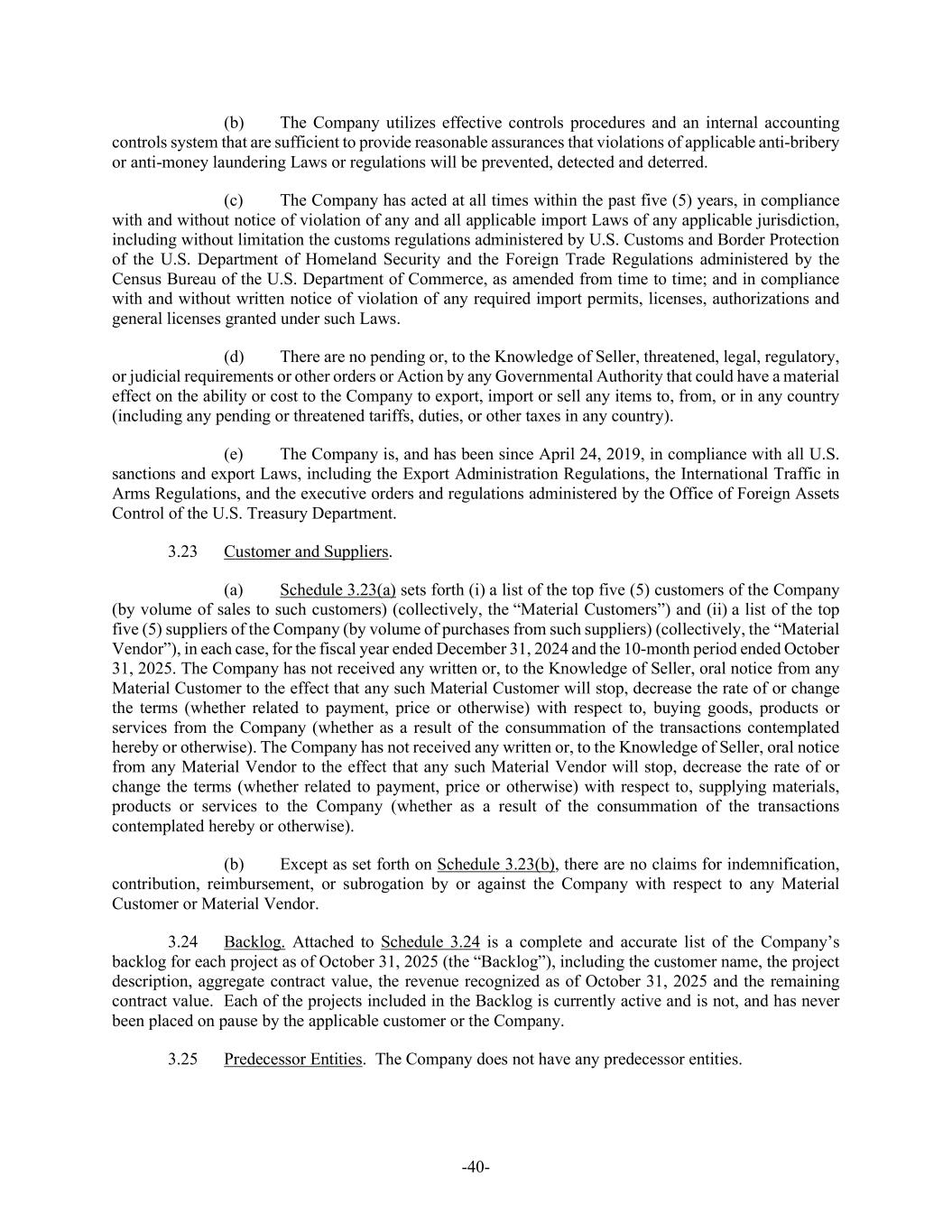 -40- (b) The Company utilizes effective controls procedures and an internal accounting controls system that are sufficient to provide reasonable assurances that violations of applicable anti-bribery or anti-money laundering Laws or regulations will be prevented, detected and deterred. (c) The Company has acted at all times within the past five (5) years, in compliance with and without notice of violation of any and all applicable import Laws of any applicable jurisdiction, including without limitation the customs regulations administered by U.S. Customs and Border Protection of the U.S. Department of Homeland Security and the Foreign Trade Regulations administered by the Census Bureau of the U.S. Department of Commerce, as amended from time to time; and in compliance with and without written notice of violation of any required import permits, licenses, authorizations and general licenses granted under such Laws. (d) There are no pending or, to the Knowledge of Seller, threatened, legal, regulatory, or judicial requirements or other orders or Action by any Governmental Authority that could have a material effect on the ability or cost to the Company to export, import or sell any items to, from, or in any country (including any pending or threatened tariffs, duties, or other taxes in any country). (e) The Company is, and has been since April 24, 2019, in compliance with all U.S. sanctions and export Laws, including the Export Administration Regulations, the International Traffic in Arms Regulations, and the executive orders and regulations administered by the Office of Foreign Assets Control of the U.S. Treasury Department. 3.23 Customer and Suppliers. (a) Schedule 3.23(a) sets forth (i) a list of the top five (5) customers of the Company (by volume of sales to such customers) (collectively, the “Material Customers”) and (ii) a list of the top five (5) suppliers of the Company (by volume of purchases from such suppliers) (collectively, the “Material Vendor”), in each case, for the fiscal year ended December 31, 2024 and the 10-month period ended October 31, 2025. The Company has not received any written or, to the Knowledge of Seller, oral notice from any Material Customer to the effect that any such Material Customer will stop, decrease the rate of or change the terms (whether related to payment, price or otherwise) with respect to, buying goods, products or services from the Company (whether as a result of the consummation of the transactions contemplated hereby or otherwise). The Company has not received any written or, to the Knowledge of Seller, oral notice from any Material Vendor to the effect that any such Material Vendor will stop, decrease the rate of or change the terms (whether related to payment, price or otherwise) with respect to, supplying materials, products or services to the Company (whether as a result of the consummation of the transactions contemplated hereby or otherwise). (b) Except as set forth on Schedule 3.23(b), there are no claims for indemnification, contribution, reimbursement, or subrogation by or against the Company with respect to any Material Customer or Material Vendor. 3.24 Backlog. Attached to Schedule 3.24 is a complete and accurate list of the Company’s backlog for each project as of October 31, 2025 (the “Backlog”), including the customer name, the project description, aggregate contract value, the revenue recognized as of October 31, 2025 and the remaining contract value. Each of the projects included in the Backlog is currently active and is not, and has never been placed on pause by the applicable customer or the Company. 3.25 Predecessor Entities. The Company does not have any predecessor entities.