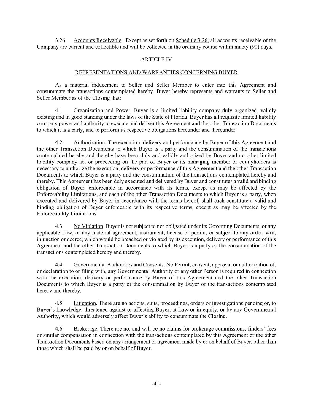 -41- 3.26 Accounts Receivable. Except as set forth on Schedule 3.26, all accounts receivable of the Company are current and collectible and will be collected in the ordinary course within ninety (90) days. ARTICLE IV REPRESENTATIONS AND WARRANTIES CONCERNING BUYER As a material inducement to Seller and Seller Member to enter into this Agreement and consummate the transactions contemplated hereby, Buyer hereby represents and warrants to Seller and Seller Member as of the Closing that: 4.1 Organization and Power. Buyer is a limited liability company duly organized, validly existing and in good standing under the laws of the State of Florida. Buyer has all requisite limited liability company power and authority to execute and deliver this Agreement and the other Transaction Documents to which it is a party, and to perform its respective obligations hereunder and thereunder. 4.2 Authorization. The execution, delivery and performance by Buyer of this Agreement and the other Transaction Documents to which Buyer is a party and the consummation of the transactions contemplated hereby and thereby have been duly and validly authorized by Buyer and no other limited liability company act or proceeding on the part of Buyer or its managing member or equityholders is necessary to authorize the execution, delivery or performance of this Agreement and the other Transaction Documents to which Buyer is a party and the consummation of the transactions contemplated hereby and thereby. This Agreement has been duly executed and delivered by Buyer and constitutes a valid and binding obligation of Buyer, enforceable in accordance with its terms, except as may be affected by the Enforceability Limitations, and each of the other Transaction Documents to which Buyer is a party, when executed and delivered by Buyer in accordance with the terms hereof, shall each constitute a valid and binding obligation of Buyer enforceable with its respective terms, except as may be affected by the Enforceability Limitations. 4.3 No Violation. Buyer is not subject to nor obligated under its Governing Documents, or any applicable Law, or any material agreement, instrument, license or permit, or subject to any order, writ, injunction or decree, which would be breached or violated by its execution, delivery or performance of this Agreement and the other Transaction Documents to which Buyer is a party or the consummation of the transactions contemplated hereby and thereby. 4.4 Governmental Authorities and Consents. No Permit, consent, approval or authorization of, or declaration to or filing with, any Governmental Authority or any other Person is required in connection with the execution, delivery or performance by Buyer of this Agreement and the other Transaction Documents to which Buyer is a party or the consummation by Buyer of the transactions contemplated hereby and thereby. 4.5 Litigation. There are no actions, suits, proceedings, orders or investigations pending or, to Buyer’s knowledge, threatened against or affecting Buyer, at Law or in equity, or by any Governmental Authority, which would adversely affect Buyer’s ability to consummate the Closing. 4.6 Brokerage. There are no, and will be no claims for brokerage commissions, finders’ fees or similar compensation in connection with the transactions contemplated by this Agreement or the other Transaction Documents based on any arrangement or agreement made by or on behalf of Buyer, other than those which shall be paid by or on behalf of Buyer.