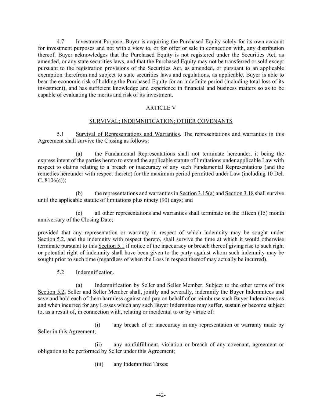 -42- 4.7 Investment Purpose. Buyer is acquiring the Purchased Equity solely for its own account for investment purposes and not with a view to, or for offer or sale in connection with, any distribution thereof. Buyer acknowledges that the Purchased Equity is not registered under the Securities Act, as amended, or any state securities laws, and that the Purchased Equity may not be transferred or sold except pursuant to the registration provisions of the Securities Act, as amended, or pursuant to an applicable exemption therefrom and subject to state securities laws and regulations, as applicable. Buyer is able to bear the economic risk of holding the Purchased Equity for an indefinite period (including total loss of its investment), and has sufficient knowledge and experience in financial and business matters so as to be capable of evaluating the merits and risk of its investment. ARTICLE V SURVIVAL; INDEMNIFICATION; OTHER COVENANTS 5.1 Survival of Representations and Warranties. The representations and warranties in this Agreement shall survive the Closing as follows: (a) the Fundamental Representations shall not terminate hereunder, it being the express intent of the parties hereto to extend the applicable statute of limitations under applicable Law with respect to claims relating to a breach or inaccuracy of any such Fundamental Representations (and the remedies hereunder with respect thereto) for the maximum period permitted under Law (including 10 Del. C. 8106(c)); (b) the representations and warranties in Section 3.15(a) and Section 3.18 shall survive until the applicable statute of limitations plus ninety (90) days; and (c) all other representations and warranties shall terminate on the fifteen (15) month anniversary of the Closing Date; provided that any representation or warranty in respect of which indemnity may be sought under Section 5.2, and the indemnity with respect thereto, shall survive the time at which it would otherwise terminate pursuant to this Section 5.1 if notice of the inaccuracy or breach thereof giving rise to such right or potential right of indemnity shall have been given to the party against whom such indemnity may be sought prior to such time (regardless of when the Loss in respect thereof may actually be incurred). 5.2 Indemnification. (a) Indemnification by Seller and Seller Member. Subject to the other terms of this Section 5.2, Seller and Seller Member shall, jointly and severally, indemnify the Buyer Indemnitees and save and hold each of them harmless against and pay on behalf of or reimburse such Buyer Indemnitees as and when incurred for any Losses which any such Buyer Indemnitee may suffer, sustain or become subject to, as a result of, in connection with, relating or incidental to or by virtue of: (i) any breach of or inaccuracy in any representation or warranty made by Seller in this Agreement; (ii) any nonfulfillment, violation or breach of any covenant, agreement or obligation to be performed by Seller under this Agreement; (iii) any Indemnified Taxes;