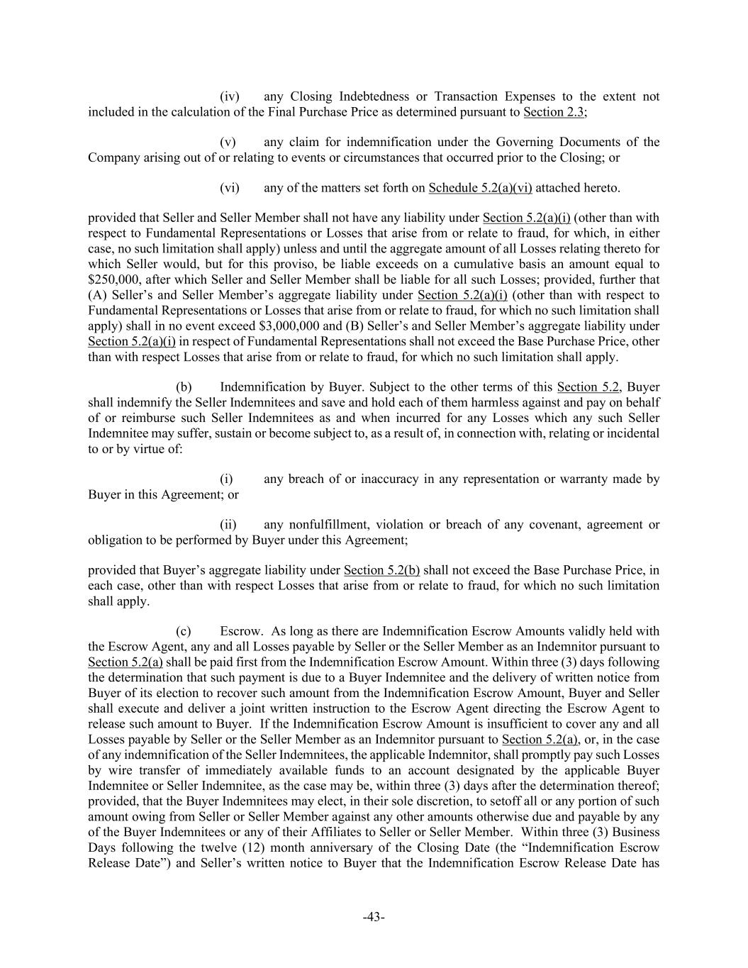 -43- (iv) any Closing Indebtedness or Transaction Expenses to the extent not included in the calculation of the Final Purchase Price as determined pursuant to Section 2.3; (v) any claim for indemnification under the Governing Documents of the Company arising out of or relating to events or circumstances that occurred prior to the Closing; or (vi) any of the matters set forth on Schedule 5.2(a)(vi) attached hereto. provided that Seller and Seller Member shall not have any liability under Section 5.2(a)(i) (other than with respect to Fundamental Representations or Losses that arise from or relate to fraud, for which, in either case, no such limitation shall apply) unless and until the aggregate amount of all Losses relating thereto for which Seller would, but for this proviso, be liable exceeds on a cumulative basis an amount equal to $250,000, after which Seller and Seller Member shall be liable for all such Losses; provided, further that (A) Seller’s and Seller Member’s aggregate liability under Section 5.2(a)(i) (other than with respect to Fundamental Representations or Losses that arise from or relate to fraud, for which no such limitation shall apply) shall in no event exceed $3,000,000 and (B) Seller’s and Seller Member’s aggregate liability under Section 5.2(a)(i) in respect of Fundamental Representations shall not exceed the Base Purchase Price, other than with respect Losses that arise from or relate to fraud, for which no such limitation shall apply. (b) Indemnification by Buyer. Subject to the other terms of this Section 5.2, Buyer shall indemnify the Seller Indemnitees and save and hold each of them harmless against and pay on behalf of or reimburse such Seller Indemnitees as and when incurred for any Losses which any such Seller Indemnitee may suffer, sustain or become subject to, as a result of, in connection with, relating or incidental to or by virtue of: (i) any breach of or inaccuracy in any representation or warranty made by Buyer in this Agreement; or (ii) any nonfulfillment, violation or breach of any covenant, agreement or obligation to be performed by Buyer under this Agreement; provided that Buyer’s aggregate liability under Section 5.2(b) shall not exceed the Base Purchase Price, in each case, other than with respect Losses that arise from or relate to fraud, for which no such limitation shall apply. (c) Escrow. As long as there are Indemnification Escrow Amounts validly held with the Escrow Agent, any and all Losses payable by Seller or the Seller Member as an Indemnitor pursuant to Section 5.2(a) shall be paid first from the Indemnification Escrow Amount. Within three (3) days following the determination that such payment is due to a Buyer Indemnitee and the delivery of written notice from Buyer of its election to recover such amount from the Indemnification Escrow Amount, Buyer and Seller shall execute and deliver a joint written instruction to the Escrow Agent directing the Escrow Agent to release such amount to Buyer. If the Indemnification Escrow Amount is insufficient to cover any and all Losses payable by Seller or the Seller Member as an Indemnitor pursuant to Section 5.2(a), or, in the case of any indemnification of the Seller Indemnitees, the applicable Indemnitor, shall promptly pay such Losses by wire transfer of immediately available funds to an account designated by the applicable Buyer Indemnitee or Seller Indemnitee, as the case may be, within three (3) days after the determination thereof; provided, that the Buyer Indemnitees may elect, in their sole discretion, to setoff all or any portion of such amount owing from Seller or Seller Member against any other amounts otherwise due and payable by any of the Buyer Indemnitees or any of their Affiliates to Seller or Seller Member. Within three (3) Business Days following the twelve (12) month anniversary of the Closing Date (the “Indemnification Escrow Release Date”) and Seller’s written notice to Buyer that the Indemnification Escrow Release Date has