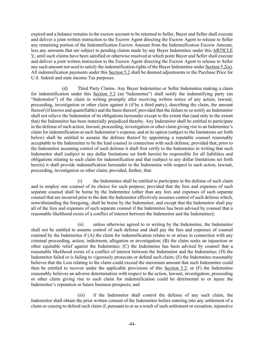-44- expired and a balance remains in the escrow account to be returned to Seller, Buyer and Seller shall execute and deliver a joint written instruction to the Escrow Agent directing the Escrow Agent to release to Seller any remaining portion of the Indemnification Escrow Amount from the Indemnification Escrow Amount, less any amounts that are subject to pending claims made by any Buyer Indemnitee under this ARTICLE V, until such claims have been satisfied or otherwise resolved at which point Buyer and Seller shall execute and deliver a joint written instruction to the Escrow Agent directing the Escrow Agent to release to Seller any such amount not used to satisfy the indemnification rights of the Buyer Indemnitee under Section 5.2(a). All indemnification payments under this Section 5.2 shall be deemed adjustments to the Purchase Price for U.S. federal and state income Tax purposes. (d) Third Party Claims. Any Buyer Indemnitee or Seller Indemnitee making a claim for indemnification under this Section 5.2 (an “Indemnitee”) shall notify the indemnifying party (an “Indemnitor”) of the claim in writing promptly after receiving written notice of any action, lawsuit, proceeding, investigation or other claim against it (if by a third party), describing the claim, the amount thereof (if known and quantifiable) and the basis thereof; provided that the failure to so notify an Indemnitor shall not relieve the Indemnitor of its obligations hereunder except to the extent that (and only to the extent that) the Indemnitor has been materially prejudiced thereby. Any Indemnitor shall be entitled to participate in the defense of such action, lawsuit, proceeding, investigation or other claim giving rise to an Indemnitee’s claim for indemnification at such Indemnitor’s expense, and at its option (subject to the limitations set forth below) shall be entitled to assume the defense thereof by appointing a reputable counsel reasonably acceptable to the Indemnitee to be the lead counsel in connection with such defense; provided that, prior to the Indemnitor assuming control of such defense it shall first verify to the Indemnitee in writing that such Indemnitor shall (subject to any dollar limitations set forth herein) be responsible for all liabilities and obligations relating to such claim for indemnification and that (subject to any dollar limitations set forth herein) it shall provide indemnification hereunder to the Indemnitee with respect to such action, lawsuit, proceeding, investigation or other claim; provided, further, that: (i) the Indemnitee shall be entitled to participate in the defense of such claim and to employ one counsel of its choice for such purpose; provided that the fees and expenses of such separate counsel shall be borne by the Indemnitee (other than any fees and expenses of such separate counsel that are incurred prior to the date the Indemnitor effectively assumes control of such defense which, notwithstanding the foregoing, shall be borne by the Indemnitor, and except that the Indemnitor shall pay all of the fees and expenses of such separate counsel if the Indemnitee has been advised by counsel that a reasonable likelihood exists of a conflict of interest between the Indemnitor and the Indemnitee); (ii) unless otherwise agreed to in writing by the Indemnitee, the Indemnitor shall not be entitled to assume control of such defense and shall pay the fees and expenses of counsel retained by the Indemnitee if (A) the claim for indemnification relates to or arises in connection with any criminal proceeding, action, indictment, allegation or investigation; (B) the claim seeks an injunction or other equitable relief against the Indemnitee; (C) the Indemnitee has been advised by counsel that a reasonable likelihood exists of a conflict of interest between the Indemnitor and the Indemnitee; (D) the Indemnitor failed or is failing to vigorously prosecute or defend such claim; (E) the Indemnitee reasonably believes that the Loss relating to the claim could exceed the maximum amount that such Indemnitee could then be entitled to recover under the applicable provisions of this Section 5.2; or (F) the Indemnitee reasonably believes an adverse determination with respect to the action, lawsuit, investigation, proceeding or other claim giving rise to such claim for indemnification could be detrimental to or injure the Indemnitee’s reputation or future business prospects; and (iii) if the Indemnitor shall control the defense of any such claim, the Indemnitor shall obtain the prior written consent of the Indemnitee before entering into any settlement of a claim or ceasing to defend such claim if, pursuant to or as a result of such settlement or cessation, injunctive