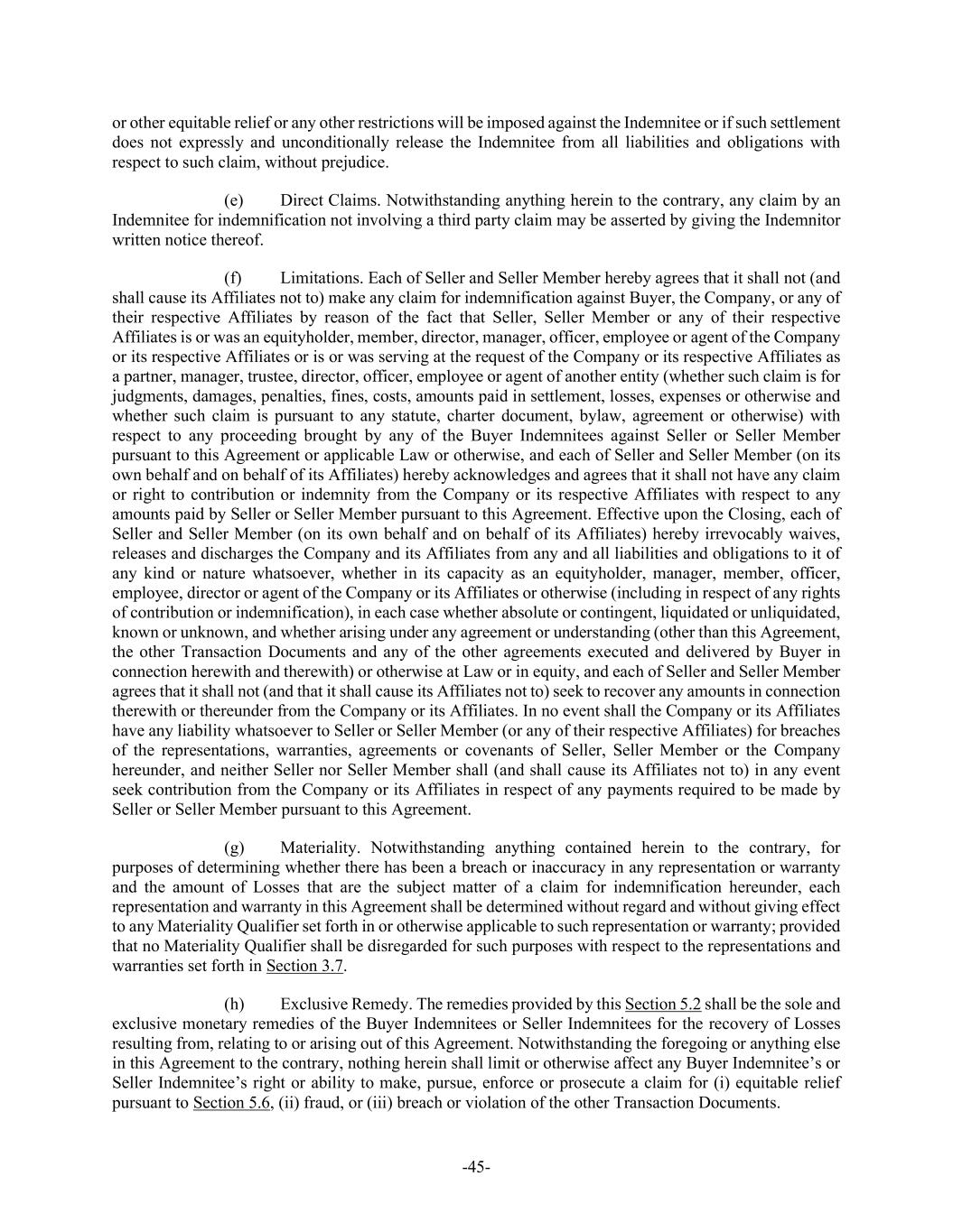 -45- or other equitable relief or any other restrictions will be imposed against the Indemnitee or if such settlement does not expressly and unconditionally release the Indemnitee from all liabilities and obligations with respect to such claim, without prejudice. (e) Direct Claims. Notwithstanding anything herein to the contrary, any claim by an Indemnitee for indemnification not involving a third party claim may be asserted by giving the Indemnitor written notice thereof. (f) Limitations. Each of Seller and Seller Member hereby agrees that it shall not (and shall cause its Affiliates not to) make any claim for indemnification against Buyer, the Company, or any of their respective Affiliates by reason of the fact that Seller, Seller Member or any of their respective Affiliates is or was an equityholder, member, director, manager, officer, employee or agent of the Company or its respective Affiliates or is or was serving at the request of the Company or its respective Affiliates as a partner, manager, trustee, director, officer, employee or agent of another entity (whether such claim is for judgments, damages, penalties, fines, costs, amounts paid in settlement, losses, expenses or otherwise and whether such claim is pursuant to any statute, charter document, bylaw, agreement or otherwise) with respect to any proceeding brought by any of the Buyer Indemnitees against Seller or Seller Member pursuant to this Agreement or applicable Law or otherwise, and each of Seller and Seller Member (on its own behalf and on behalf of its Affiliates) hereby acknowledges and agrees that it shall not have any claim or right to contribution or indemnity from the Company or its respective Affiliates with respect to any amounts paid by Seller or Seller Member pursuant to this Agreement. Effective upon the Closing, each of Seller and Seller Member (on its own behalf and on behalf of its Affiliates) hereby irrevocably waives, releases and discharges the Company and its Affiliates from any and all liabilities and obligations to it of any kind or nature whatsoever, whether in its capacity as an equityholder, manager, member, officer, employee, director or agent of the Company or its Affiliates or otherwise (including in respect of any rights of contribution or indemnification), in each case whether absolute or contingent, liquidated or unliquidated, known or unknown, and whether arising under any agreement or understanding (other than this Agreement, the other Transaction Documents and any of the other agreements executed and delivered by Buyer in connection herewith and therewith) or otherwise at Law or in equity, and each of Seller and Seller Member agrees that it shall not (and that it shall cause its Affiliates not to) seek to recover any amounts in connection therewith or thereunder from the Company or its Affiliates. In no event shall the Company or its Affiliates have any liability whatsoever to Seller or Seller Member (or any of their respective Affiliates) for breaches of the representations, warranties, agreements or covenants of Seller, Seller Member or the Company hereunder, and neither Seller nor Seller Member shall (and shall cause its Affiliates not to) in any event seek contribution from the Company or its Affiliates in respect of any payments required to be made by Seller or Seller Member pursuant to this Agreement. (g) Materiality. Notwithstanding anything contained herein to the contrary, for purposes of determining whether there has been a breach or inaccuracy in any representation or warranty and the amount of Losses that are the subject matter of a claim for indemnification hereunder, each representation and warranty in this Agreement shall be determined without regard and without giving effect to any Materiality Qualifier set forth in or otherwise applicable to such representation or warranty; provided that no Materiality Qualifier shall be disregarded for such purposes with respect to the representations and warranties set forth in Section 3.7. (h) Exclusive Remedy. The remedies provided by this Section 5.2 shall be the sole and exclusive monetary remedies of the Buyer Indemnitees or Seller Indemnitees for the recovery of Losses resulting from, relating to or arising out of this Agreement. Notwithstanding the foregoing or anything else in this Agreement to the contrary, nothing herein shall limit or otherwise affect any Buyer Indemnitee’s or Seller Indemnitee’s right or ability to make, pursue, enforce or prosecute a claim for (i) equitable relief pursuant to Section 5.6, (ii) fraud, or (iii) breach or violation of the other Transaction Documents.