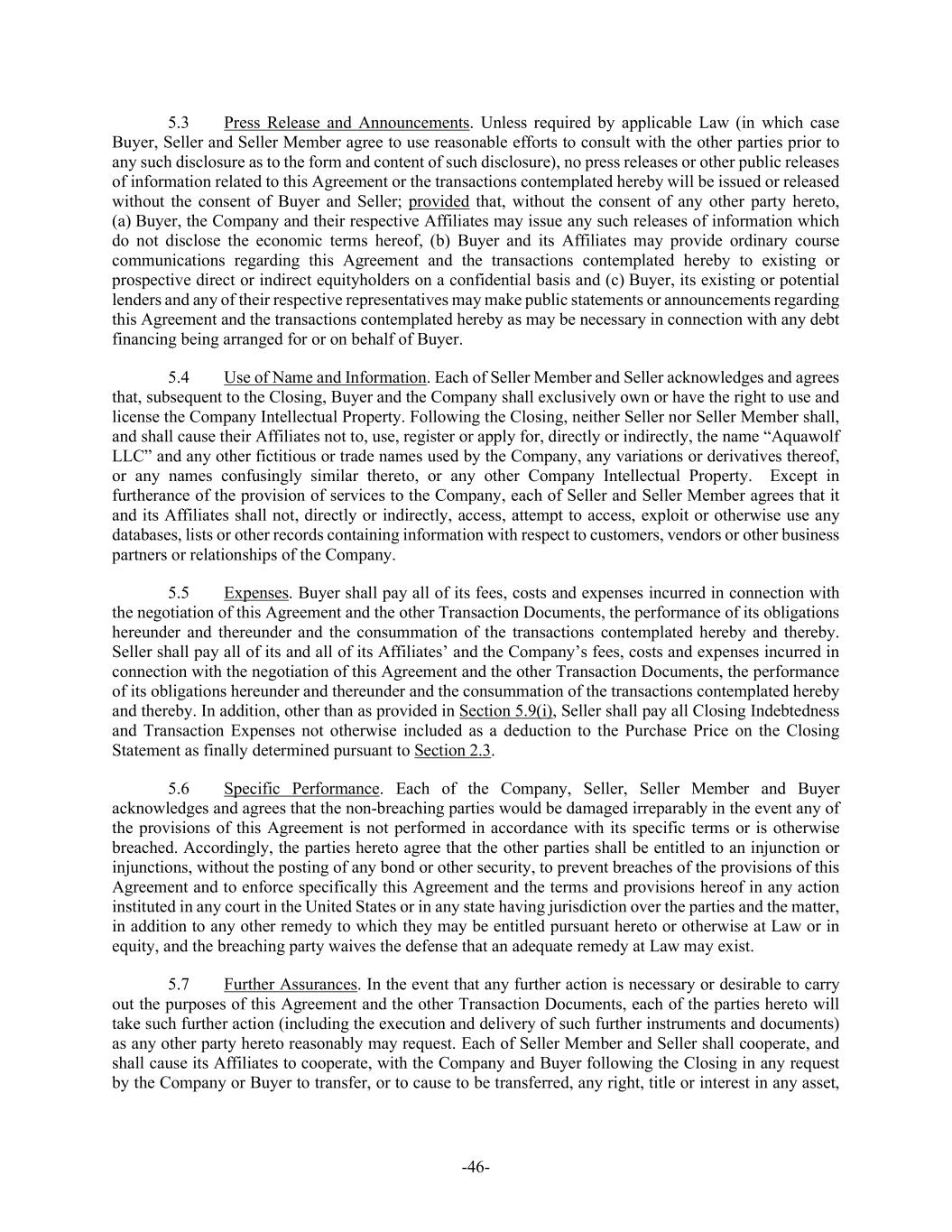 -46- 5.3 Press Release and Announcements. Unless required by applicable Law (in which case Buyer, Seller and Seller Member agree to use reasonable efforts to consult with the other parties prior to any such disclosure as to the form and content of such disclosure), no press releases or other public releases of information related to this Agreement or the transactions contemplated hereby will be issued or released without the consent of Buyer and Seller; provided that, without the consent of any other party hereto, (a) Buyer, the Company and their respective Affiliates may issue any such releases of information which do not disclose the economic terms hereof, (b) Buyer and its Affiliates may provide ordinary course communications regarding this Agreement and the transactions contemplated hereby to existing or prospective direct or indirect equityholders on a confidential basis and (c) Buyer, its existing or potential lenders and any of their respective representatives may make public statements or announcements regarding this Agreement and the transactions contemplated hereby as may be necessary in connection with any debt financing being arranged for or on behalf of Buyer. 5.4 Use of Name and Information. Each of Seller Member and Seller acknowledges and agrees that, subsequent to the Closing, Buyer and the Company shall exclusively own or have the right to use and license the Company Intellectual Property. Following the Closing, neither Seller nor Seller Member shall, and shall cause their Affiliates not to, use, register or apply for, directly or indirectly, the name “Aquawolf LLC” and any other fictitious or trade names used by the Company, any variations or derivatives thereof, or any names confusingly similar thereto, or any other Company Intellectual Property. Except in furtherance of the provision of services to the Company, each of Seller and Seller Member agrees that it and its Affiliates shall not, directly or indirectly, access, attempt to access, exploit or otherwise use any databases, lists or other records containing information with respect to customers, vendors or other business partners or relationships of the Company. 5.5 Expenses. Buyer shall pay all of its fees, costs and expenses incurred in connection with the negotiation of this Agreement and the other Transaction Documents, the performance of its obligations hereunder and thereunder and the consummation of the transactions contemplated hereby and thereby. Seller shall pay all of its and all of its Affiliates’ and the Company’s fees, costs and expenses incurred in connection with the negotiation of this Agreement and the other Transaction Documents, the performance of its obligations hereunder and thereunder and the consummation of the transactions contemplated hereby and thereby. In addition, other than as provided in Section 5.9(i), Seller shall pay all Closing Indebtedness and Transaction Expenses not otherwise included as a deduction to the Purchase Price on the Closing Statement as finally determined pursuant to Section 2.3. 5.6 Specific Performance. Each of the Company, Seller, Seller Member and Buyer acknowledges and agrees that the non-breaching parties would be damaged irreparably in the event any of the provisions of this Agreement is not performed in accordance with its specific terms or is otherwise breached. Accordingly, the parties hereto agree that the other parties shall be entitled to an injunction or injunctions, without the posting of any bond or other security, to prevent breaches of the provisions of this Agreement and to enforce specifically this Agreement and the terms and provisions hereof in any action instituted in any court in the United States or in any state having jurisdiction over the parties and the matter, in addition to any other remedy to which they may be entitled pursuant hereto or otherwise at Law or in equity, and the breaching party waives the defense that an adequate remedy at Law may exist. 5.7 Further Assurances. In the event that any further action is necessary or desirable to carry out the purposes of this Agreement and the other Transaction Documents, each of the parties hereto will take such further action (including the execution and delivery of such further instruments and documents) as any other party hereto reasonably may request. Each of Seller Member and Seller shall cooperate, and shall cause its Affiliates to cooperate, with the Company and Buyer following the Closing in any request by the Company or Buyer to transfer, or to cause to be transferred, any right, title or interest in any asset,