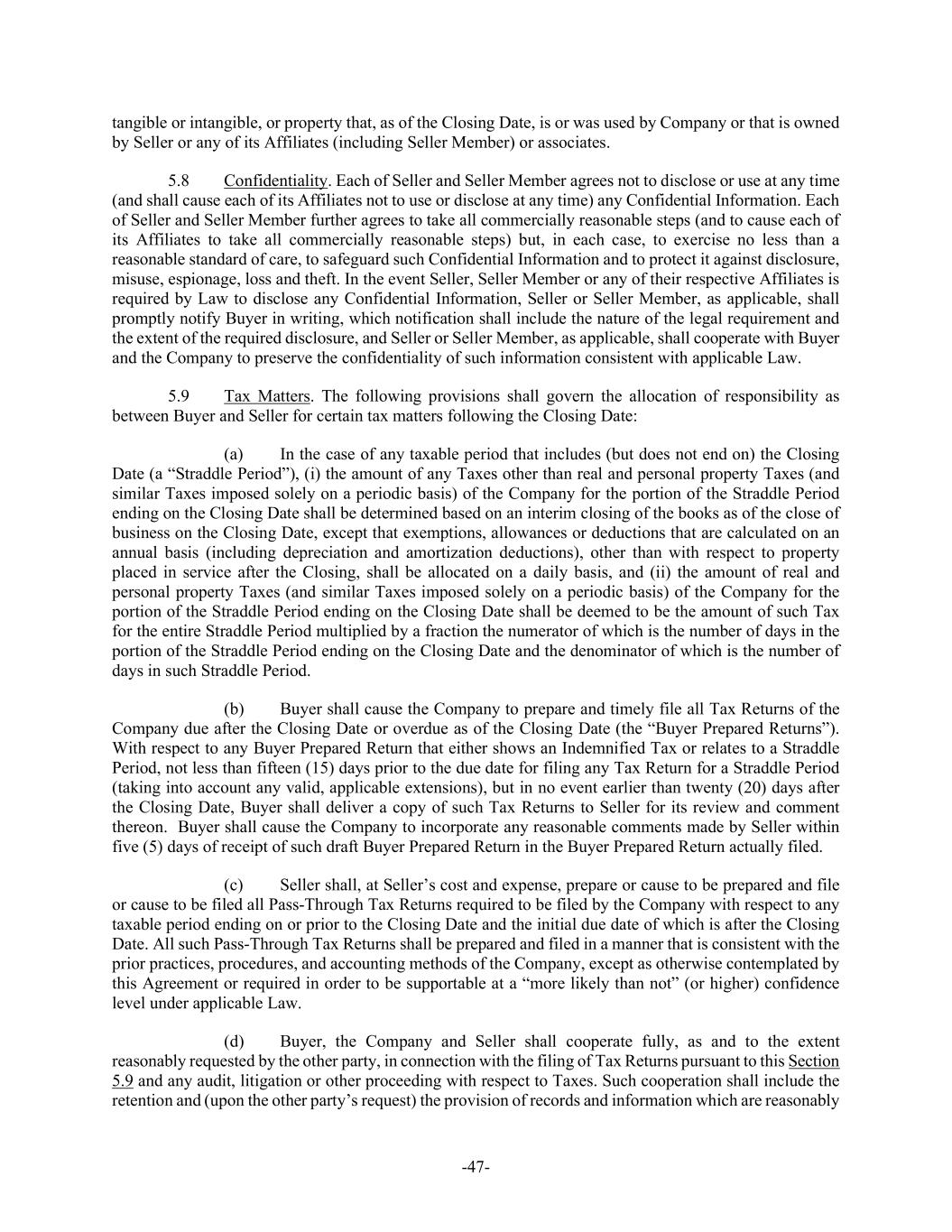 -47- tangible or intangible, or property that, as of the Closing Date, is or was used by Company or that is owned by Seller or any of its Affiliates (including Seller Member) or associates. 5.8 Confidentiality. Each of Seller and Seller Member agrees not to disclose or use at any time (and shall cause each of its Affiliates not to use or disclose at any time) any Confidential Information. Each of Seller and Seller Member further agrees to take all commercially reasonable steps (and to cause each of its Affiliates to take all commercially reasonable steps) but, in each case, to exercise no less than a reasonable standard of care, to safeguard such Confidential Information and to protect it against disclosure, misuse, espionage, loss and theft. In the event Seller, Seller Member or any of their respective Affiliates is required by Law to disclose any Confidential Information, Seller or Seller Member, as applicable, shall promptly notify Buyer in writing, which notification shall include the nature of the legal requirement and the extent of the required disclosure, and Seller or Seller Member, as applicable, shall cooperate with Buyer and the Company to preserve the confidentiality of such information consistent with applicable Law. 5.9 Tax Matters. The following provisions shall govern the allocation of responsibility as between Buyer and Seller for certain tax matters following the Closing Date: (a) In the case of any taxable period that includes (but does not end on) the Closing Date (a “Straddle Period”), (i) the amount of any Taxes other than real and personal property Taxes (and similar Taxes imposed solely on a periodic basis) of the Company for the portion of the Straddle Period ending on the Closing Date shall be determined based on an interim closing of the books as of the close of business on the Closing Date, except that exemptions, allowances or deductions that are calculated on an annual basis (including depreciation and amortization deductions), other than with respect to property placed in service after the Closing, shall be allocated on a daily basis, and (ii) the amount of real and personal property Taxes (and similar Taxes imposed solely on a periodic basis) of the Company for the portion of the Straddle Period ending on the Closing Date shall be deemed to be the amount of such Tax for the entire Straddle Period multiplied by a fraction the numerator of which is the number of days in the portion of the Straddle Period ending on the Closing Date and the denominator of which is the number of days in such Straddle Period. (b) Buyer shall cause the Company to prepare and timely file all Tax Returns of the Company due after the Closing Date or overdue as of the Closing Date (the “Buyer Prepared Returns”). With respect to any Buyer Prepared Return that either shows an Indemnified Tax or relates to a Straddle Period, not less than fifteen (15) days prior to the due date for filing any Tax Return for a Straddle Period (taking into account any valid, applicable extensions), but in no event earlier than twenty (20) days after the Closing Date, Buyer shall deliver a copy of such Tax Returns to Seller for its review and comment thereon. Buyer shall cause the Company to incorporate any reasonable comments made by Seller within five (5) days of receipt of such draft Buyer Prepared Return in the Buyer Prepared Return actually filed. (c) Seller shall, at Seller’s cost and expense, prepare or cause to be prepared and file or cause to be filed all Pass-Through Tax Returns required to be filed by the Company with respect to any taxable period ending on or prior to the Closing Date and the initial due date of which is after the Closing Date. All such Pass-Through Tax Returns shall be prepared and filed in a manner that is consistent with the prior practices, procedures, and accounting methods of the Company, except as otherwise contemplated by this Agreement or required in order to be supportable at a “more likely than not” (or higher) confidence level under applicable Law. (d) Buyer, the Company and Seller shall cooperate fully, as and to the extent reasonably requested by the other party, in connection with the filing of Tax Returns pursuant to this Section 5.9 and any audit, litigation or other proceeding with respect to Taxes. Such cooperation shall include the retention and (upon the other party’s request) the provision of records and information which are reasonably