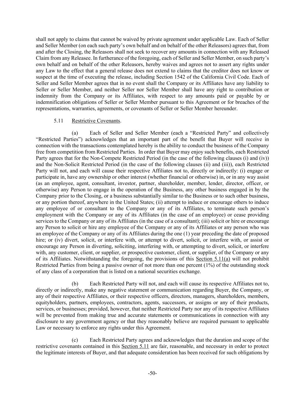 -50- shall not apply to claims that cannot be waived by private agreement under applicable Law. Each of Seller and Seller Member (on each such party’s own behalf and on behalf of the other Releasors) agrees that, from and after the Closing, the Releasors shall not seek to recover any amounts in connection with any Released Claim from any Releasee. In furtherance of the foregoing, each of Seller and Seller Member, on such party’s own behalf and on behalf of the other Releasors, hereby waives and agrees not to assert any rights under any Law to the effect that a general release does not extend to claims that the creditor does not know or suspect at the time of executing the release, including Section 1542 of the California Civil Code. Each of Seller and Seller Member agrees that in no event shall the Company or its Affiliates have any liability to Seller or Seller Member, and neither Seller nor Seller Member shall have any right to contribution or indemnity from the Company or its Affiliates, with respect to any amounts paid or payable by or indemnification obligations of Seller or Seller Member pursuant to this Agreement or for breaches of the representations, warranties, agreements, or covenants of Seller or Seller Member hereunder. 5.11 Restrictive Covenants. (a) Each of Seller and Seller Member (each a “Restricted Party” and collectively “Restricted Parties”) acknowledges that an important part of the benefit that Buyer will receive in connection with the transactions contemplated hereby is the ability to conduct the business of the Company free from competition from Restricted Parties. In order that Buyer may enjoy such benefits, each Restricted Party agrees that for the Non-Compete Restricted Period (in the case of the following clauses (i) and (iv)) and the Non-Solicit Restricted Period (in the case of the following clauses (ii) and (iii)), each Restricted Party will not, and each will cause their respective Affiliates not to, directly or indirectly: (i) engage or participate in, have any ownership or other interest (whether financial or otherwise) in, or in any way assist (as an employee, agent, consultant, investor, partner, shareholder, member, lender, director, officer, or otherwise) any Person to engage in the operation of the Business, any other business engaged in by the Company prior to the Closing, or a business substantially similar to the Business or to such other business, or any portion thereof, anywhere in the United States; (ii) attempt to induce or encourage others to induce any employee of or consultant to the Company or any of its Affiliates, to terminate such person’s employment with the Company or any of its Affiliates (in the case of an employee) or cease providing services to the Company or any of its Affiliates (in the case of a consultant); (iii) solicit or hire or encourage any Person to solicit or hire any employee of the Company or any of its Affiliates or any person who was an employee of the Company or any of its Affiliates during the one (1) year preceding the date of proposed hire; or (iv) divert, solicit, or interfere with, or attempt to divert, solicit, or interfere with, or assist or encourage any Person in diverting, soliciting, interfering with, or attempting to divert, solicit, or interfere with, any customer, client, or supplier, or prospective customer, client, or supplier, of the Company or any of its Affiliates. Notwithstanding the foregoing, the provisions of this Section 5.11(a) will not prohibit Restricted Parties from being a passive owner of not more than one percent (1%) of the outstanding stock of any class of a corporation that is listed on a national securities exchange. (b) Each Restricted Party will not, and each will cause its respective Affiliates not to, directly or indirectly, make any negative statement or communication regarding Buyer, the Company, or any of their respective Affiliates, or their respective officers, directors, managers, shareholders, members, equityholders, partners, employees, contractors, agents, successors, or assigns or any of their products, services, or businesses; provided, however, that neither Restricted Party nor any of its respective Affiliates will be prevented from making true and accurate statements or communications in connection with any disclosure to any government agency or that they reasonably believe are required pursuant to applicable Law or necessary to enforce any rights under this Agreement. (c) Each Restricted Party agrees and acknowledges that the duration and scope of the restrictive covenants contained in this Section 5.11 are fair, reasonable, and necessary in order to protect the legitimate interests of Buyer, and that adequate consideration has been received for such obligations by