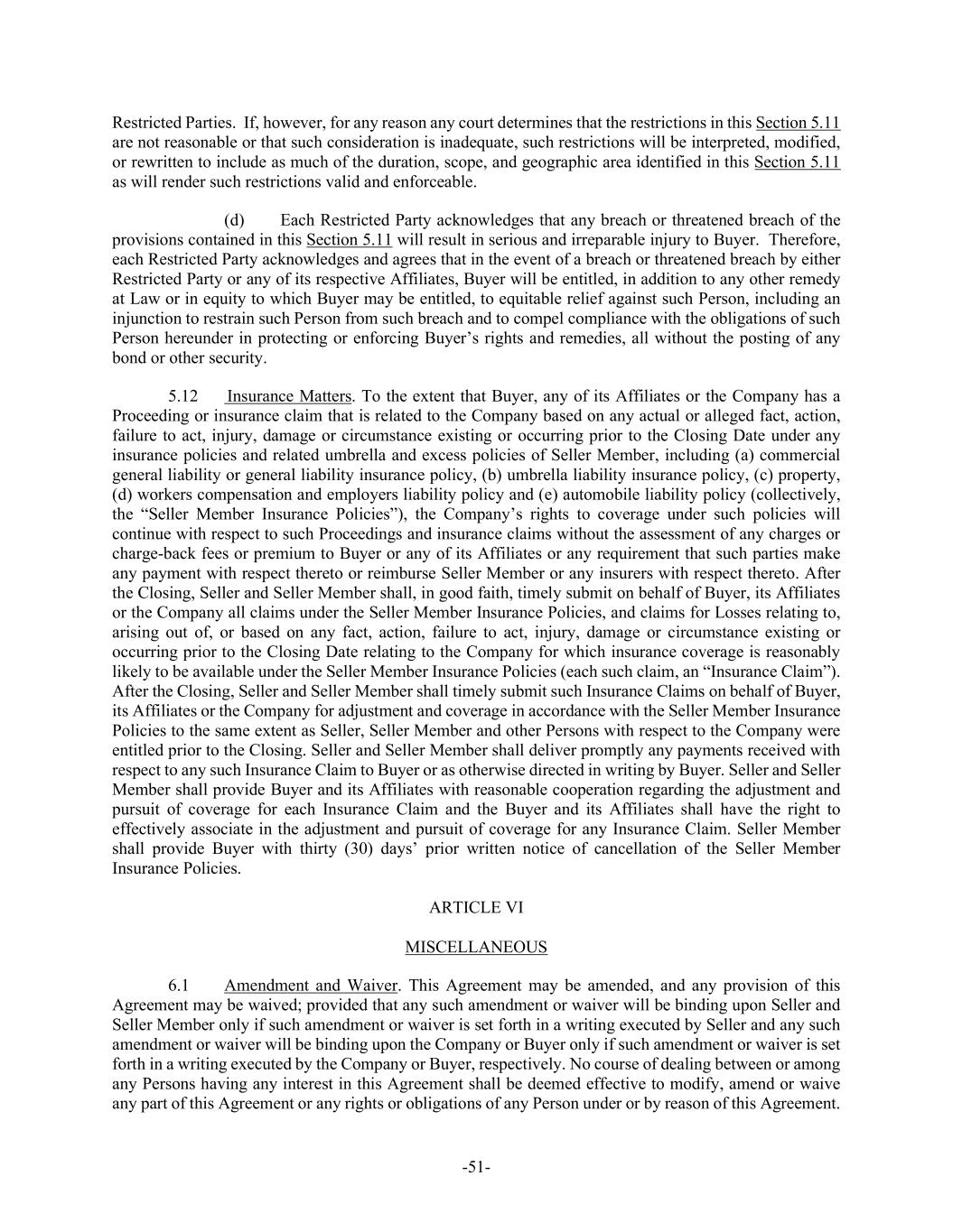 -51- Restricted Parties. If, however, for any reason any court determines that the restrictions in this Section 5.11 are not reasonable or that such consideration is inadequate, such restrictions will be interpreted, modified, or rewritten to include as much of the duration, scope, and geographic area identified in this Section 5.11 as will render such restrictions valid and enforceable. (d) Each Restricted Party acknowledges that any breach or threatened breach of the provisions contained in this Section 5.11 will result in serious and irreparable injury to Buyer. Therefore, each Restricted Party acknowledges and agrees that in the event of a breach or threatened breach by either Restricted Party or any of its respective Affiliates, Buyer will be entitled, in addition to any other remedy at Law or in equity to which Buyer may be entitled, to equitable relief against such Person, including an injunction to restrain such Person from such breach and to compel compliance with the obligations of such Person hereunder in protecting or enforcing Buyer’s rights and remedies, all without the posting of any bond or other security. 5.12 Insurance Matters. To the extent that Buyer, any of its Affiliates or the Company has a Proceeding or insurance claim that is related to the Company based on any actual or alleged fact, action, failure to act, injury, damage or circumstance existing or occurring prior to the Closing Date under any insurance policies and related umbrella and excess policies of Seller Member, including (a) commercial general liability or general liability insurance policy, (b) umbrella liability insurance policy, (c) property, (d) workers compensation and employers liability policy and (e) automobile liability policy (collectively, the “Seller Member Insurance Policies”), the Company’s rights to coverage under such policies will continue with respect to such Proceedings and insurance claims without the assessment of any charges or charge-back fees or premium to Buyer or any of its Affiliates or any requirement that such parties make any payment with respect thereto or reimburse Seller Member or any insurers with respect thereto. After the Closing, Seller and Seller Member shall, in good faith, timely submit on behalf of Buyer, its Affiliates or the Company all claims under the Seller Member Insurance Policies, and claims for Losses relating to, arising out of, or based on any fact, action, failure to act, injury, damage or circumstance existing or occurring prior to the Closing Date relating to the Company for which insurance coverage is reasonably likely to be available under the Seller Member Insurance Policies (each such claim, an “Insurance Claim”). After the Closing, Seller and Seller Member shall timely submit such Insurance Claims on behalf of Buyer, its Affiliates or the Company for adjustment and coverage in accordance with the Seller Member Insurance Policies to the same extent as Seller, Seller Member and other Persons with respect to the Company were entitled prior to the Closing. Seller and Seller Member shall deliver promptly any payments received with respect to any such Insurance Claim to Buyer or as otherwise directed in writing by Buyer. Seller and Seller Member shall provide Buyer and its Affiliates with reasonable cooperation regarding the adjustment and pursuit of coverage for each Insurance Claim and the Buyer and its Affiliates shall have the right to effectively associate in the adjustment and pursuit of coverage for any Insurance Claim. Seller Member shall provide Buyer with thirty (30) days’ prior written notice of cancellation of the Seller Member Insurance Policies. ARTICLE VI MISCELLANEOUS 6.1 Amendment and Waiver. This Agreement may be amended, and any provision of this Agreement may be waived; provided that any such amendment or waiver will be binding upon Seller and Seller Member only if such amendment or waiver is set forth in a writing executed by Seller and any such amendment or waiver will be binding upon the Company or Buyer only if such amendment or waiver is set forth in a writing executed by the Company or Buyer, respectively. No course of dealing between or among any Persons having any interest in this Agreement shall be deemed effective to modify, amend or waive any part of this Agreement or any rights or obligations of any Person under or by reason of this Agreement.
