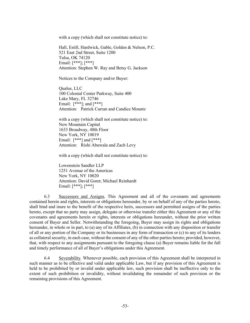 -53- with a copy (which shall not constitute notice) to: Hall, Estill, Hardwick, Gable, Golden & Nelson, P.C. 521 East 2nd Street, Suite 1200 Tulsa, OK 74120 Email: [***]; [***] Attention: Stephen W. Ray and Betsy G. Jackson Notices to the Company and/or Buyer: Qualus, LLC 100 Colonial Center Parkway, Suite 400 Lake Mary, FL 32746 Email: [***]; and [***] Attention: Patrick Curran and Candice Mountz with a copy (which shall not constitute notice) to: New Mountain Capital 1633 Broadway, 48th Floor New York, NY 10019 Email: [***] and [***] Attention: Rishi Abuwala and Zach Levy with a copy (which shall not constitute notice) to: Lowenstein Sandler LLP 1251 Avenue of the Americas New York, NY 10020 Attention: David Goret; Michael Reinhardt Email: [***]; [***] 6.3 Successors and Assigns. This Agreement and all of the covenants and agreements contained herein and rights, interests or obligations hereunder, by or on behalf of any of the parties hereto, shall bind and inure to the benefit of the respective heirs, successors and permitted assigns of the parties hereto, except that no party may assign, delegate or otherwise transfer either this Agreement or any of the covenants and agreements herein or rights, interests or obligations hereunder, without the prior written consent of Buyer and Seller. Notwithstanding the foregoing, Buyer may assign its rights and obligations hereunder, in whole or in part, to (a) any of its Affiliates, (b) in connection with any disposition or transfer of all or any portion of the Company or its businesses in any form of transaction or (c) to any of its lenders as collateral security, in each case, without the consent of any of the other parties hereto; provided, however, that, with respect to any assignments pursuant to the foregoing clause (a) Buyer remains liable for the full and timely performance of all of Buyer’s obligations under this Agreement. 6.4 Severability. Whenever possible, each provision of this Agreement shall be interpreted in such manner as to be effective and valid under applicable Law, but if any provision of this Agreement is held to be prohibited by or invalid under applicable law, such provision shall be ineffective only to the extent of such prohibition or invalidity, without invalidating the remainder of such provision or the remaining provisions of this Agreement.