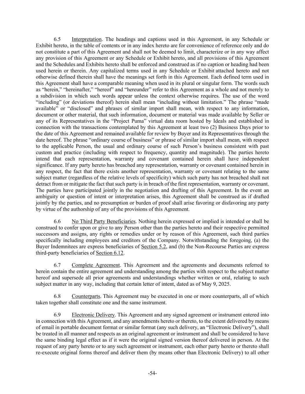 -54- 6.5 Interpretation. The headings and captions used in this Agreement, in any Schedule or Exhibit hereto, in the table of contents or in any index hereto are for convenience of reference only and do not constitute a part of this Agreement and shall not be deemed to limit, characterize or in any way affect any provision of this Agreement or any Schedule or Exhibit hereto, and all provisions of this Agreement and the Schedules and Exhibits hereto shall be enforced and construed as if no caption or heading had been used herein or therein. Any capitalized terms used in any Schedule or Exhibit attached hereto and not otherwise defined therein shall have the meanings set forth in this Agreement. Each defined term used in this Agreement shall have a comparable meaning when used in its plural or singular form. The words such as “herein,” “hereinafter,” “hereof” and “hereunder” refer to this Agreement as a whole and not merely to a subdivision in which such words appear unless the context otherwise requires. The use of the word “including” (or deviations thereof) herein shall mean “including without limitation.” The phrase “made available” or “disclosed” and phrases of similar import shall mean, with respect to any information, document or other material, that such information, document or material was made available by Seller or any of its Representatives in the “Project Puma” virtual data room hosted by Ideals and established in connection with the transactions contemplated by this Agreement at least two (2) Business Days prior to the date of this Agreement and remained available for review by Buyer and its Representatives through the date hereof. The phrase “ordinary course of business” or phrase of similar import shall mean, with respect to the applicable Person, the usual and ordinary course of such Person’s business consistent with past custom and practice (including with respect to frequency, quantity and magnitude). The parties hereto intend that each representation, warranty and covenant contained herein shall have independent significance. If any party hereto has breached any representation, warranty or covenant contained herein in any respect, the fact that there exists another representation, warranty or covenant relating to the same subject matter (regardless of the relative levels of specificity) which such party has not breached shall not detract from or mitigate the fact that such party is in breach of the first representation, warranty or covenant. The parties have participated jointly in the negotiation and drafting of this Agreement. In the event an ambiguity or question of intent or interpretation arises, this Agreement shall be construed as if drafted jointly by the parties, and no presumption or burden of proof shall arise favoring or disfavoring any party by virtue of the authorship of any of the provisions of this Agreement. 6.6 No Third Party Beneficiaries. Nothing herein expressed or implied is intended or shall be construed to confer upon or give to any Person other than the parties hereto and their respective permitted successors and assigns, any rights or remedies under or by reason of this Agreement, such third parties specifically including employees and creditors of the Company. Notwithstanding the foregoing, (a) the Buyer Indemnitees are express beneficiaries of Section 5.2, and (b) the Non-Recourse Parties are express third-party beneficiaries of Section 6.12. 6.7 Complete Agreement. This Agreement and the agreements and documents referred to herein contain the entire agreement and understanding among the parties with respect to the subject matter hereof and supersede all prior agreements and understandings whether written or oral, relating to such subject matter in any way, including that certain letter of intent, dated as of May 9, 2025. 6.8 Counterparts. This Agreement may be executed in one or more counterparts, all of which taken together shall constitute one and the same instrument. 6.9 Electronic Delivery. This Agreement and any signed agreement or instrument entered into in connection with this Agreement, and any amendments hereto or thereto, to the extent delivered by means of email in portable document format or similar format (any such delivery, an “Electronic Delivery”), shall be treated in all manner and respects as an original agreement or instrument and shall be considered to have the same binding legal effect as if it were the original signed version thereof delivered in person. At the request of any party hereto or to any such agreement or instrument, each other party hereto or thereto shall re-execute original forms thereof and deliver them (by means other than Electronic Delivery) to all other