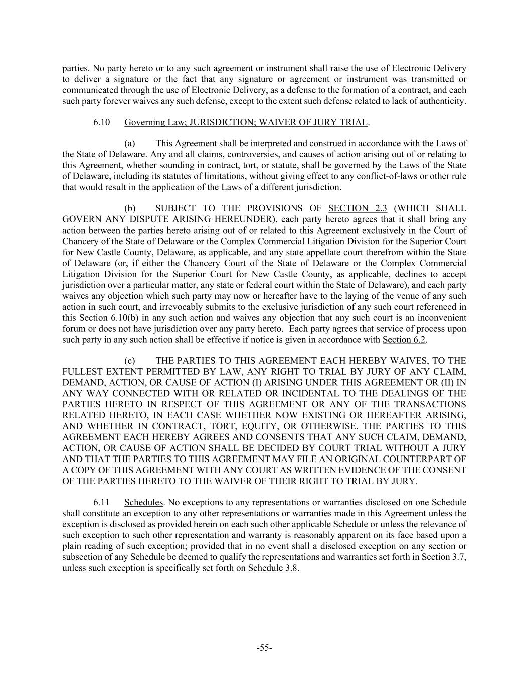 -55- parties. No party hereto or to any such agreement or instrument shall raise the use of Electronic Delivery to deliver a signature or the fact that any signature or agreement or instrument was transmitted or communicated through the use of Electronic Delivery, as a defense to the formation of a contract, and each such party forever waives any such defense, except to the extent such defense related to lack of authenticity. 6.10 Governing Law; JURISDICTION; WAIVER OF JURY TRIAL. (a) This Agreement shall be interpreted and construed in accordance with the Laws of the State of Delaware. Any and all claims, controversies, and causes of action arising out of or relating to this Agreement, whether sounding in contract, tort, or statute, shall be governed by the Laws of the State of Delaware, including its statutes of limitations, without giving effect to any conflict-of-laws or other rule that would result in the application of the Laws of a different jurisdiction. (b) SUBJECT TO THE PROVISIONS OF SECTION 2.3 (WHICH SHALL GOVERN ANY DISPUTE ARISING HEREUNDER), each party hereto agrees that it shall bring any action between the parties hereto arising out of or related to this Agreement exclusively in the Court of Chancery of the State of Delaware or the Complex Commercial Litigation Division for the Superior Court for New Castle County, Delaware, as applicable, and any state appellate court therefrom within the State of Delaware (or, if either the Chancery Court of the State of Delaware or the Complex Commercial Litigation Division for the Superior Court for New Castle County, as applicable, declines to accept jurisdiction over a particular matter, any state or federal court within the State of Delaware), and each party waives any objection which such party may now or hereafter have to the laying of the venue of any such action in such court, and irrevocably submits to the exclusive jurisdiction of any such court referenced in this Section 6.10(b) in any such action and waives any objection that any such court is an inconvenient forum or does not have jurisdiction over any party hereto. Each party agrees that service of process upon such party in any such action shall be effective if notice is given in accordance with Section 6.2. (c) THE PARTIES TO THIS AGREEMENT EACH HEREBY WAIVES, TO THE FULLEST EXTENT PERMITTED BY LAW, ANY RIGHT TO TRIAL BY JURY OF ANY CLAIM, DEMAND, ACTION, OR CAUSE OF ACTION (I) ARISING UNDER THIS AGREEMENT OR (II) IN ANY WAY CONNECTED WITH OR RELATED OR INCIDENTAL TO THE DEALINGS OF THE PARTIES HERETO IN RESPECT OF THIS AGREEMENT OR ANY OF THE TRANSACTIONS RELATED HERETO, IN EACH CASE WHETHER NOW EXISTING OR HEREAFTER ARISING, AND WHETHER IN CONTRACT, TORT, EQUITY, OR OTHERWISE. THE PARTIES TO THIS AGREEMENT EACH HEREBY AGREES AND CONSENTS THAT ANY SUCH CLAIM, DEMAND, ACTION, OR CAUSE OF ACTION SHALL BE DECIDED BY COURT TRIAL WITHOUT A JURY AND THAT THE PARTIES TO THIS AGREEMENT MAY FILE AN ORIGINAL COUNTERPART OF A COPY OF THIS AGREEMENT WITH ANY COURT AS WRITTEN EVIDENCE OF THE CONSENT OF THE PARTIES HERETO TO THE WAIVER OF THEIR RIGHT TO TRIAL BY JURY. 6.11 Schedules. No exceptions to any representations or warranties disclosed on one Schedule shall constitute an exception to any other representations or warranties made in this Agreement unless the exception is disclosed as provided herein on each such other applicable Schedule or unless the relevance of such exception to such other representation and warranty is reasonably apparent on its face based upon a plain reading of such exception; provided that in no event shall a disclosed exception on any section or subsection of any Schedule be deemed to qualify the representations and warranties set forth in Section 3.7, unless such exception is specifically set forth on Schedule 3.8.
