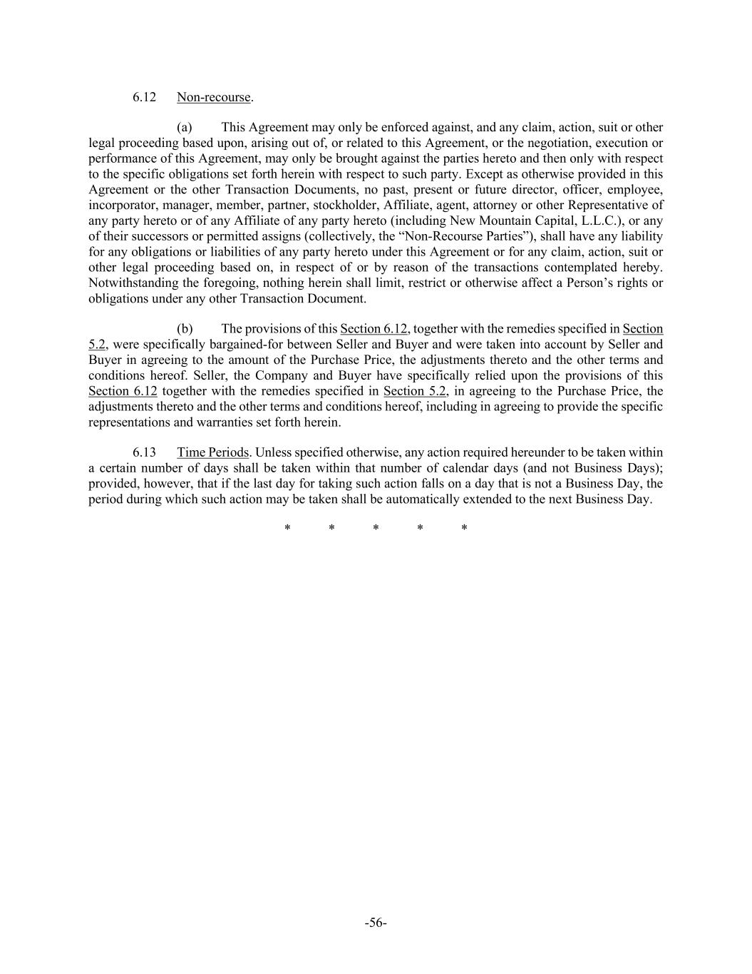 -56- 6.12 Non-recourse. (a) This Agreement may only be enforced against, and any claim, action, suit or other legal proceeding based upon, arising out of, or related to this Agreement, or the negotiation, execution or performance of this Agreement, may only be brought against the parties hereto and then only with respect to the specific obligations set forth herein with respect to such party. Except as otherwise provided in this Agreement or the other Transaction Documents, no past, present or future director, officer, employee, incorporator, manager, member, partner, stockholder, Affiliate, agent, attorney or other Representative of any party hereto or of any Affiliate of any party hereto (including New Mountain Capital, L.L.C.), or any of their successors or permitted assigns (collectively, the “Non-Recourse Parties”), shall have any liability for any obligations or liabilities of any party hereto under this Agreement or for any claim, action, suit or other legal proceeding based on, in respect of or by reason of the transactions contemplated hereby. Notwithstanding the foregoing, nothing herein shall limit, restrict or otherwise affect a Person’s rights or obligations under any other Transaction Document. (b) The provisions of this Section 6.12, together with the remedies specified in Section 5.2, were specifically bargained-for between Seller and Buyer and were taken into account by Seller and Buyer in agreeing to the amount of the Purchase Price, the adjustments thereto and the other terms and conditions hereof. Seller, the Company and Buyer have specifically relied upon the provisions of this Section 6.12 together with the remedies specified in Section 5.2, in agreeing to the Purchase Price, the adjustments thereto and the other terms and conditions hereof, including in agreeing to provide the specific representations and warranties set forth herein. 6.13 Time Periods. Unless specified otherwise, any action required hereunder to be taken within a certain number of days shall be taken within that number of calendar days (and not Business Days); provided, however, that if the last day for taking such action falls on a day that is not a Business Day, the period during which such action may be taken shall be automatically extended to the next Business Day. * * * * *