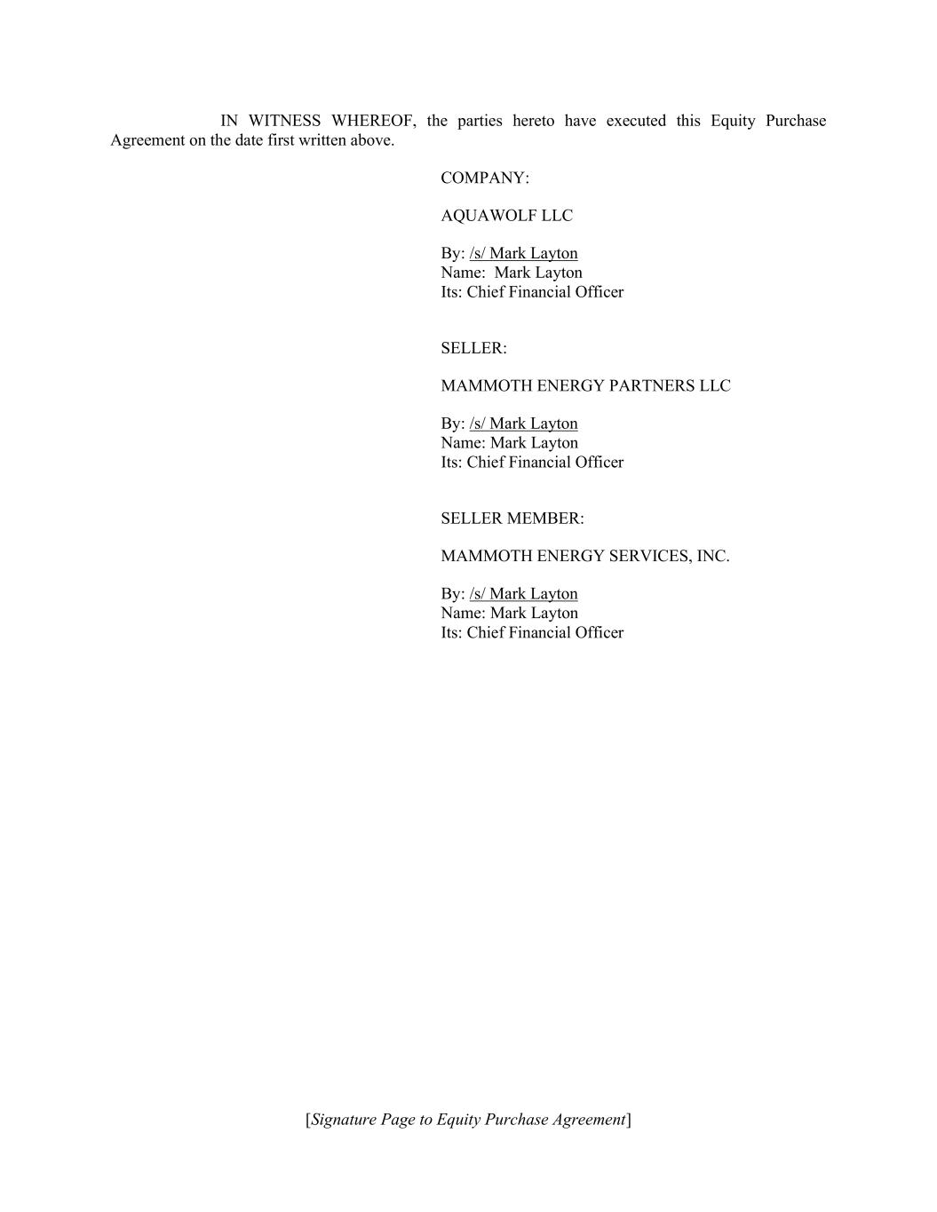 [Signature Page to Equity Purchase Agreement] IN WITNESS WHEREOF, the parties hereto have executed this Equity Purchase Agreement on the date first written above. COMPANY: AQUAWOLF LLC By: /s/ Mark Layton Name: Mark Layton Its: Chief Financial Officer SELLER: MAMMOTH ENERGY PARTNERS LLC By: /s/ Mark Layton Name: Mark Layton Its: Chief Financial Officer SELLER MEMBER: MAMMOTH ENERGY SERVICES, INC. By: /s/ Mark Layton Name: Mark Layton Its: Chief Financial Officer