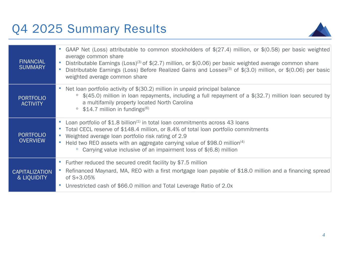 $(0.06) Distributable Earnings (Loss)(3) Before Realized Gains and Losses per Basic Wtd. Avg. Common Share Q4'25 SUMMARY RESULTSINVESTMENT PORTFOL IO 3 $1.8B(1) Total Loan Portfolio Commitments Across 43 loan Investments 100% Loans 99% Senior Loans 97% Floating Rate 65.0% Weighted Average Stabilized LTV at Origination ~63% Non-Mark-to- Market Borrowings 2.0x Total Leverage Ratio $1.7B Total Financing Capacity with $1.2B Outstanding $66.0 million Unrestricted Cash Balance; Held $98.0 million in REO(4) $39.3 million Average Unpaid Principal Balance Company Overview CAP ITAL IZAT ION $(0.06) Distributable Earnings (Loss)(3) per Basic Wtd. Avg. Common Share 8.3% Annualized Dividend Yield(5) $0.05 Dividend per Share $(0.58) GAAP Net (Loss)(2) per Basic Wtd. Avg. Common Share $148.4 million allowance for credit losses, or 8.4% of portfolio commitments, of which 70.4%, or $104.5 million, is allocated to specific CECL reserves $1.7B financing capacity with $1.2B outstanding, including $0.5B across four facilities, $0.6B in non-recourse and non- mark-to-market borrowings from two CLOs $7.29 Book Value per Common Share An internally managed commercial real estate finance company operating as a REIT, focused on originating and investing in floating-rate, first mortgage loans secured by institutional-quality transitional properties. Conservatively managed balance sheet with a granular investment portfolio and a well-balanced funding profile