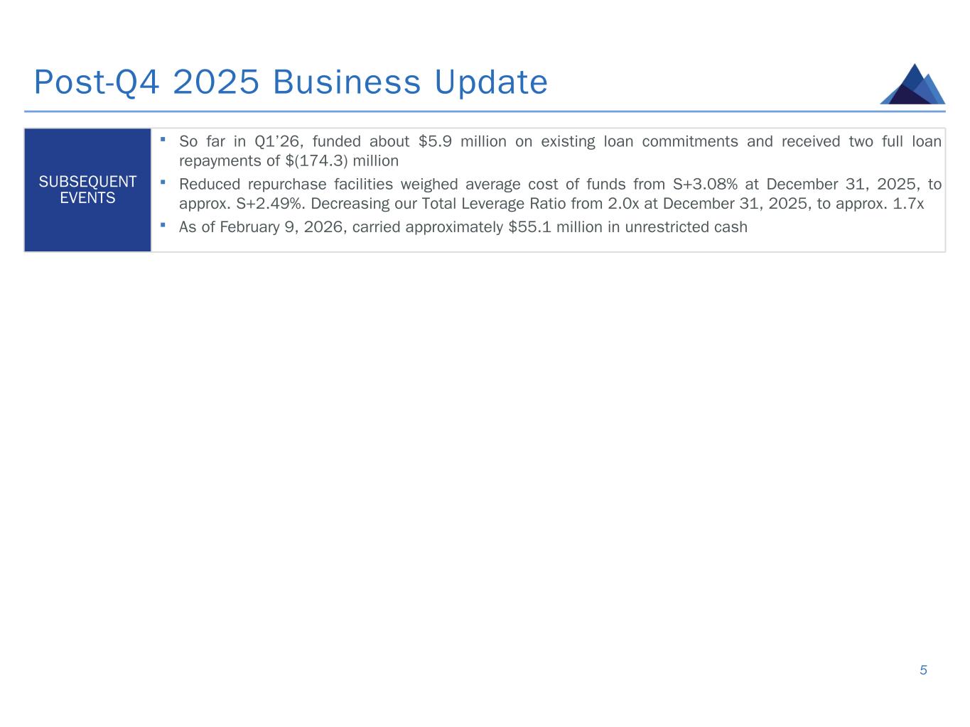 FINANCIAL SUMMARY ▪ GAAP Net (Loss) attributable to common stockholders of $(27.4) million, or $(0.58) per basic weighted average common share ▪ Distributable Earnings (Loss)(3) of $(2.7) million, or $(0.06) per basic weighted average common share ▪ Distributable Earnings (Loss) Before Realized Gains and Losses(3) of $(3.0) million, or $(0.06) per basic weighted average common share PORTFOLIO ACTIVITY ▪ Net loan portfolio activity of $(30.2) million in unpaid principal balance ◦ $(45.0) million in loan repayments, including a full repayment of a $(32.7) million loan secured by a multifamily property located North Carolina ◦ $14.7 million in fundings(6) PORTFOLIO OVERVIEW ▪ Loan portfolio of $1.8 billion(1) in total loan commitments across 43 loans ▪ Total CECL reserve of $148.4 million, or 8.4% of total loan portfolio commitments ▪ Weighted average loan portfolio risk rating of 2.9 ▪ Held two REO assets with an aggregate carrying value of $98.0 million(4) ◦ Carrying value inclusive of an impairment loss of $(6.8) million CAPITALIZATION & LIQUIDITY ▪ Further reduced the secured credit facility by $7.5 million ▪ Refinanced Maynard, MA, REO with a first mortgage loan payable of $18.0 million and a financing spread of S+3.05% ▪ Unrestricted cash of $66.0 million and Total Leverage Ratio of 2.0x Q4 2025 Summary Results 4